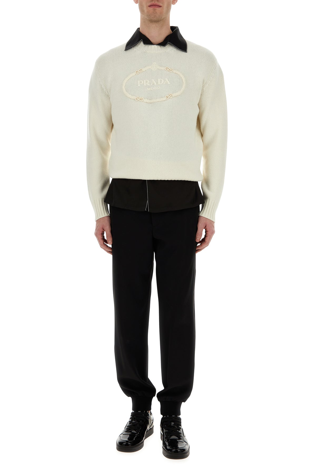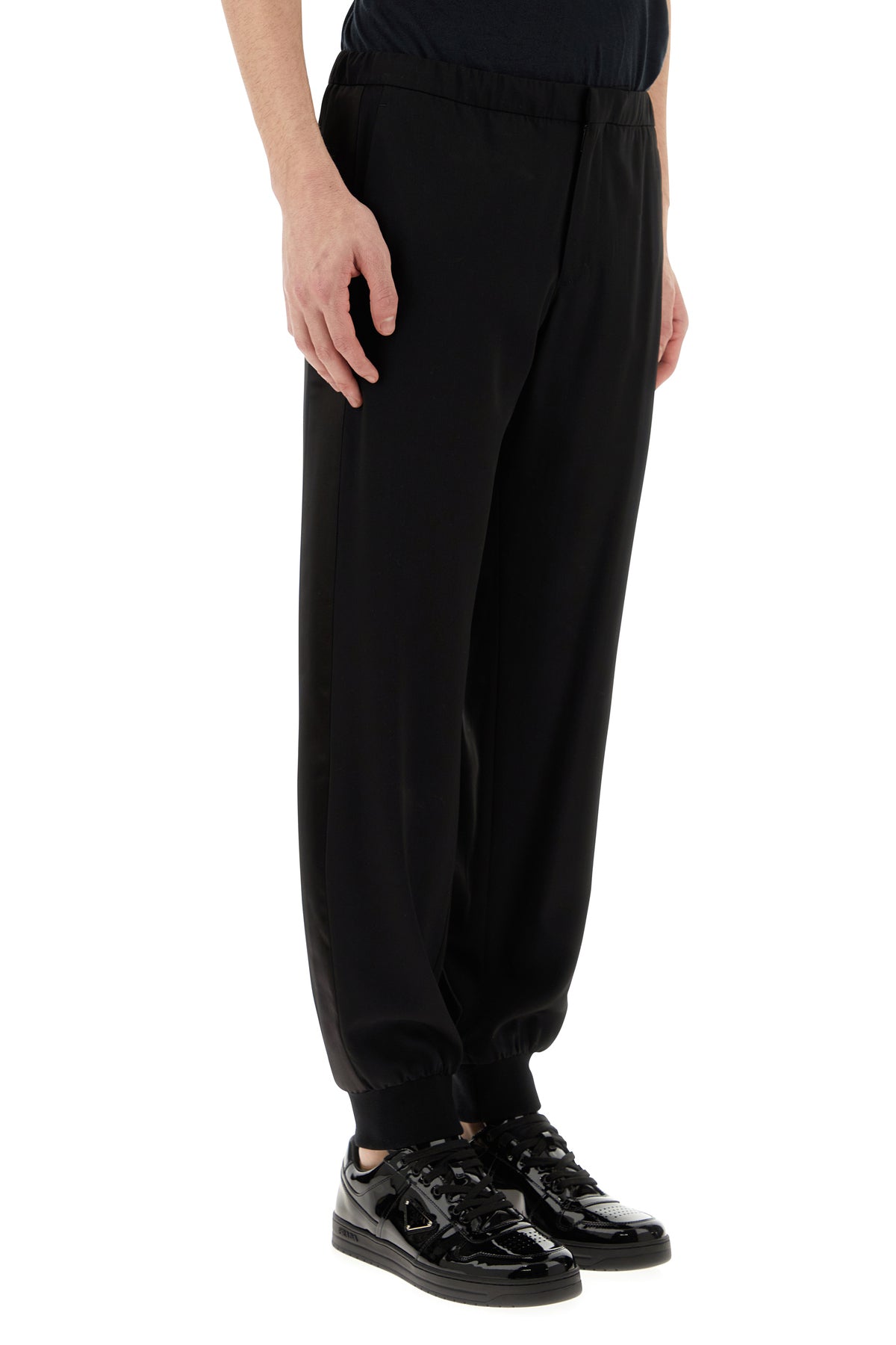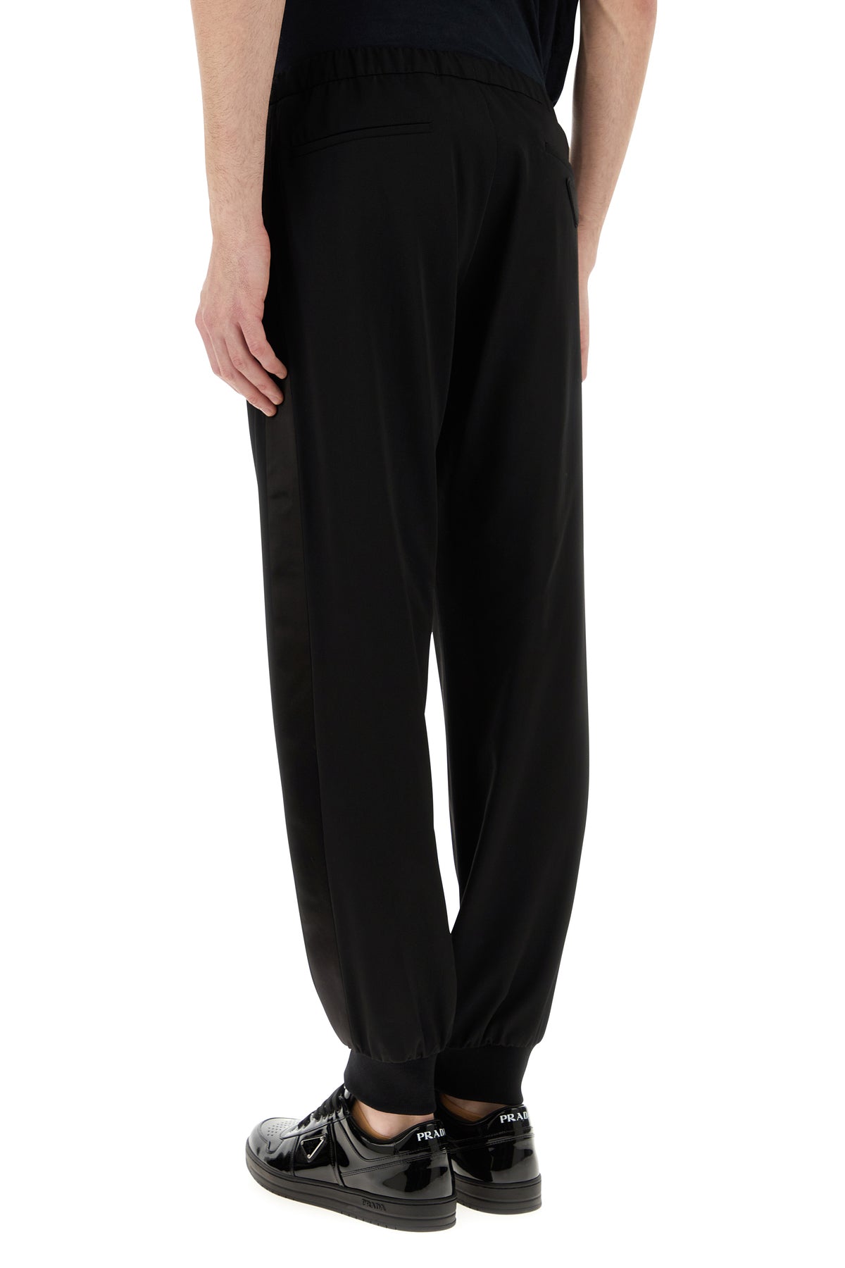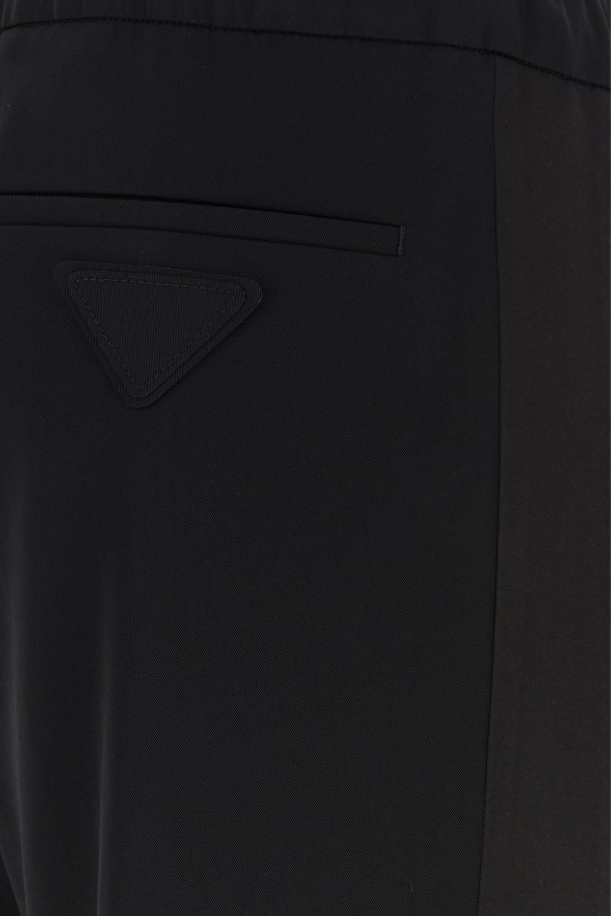 Pant realized in pure wool gabardine with tonal satin bands on the sides enriched by tonal fabric iconic triangle at the back.