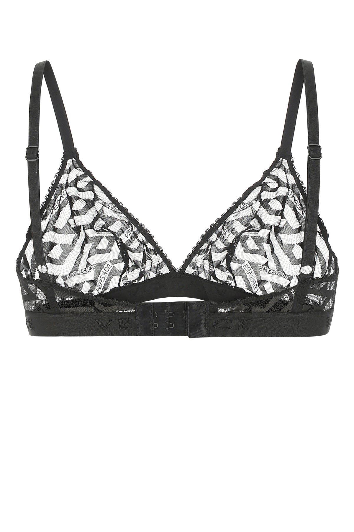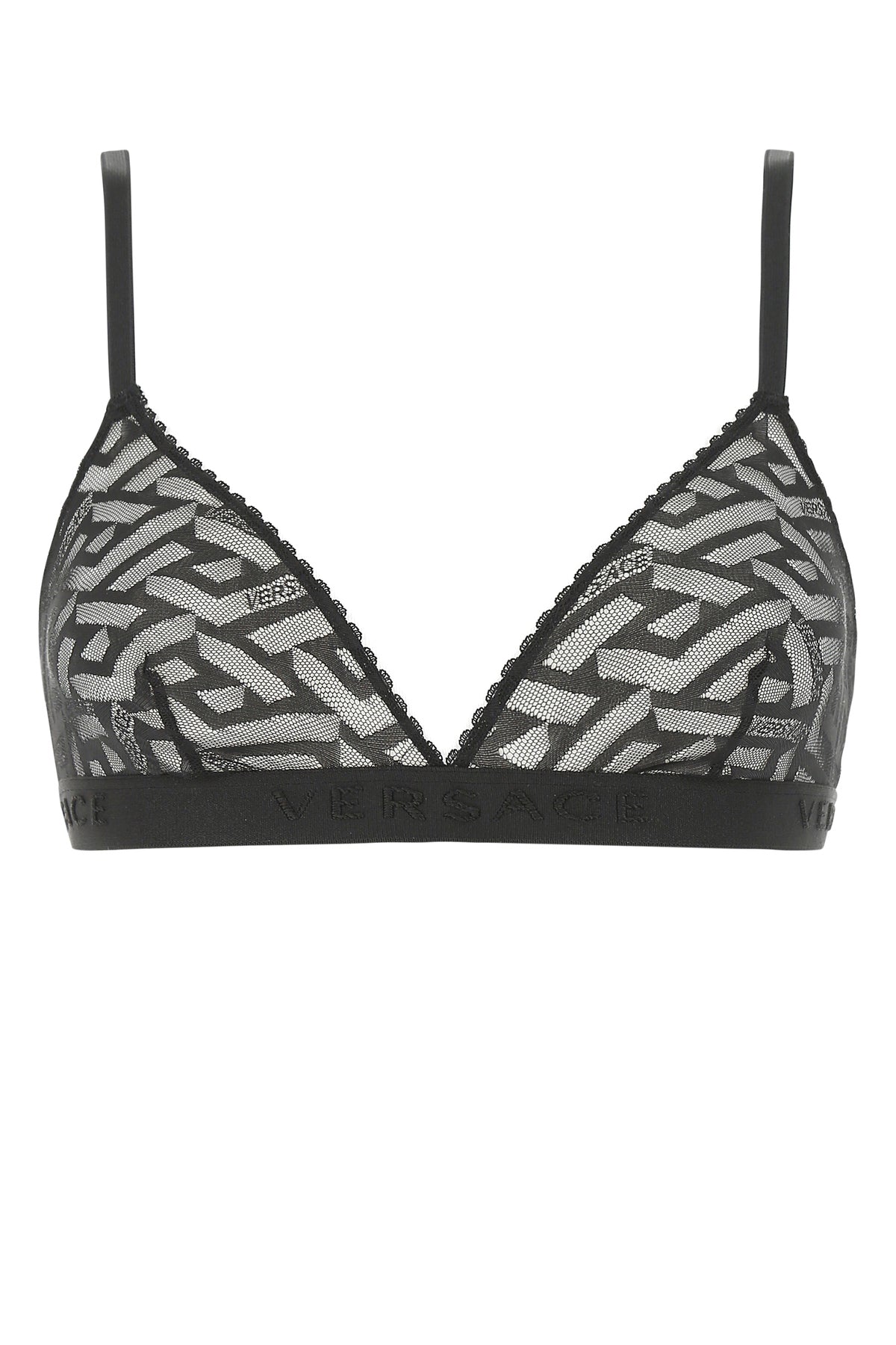 Bra realized in stretch nylon lace characterized by Greca Signature embroidery on the entire surface.