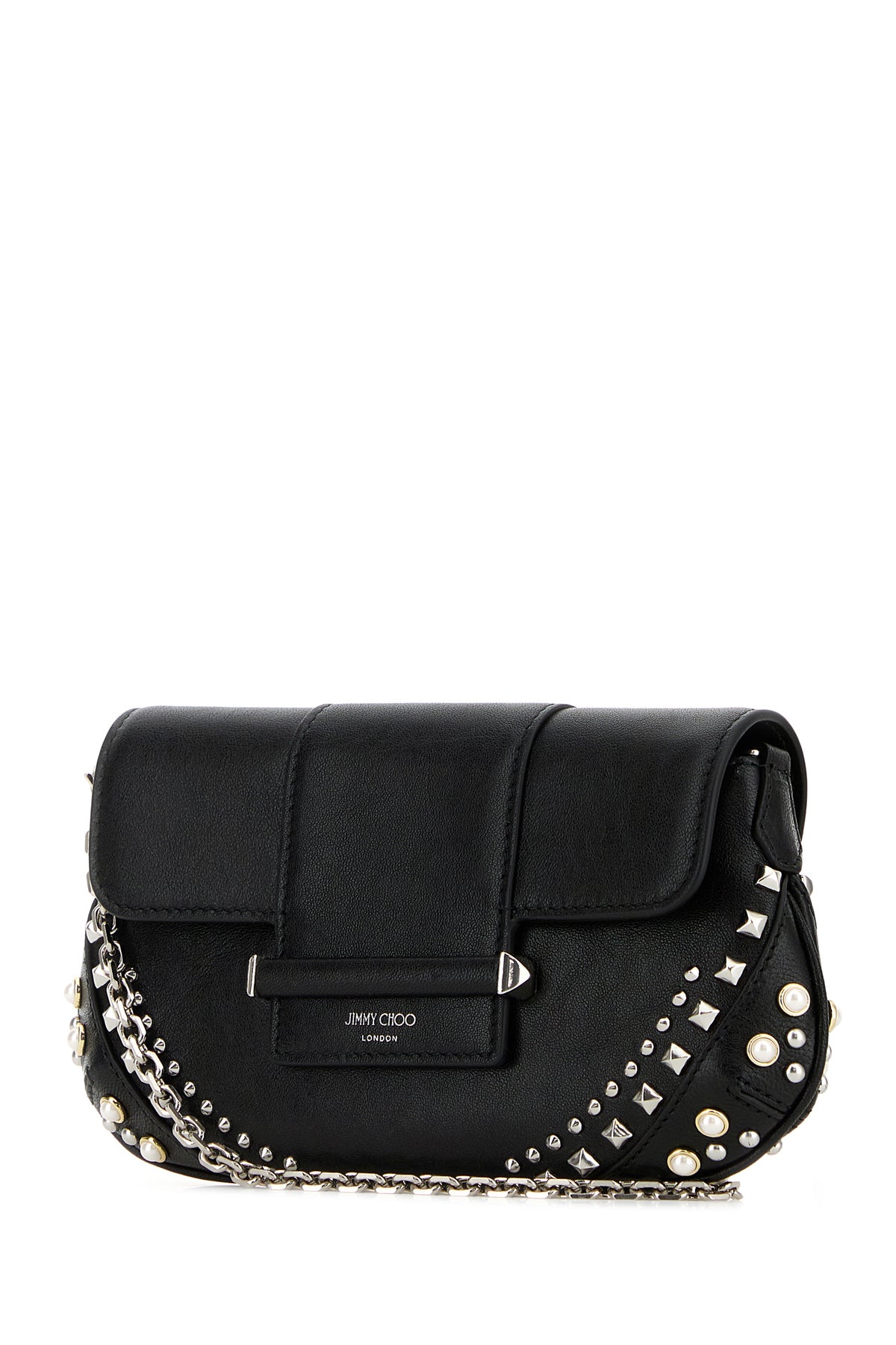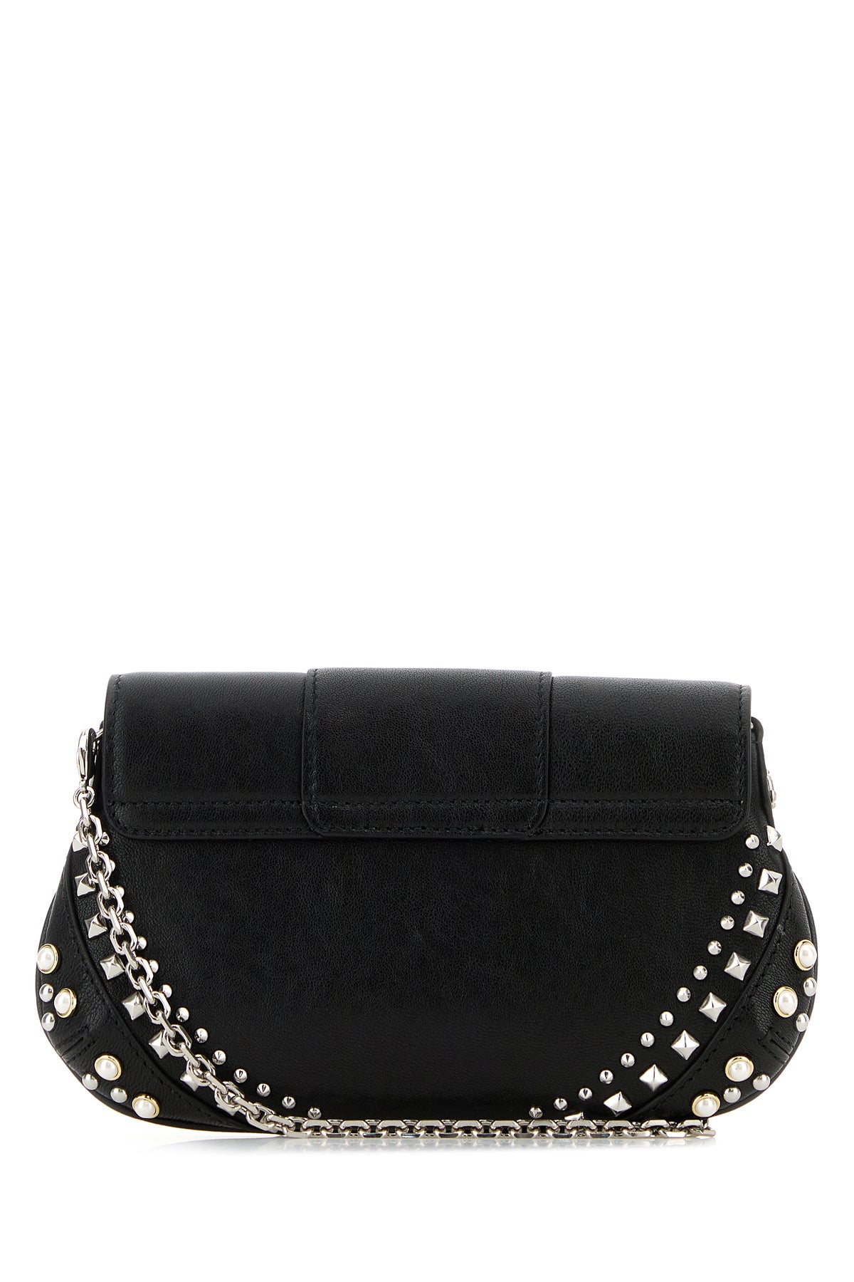 Clutch realized in slightly pebble leather characterized by laminated printed logo on the flap enriched by metal studs on the hemline.
