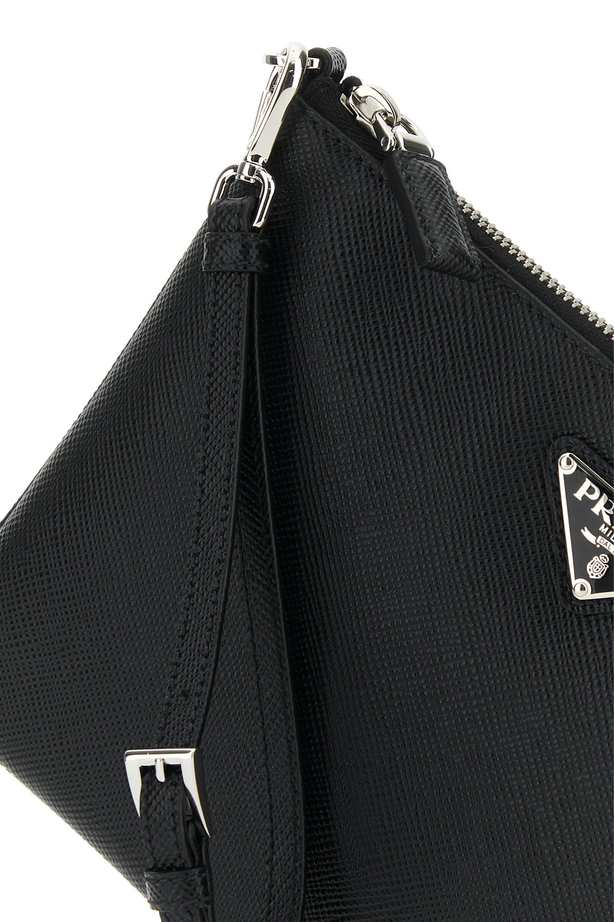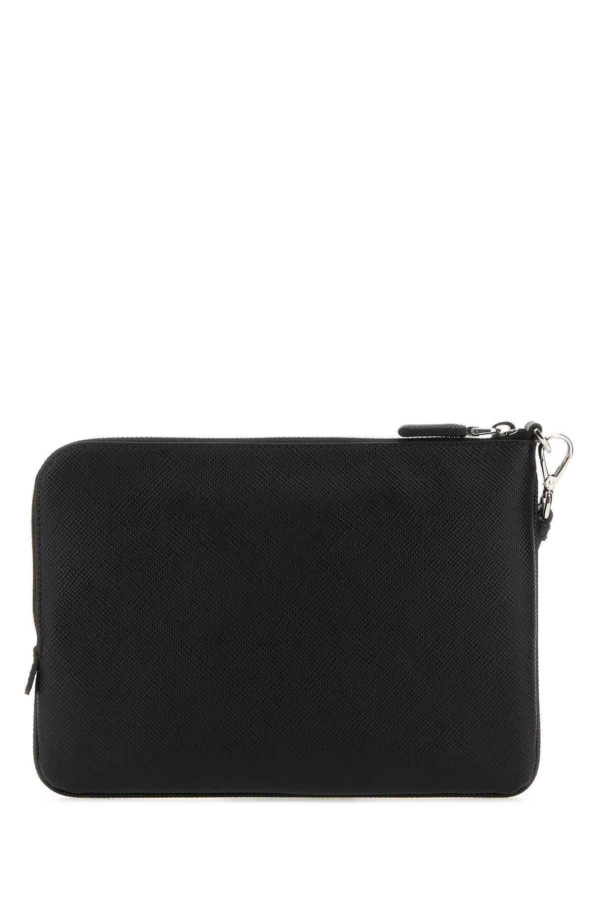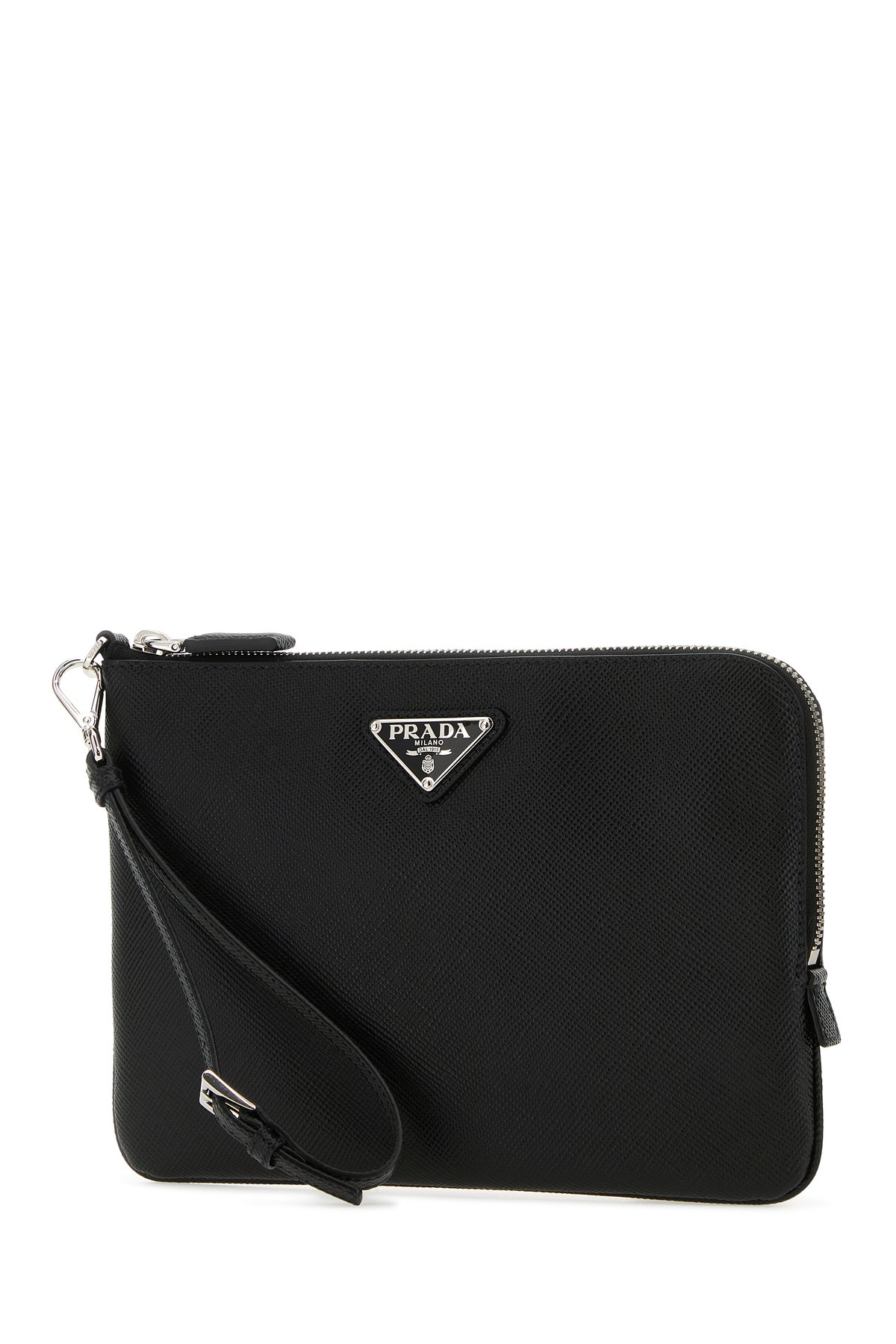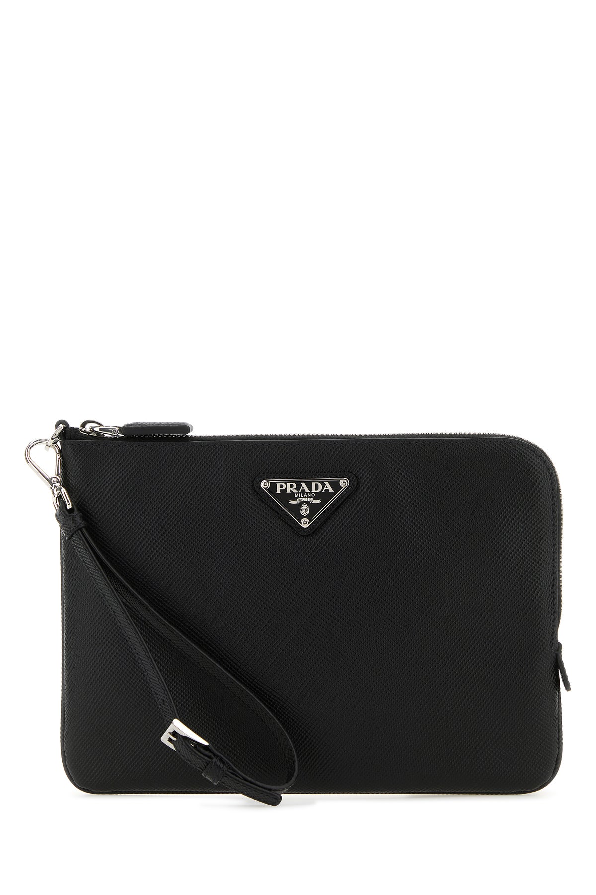 Clutch realized in Saffiano leather enriched by iconic metal logoed triangle at the front.