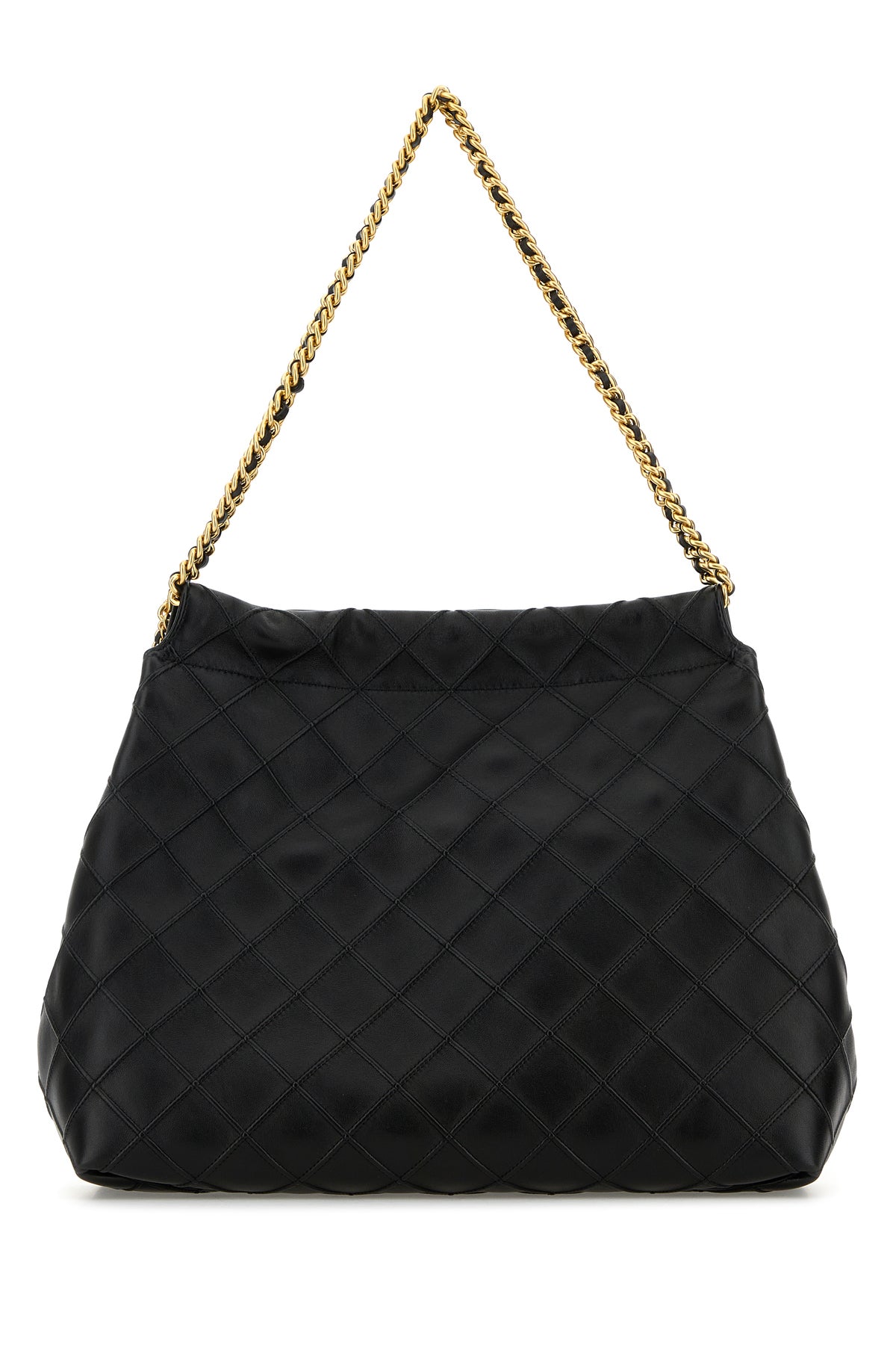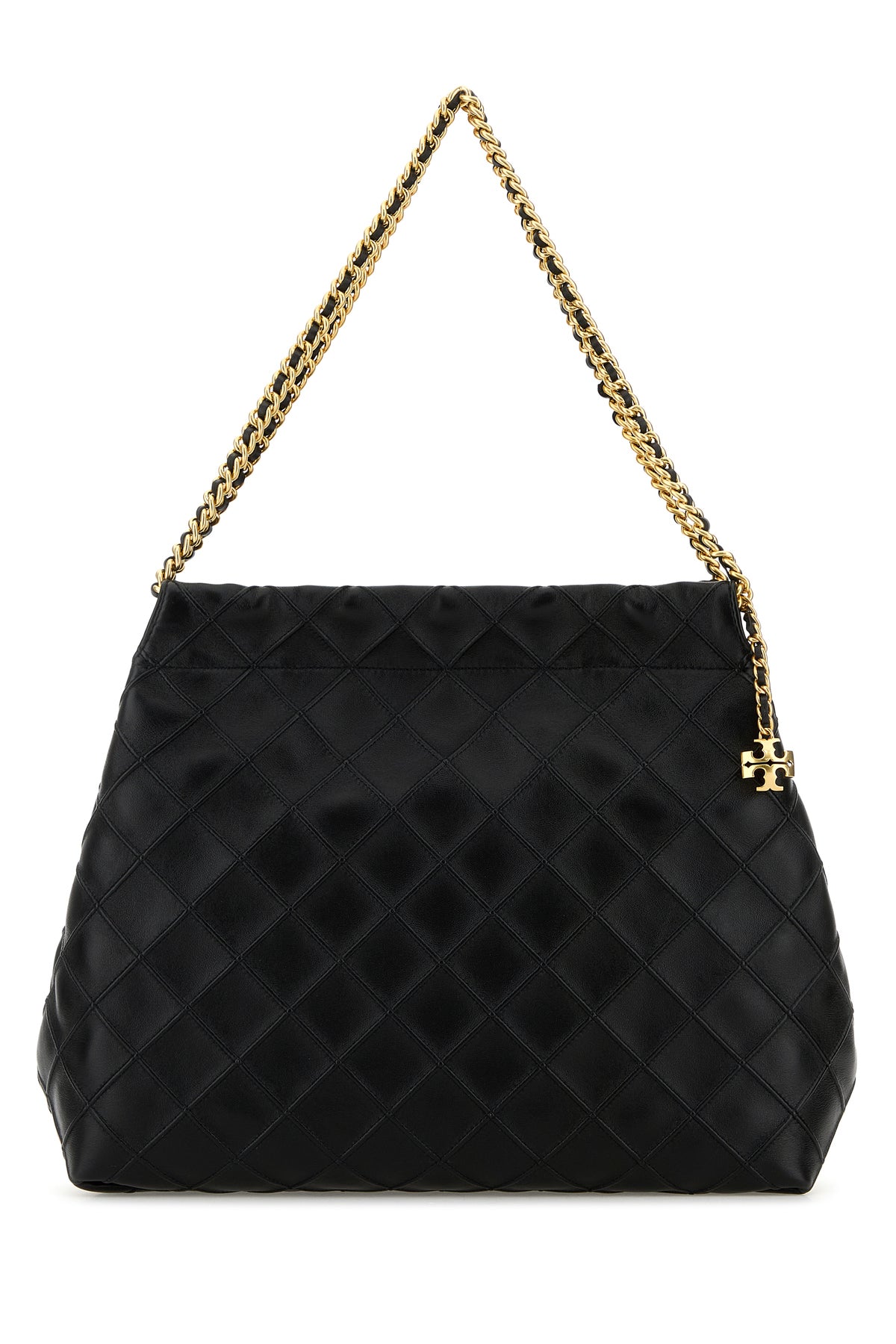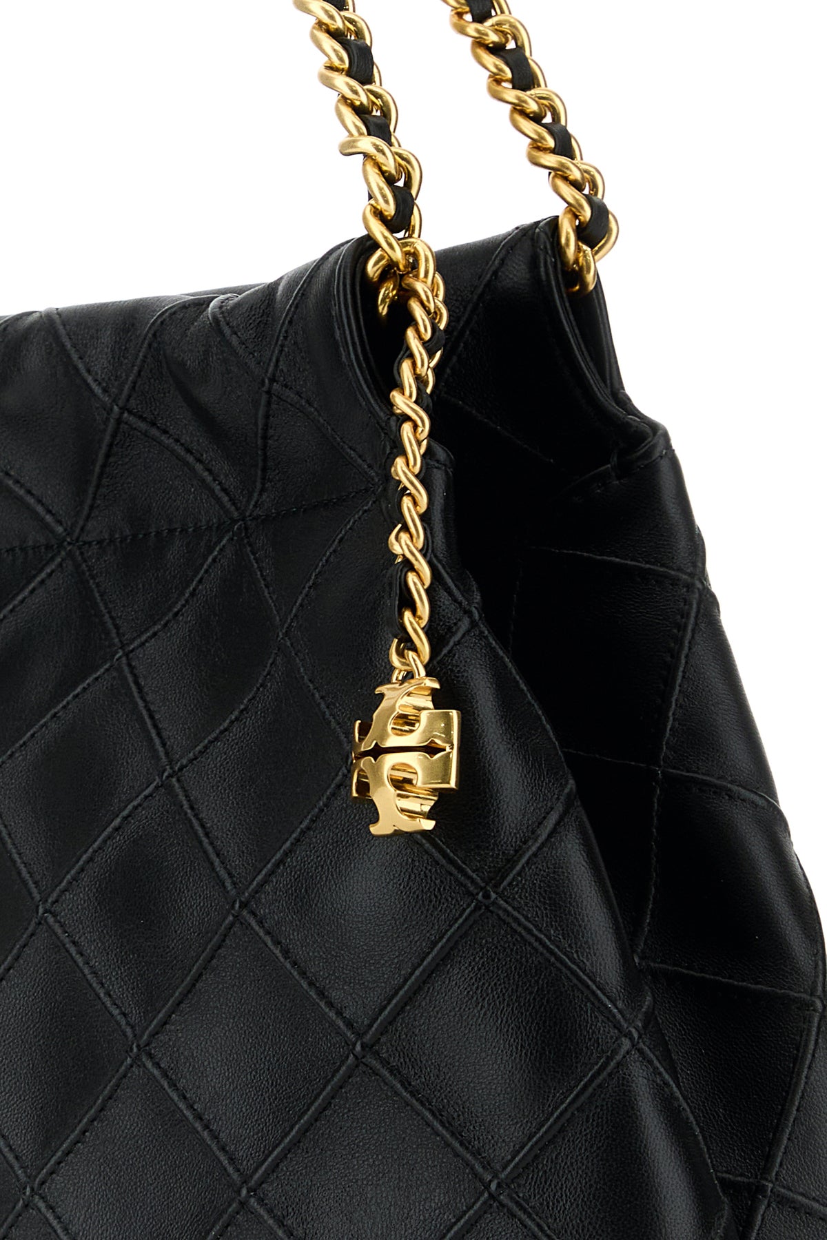 Shopping bag realized in quilted leather enriched by logoed charm on the side.