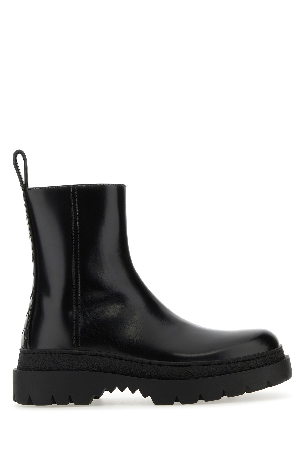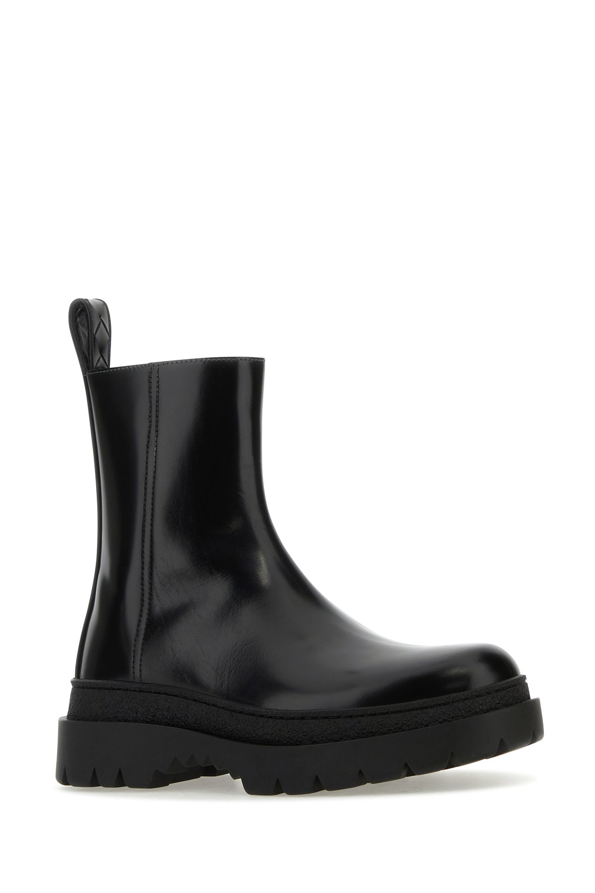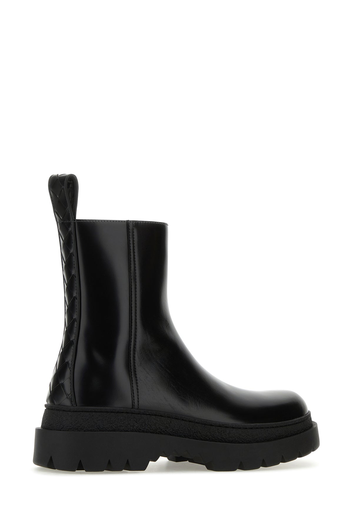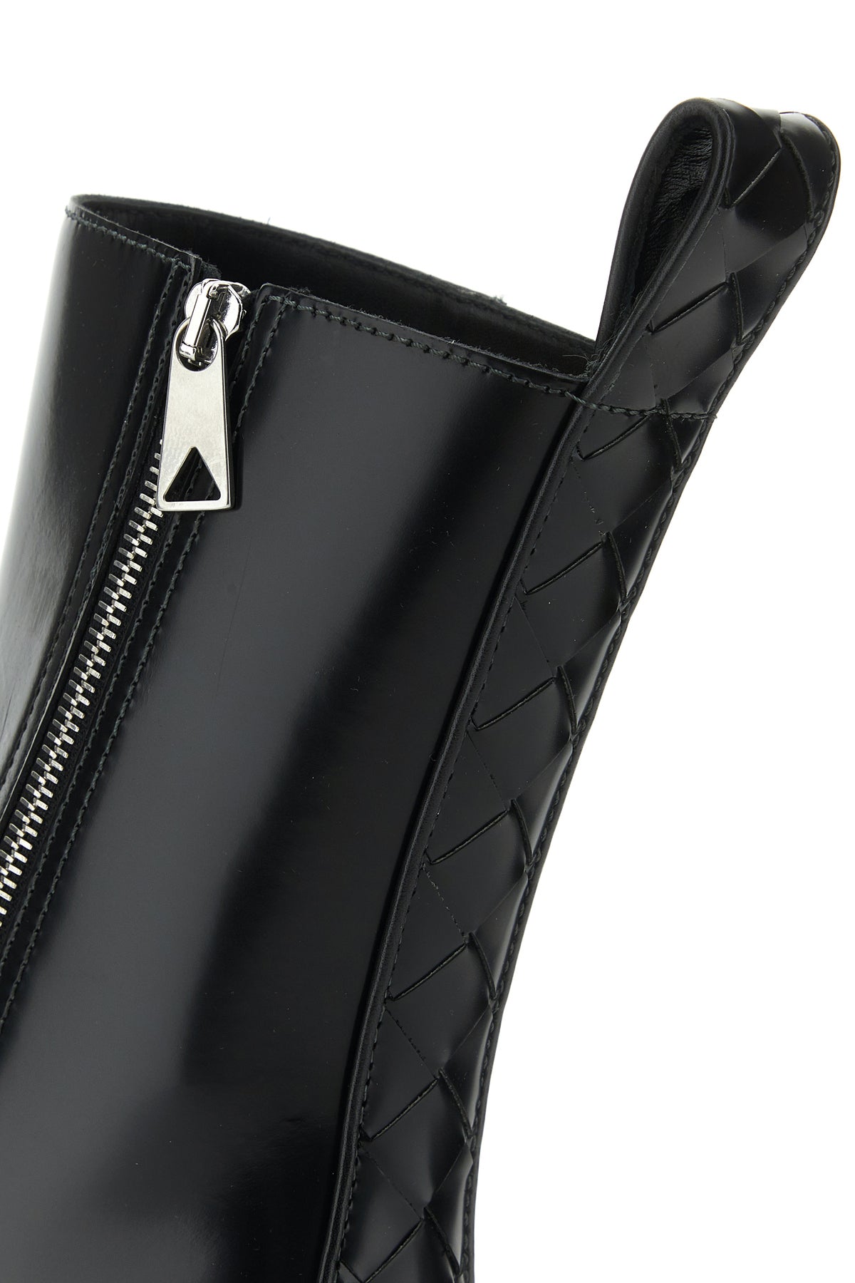 Ankle boots realized in polished-finish smooth calf leather with Intrecciato motif leather insert at the back.