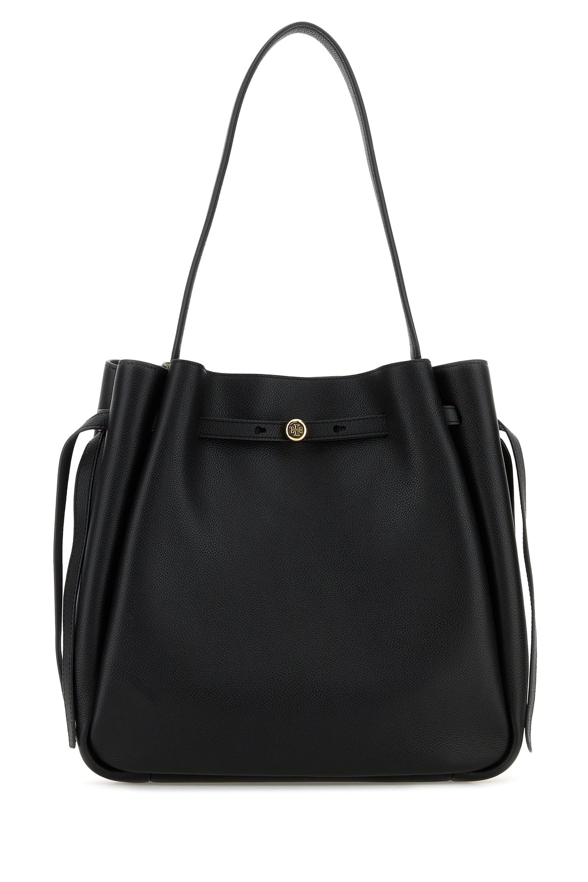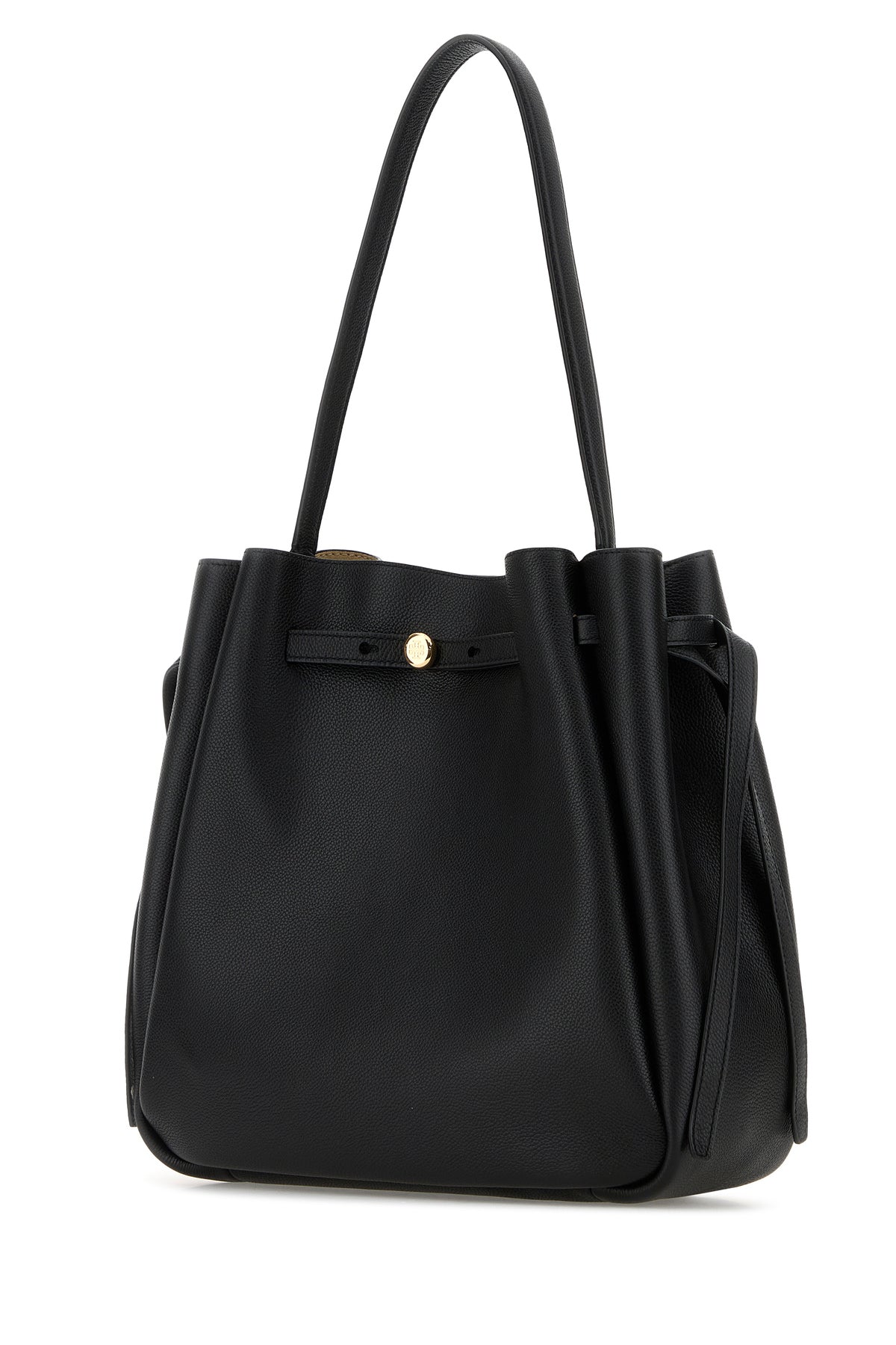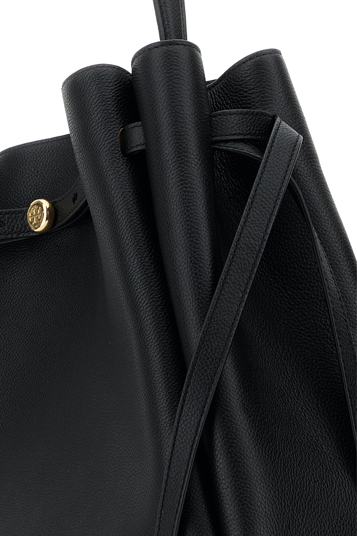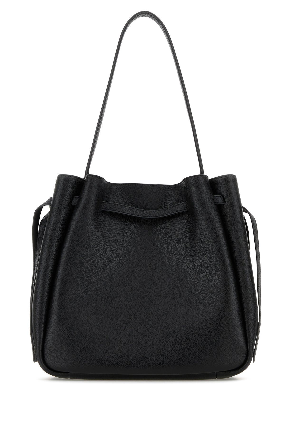 Bucket bag realized in pebble leather enriched by tonal leather belt with metal logoed detail.