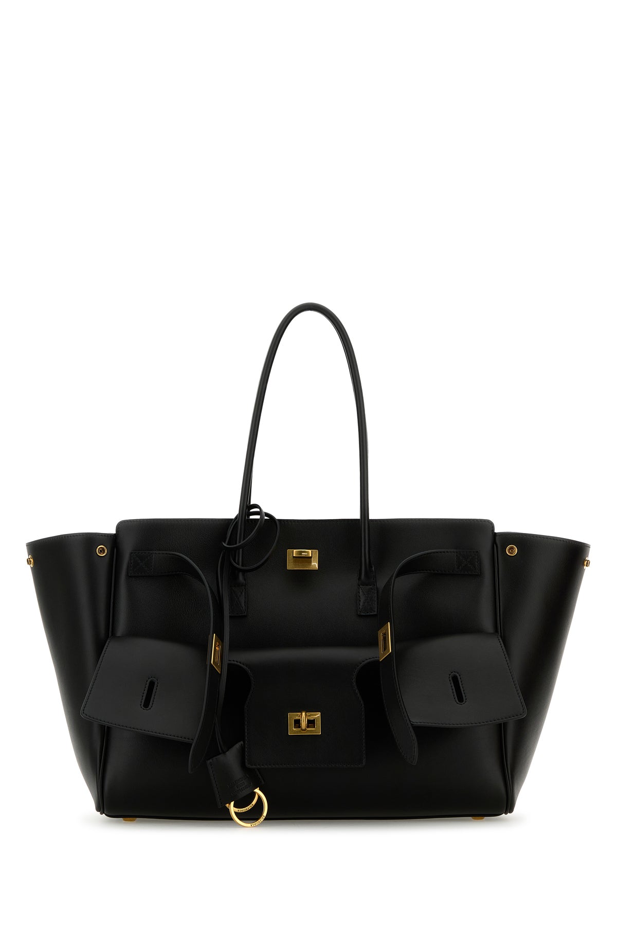 Shopping bag realized in smooth calf leather characterized by laminated printed logo at the back enriched by detachable keyring accessory and peculiar decorative pockets at the front.