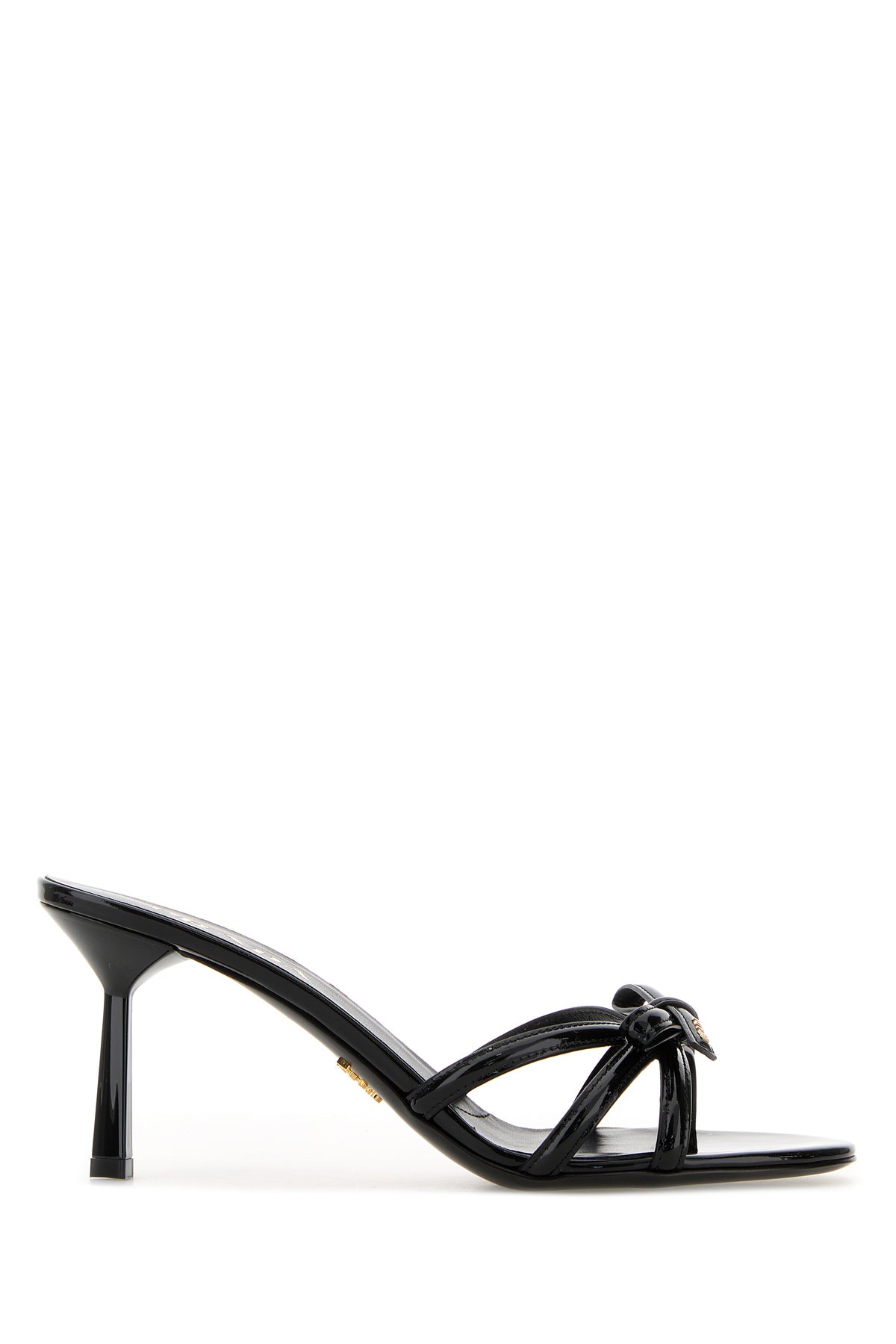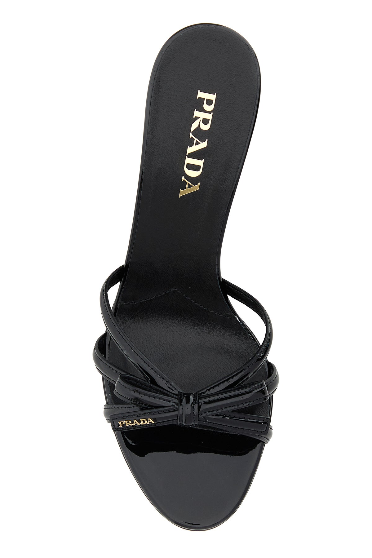 Mules realized in patent leather enriched by metal lettering logo on the decorative bow on the instep.