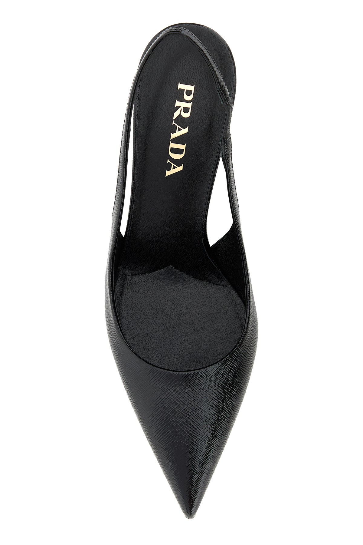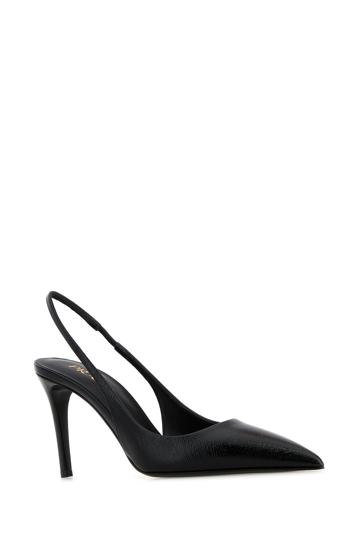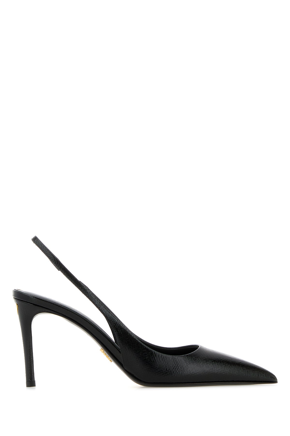 Slingback realized in polished-finish grained leather enriched by metal iconic logoed triangle at the back.