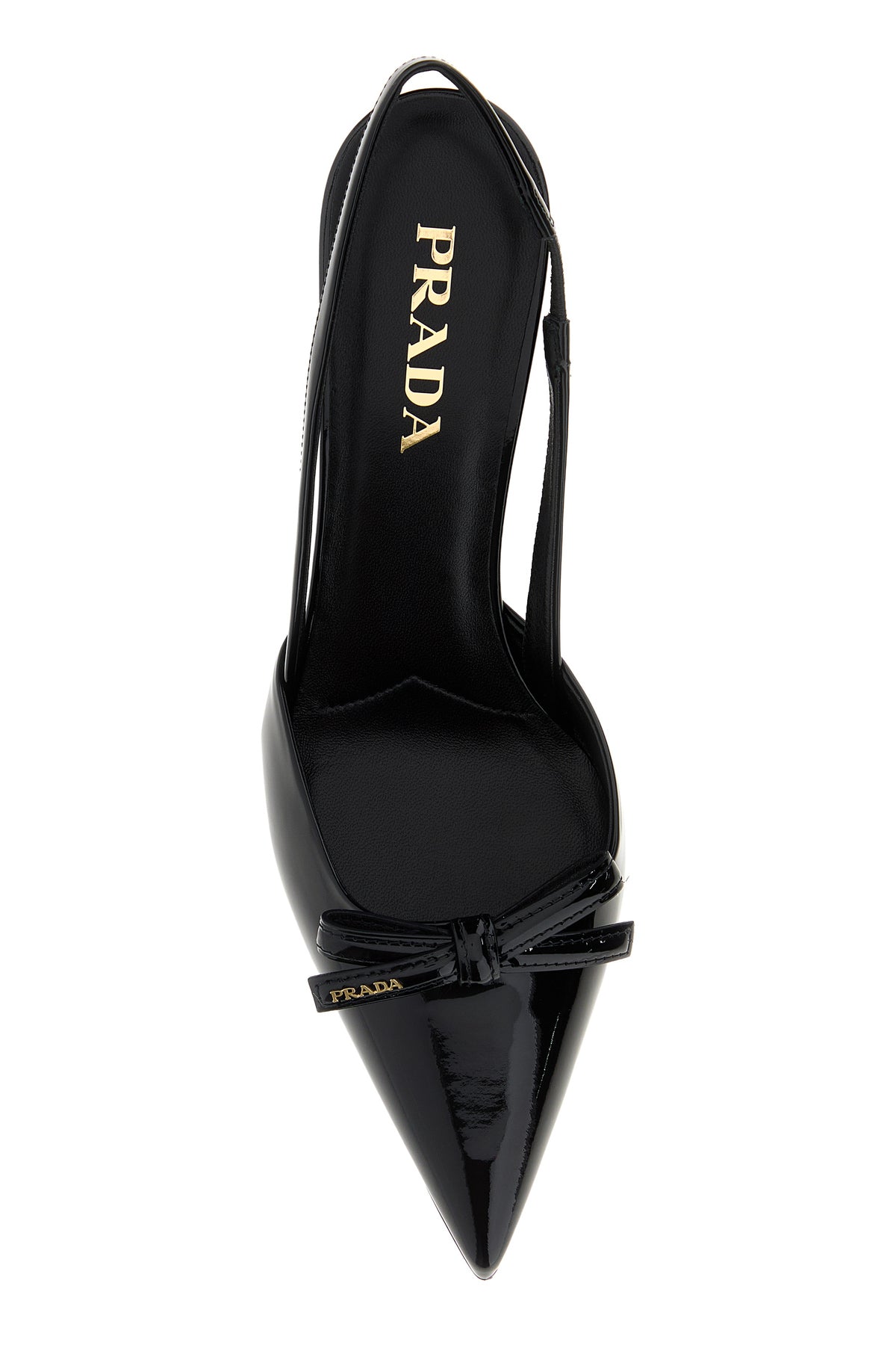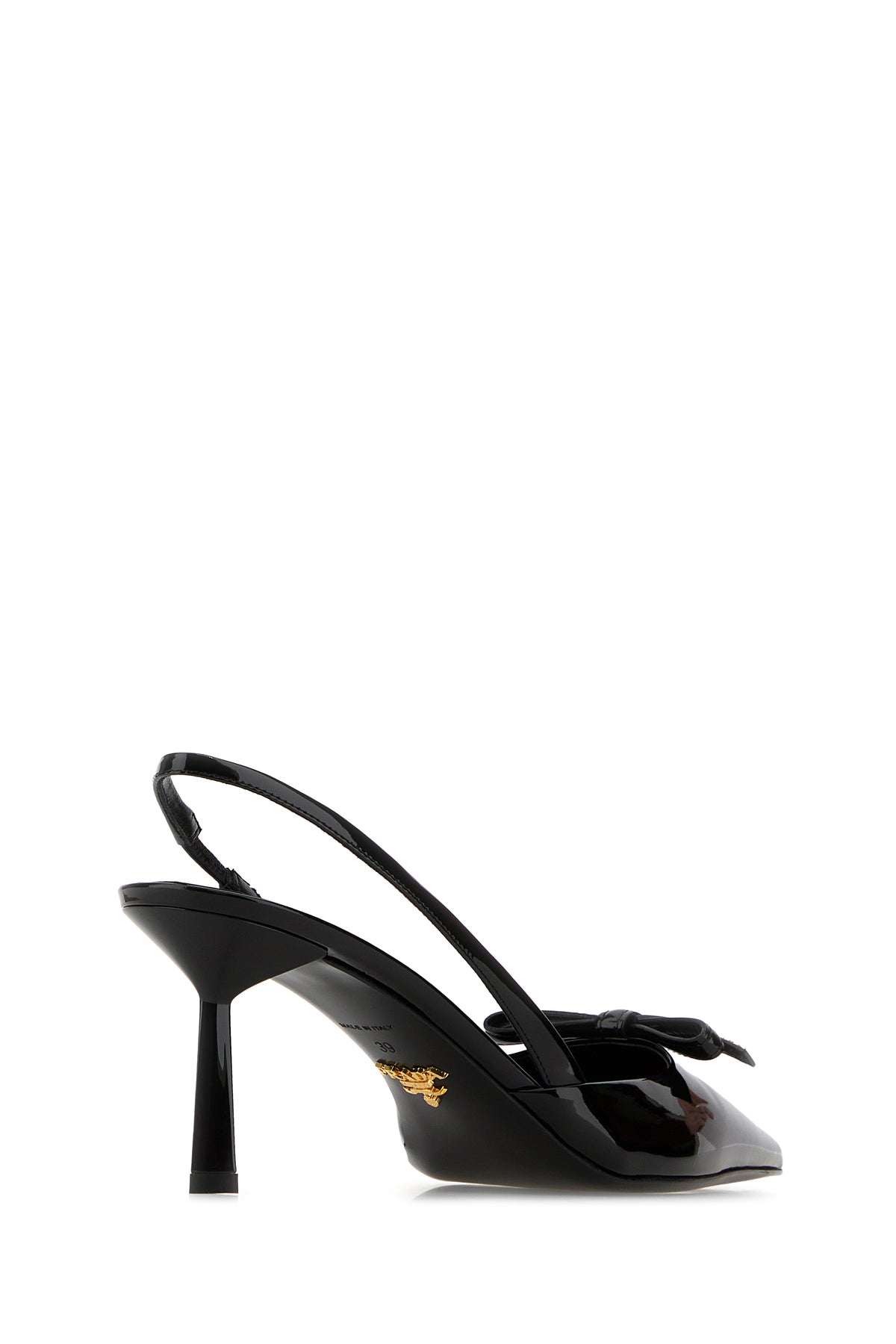 Slingback realized in patent enriched by logoed decorative bow on the instep.