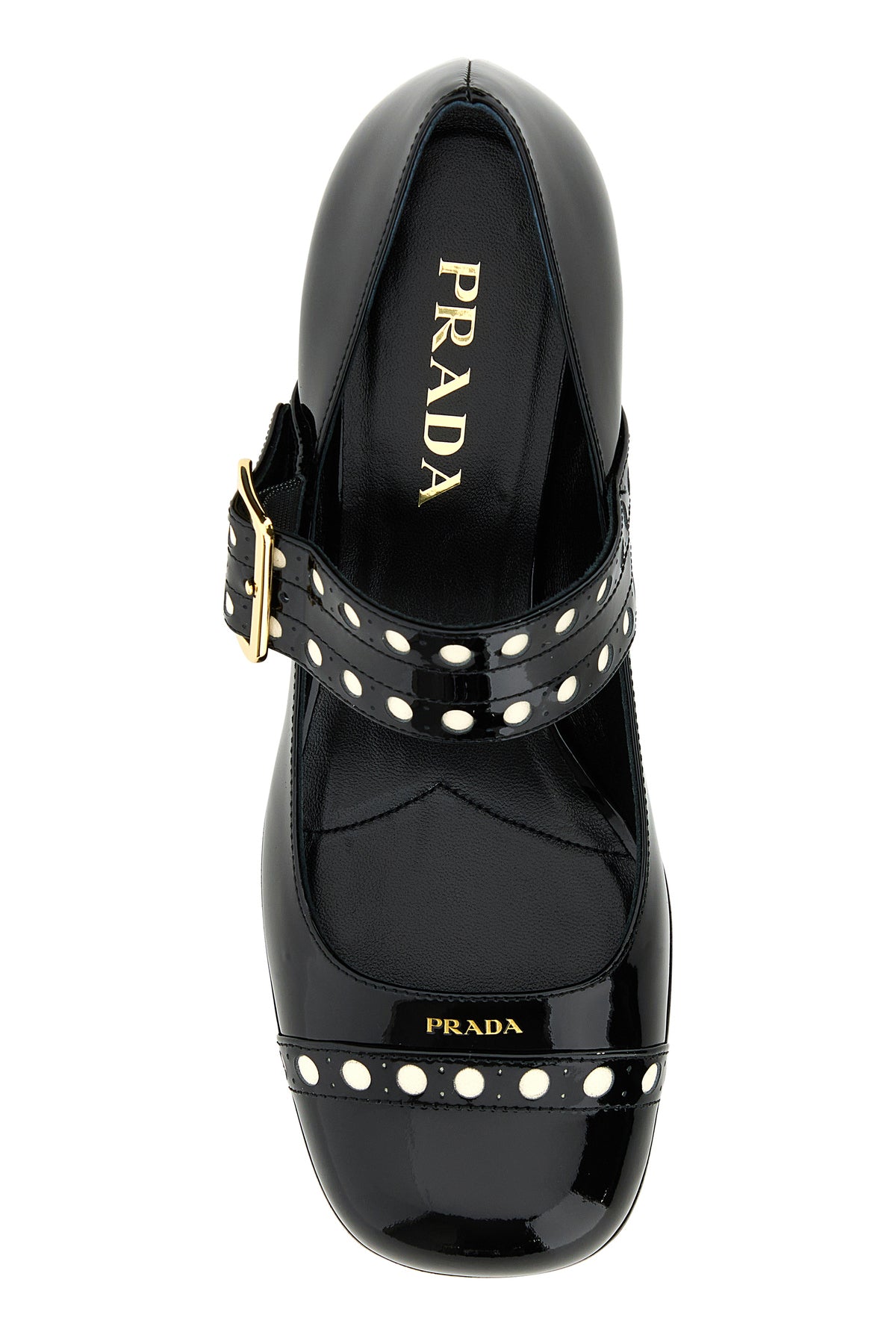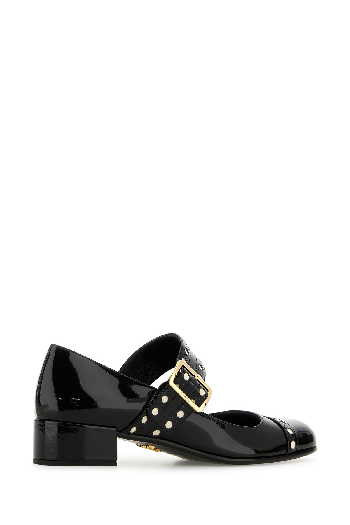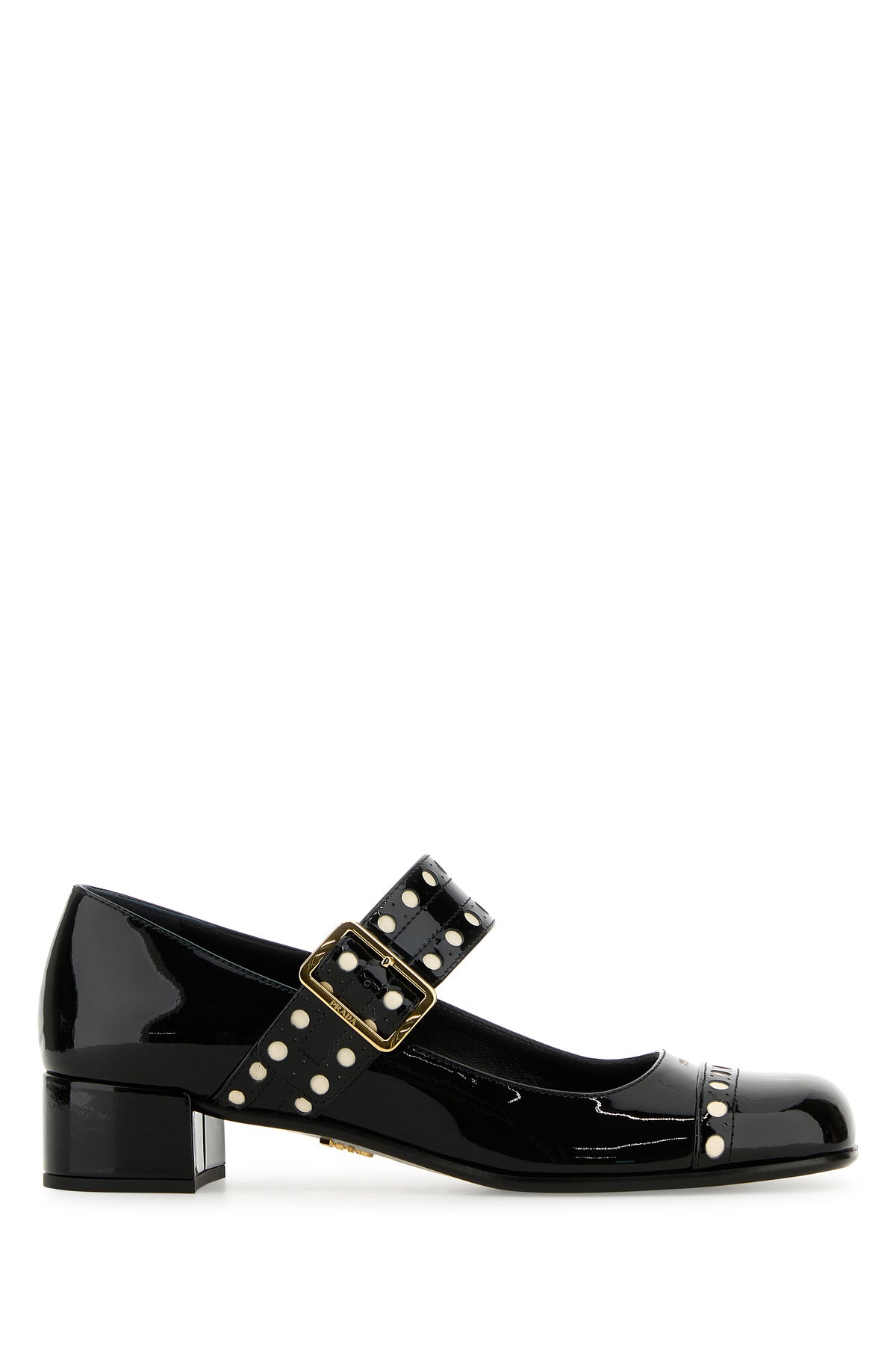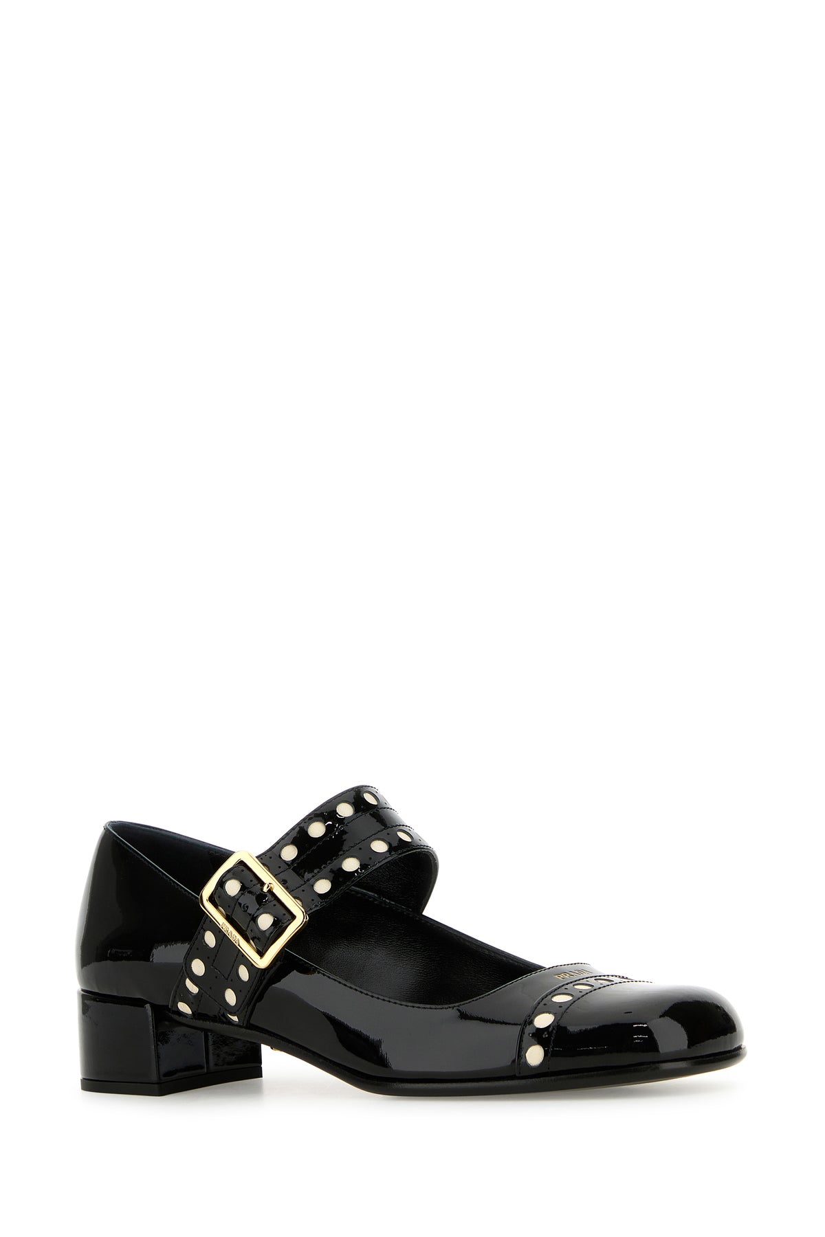 Pumps realized in patent leather characterized by laminated printed logo and peculiar cut-out details at the front.