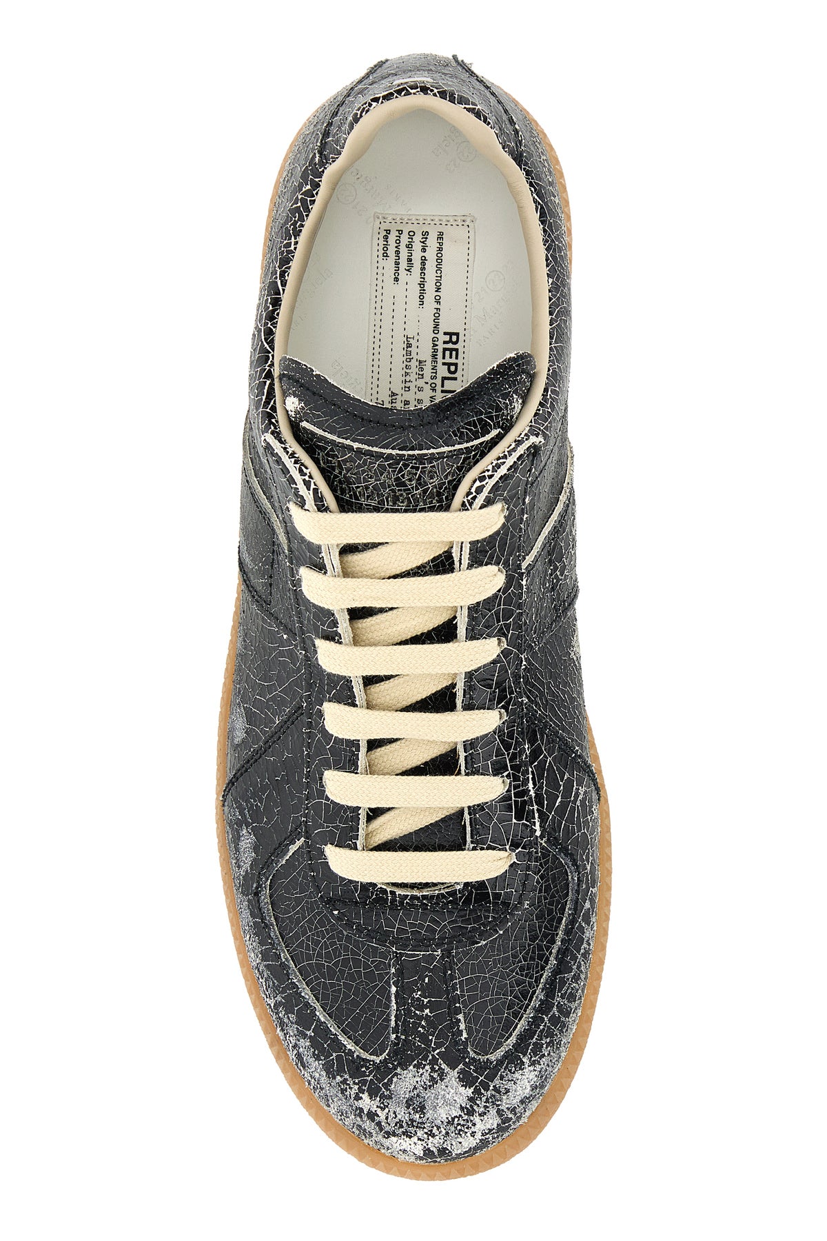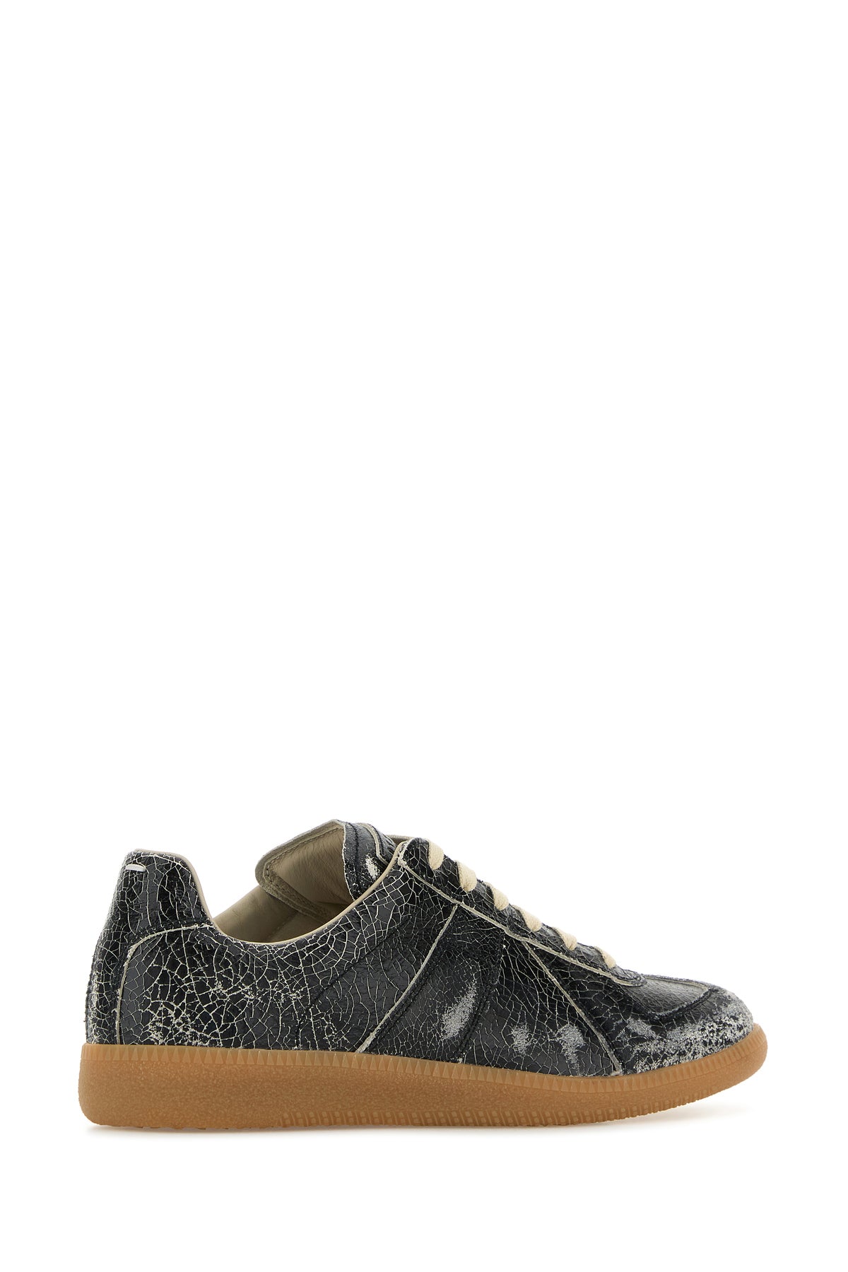 Sneakers realized in crackle leather characterized by iconic contrasting stitching at the back.