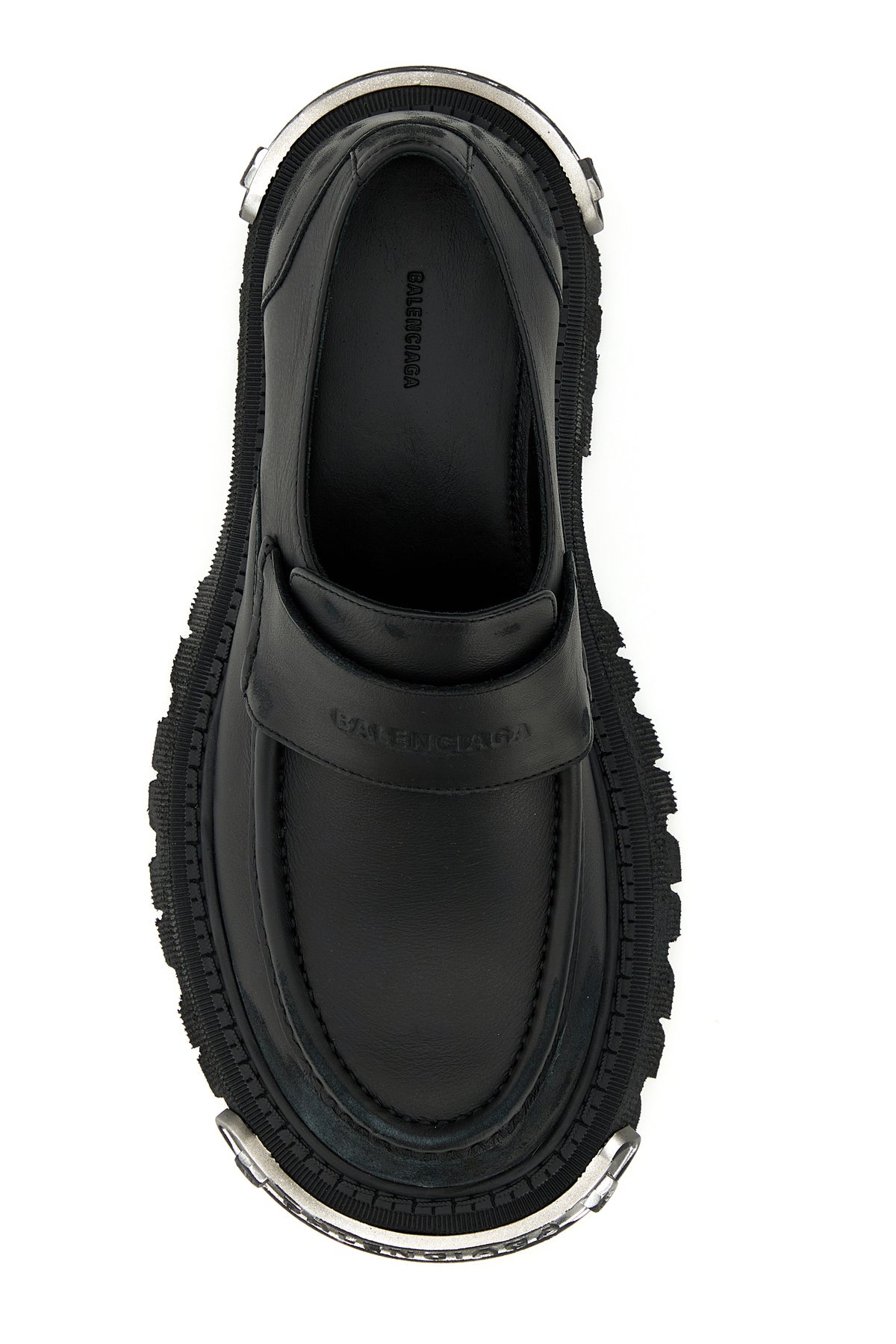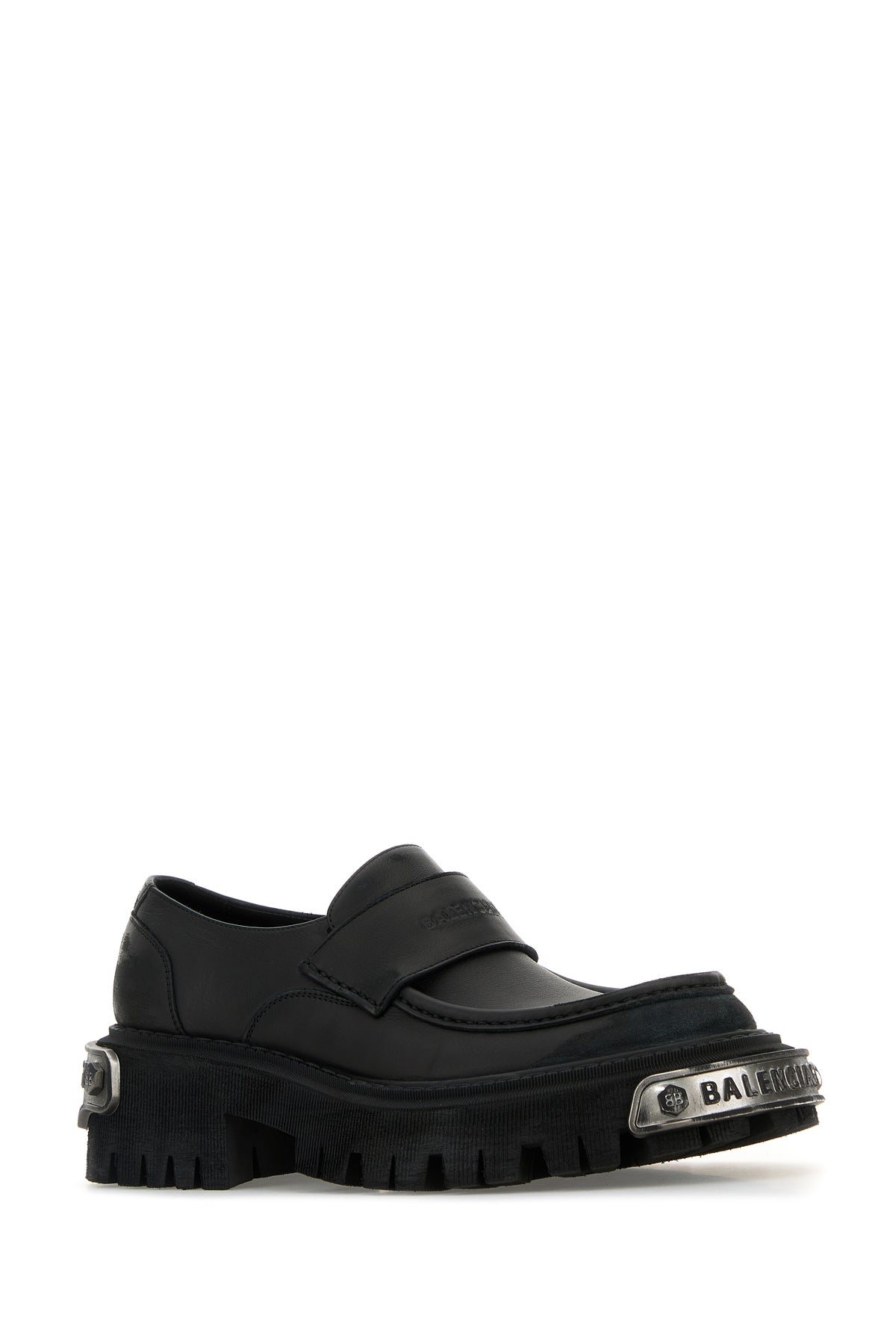 Loafers realized in worn-out effect calf leather characterized by embossed logo on the vamp enriched by metal Balenciaga plate on the toe and at the back.