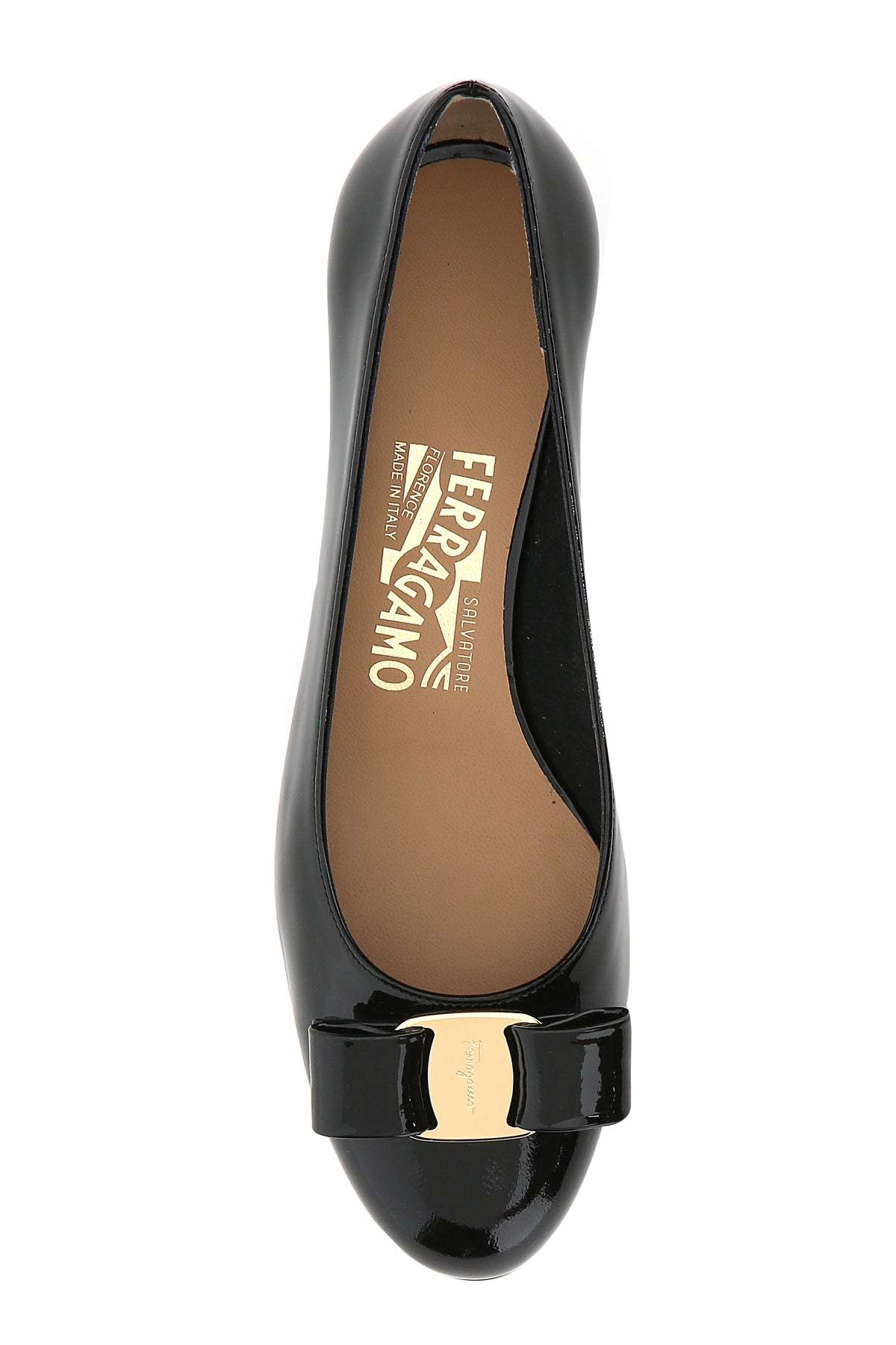 Pumps realized in patent calf leather enriched by iconic Vara bow at the front.