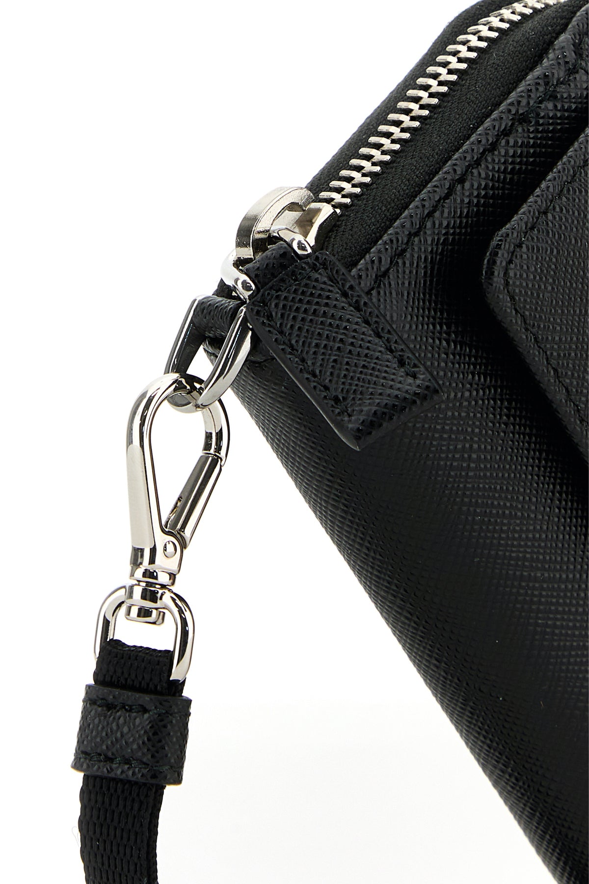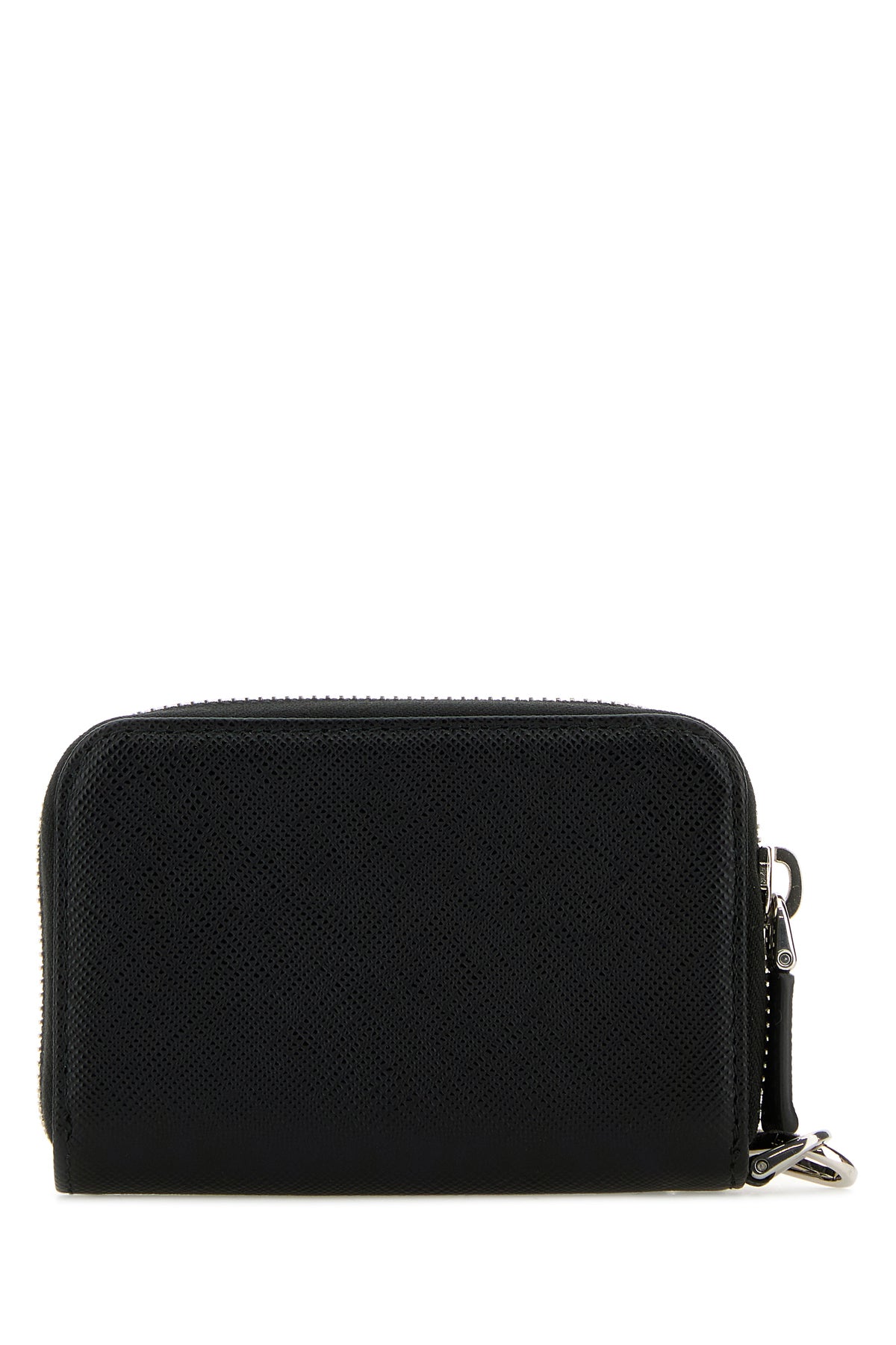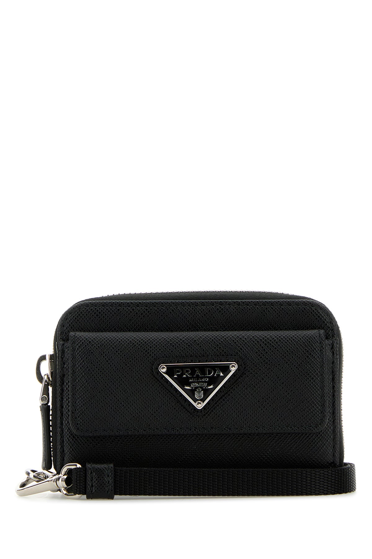 Wallet realized in Saffiano leather enriched by iconic metal logoed triangle at the front.