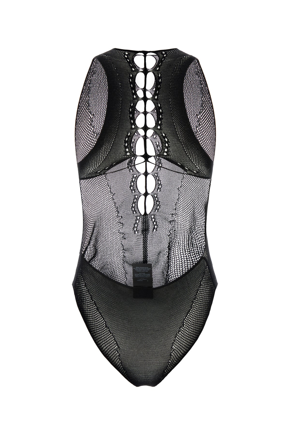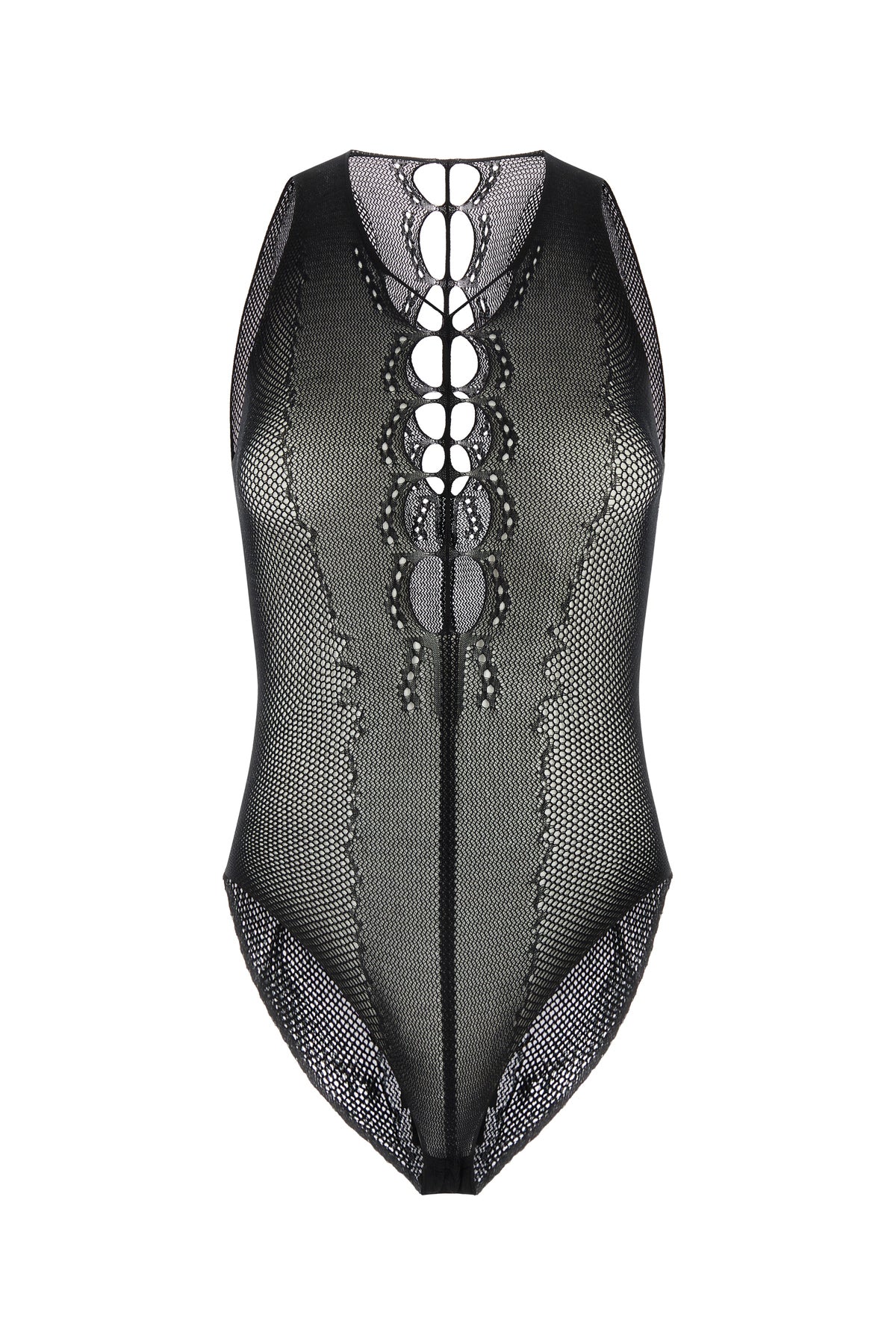 Bodysuit realized in mesh characterized by cut-out details at the front and at the back.