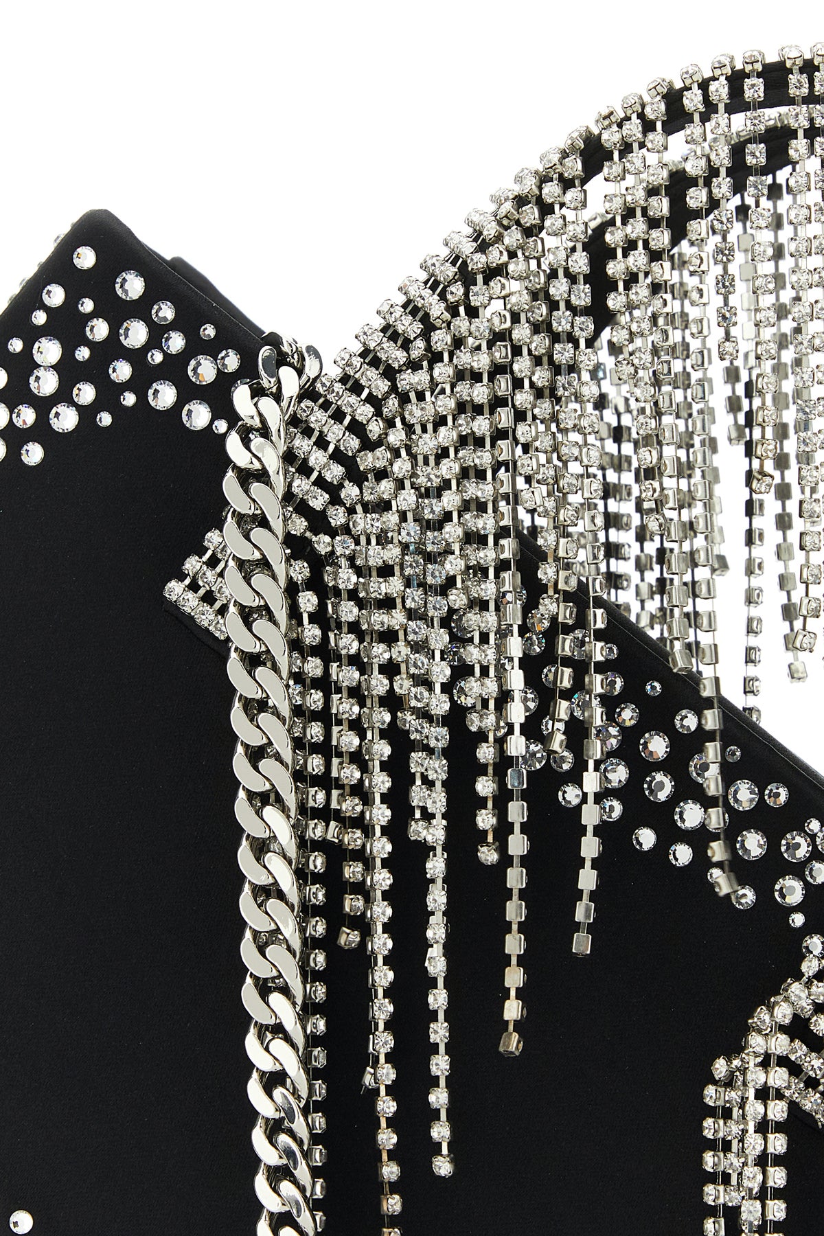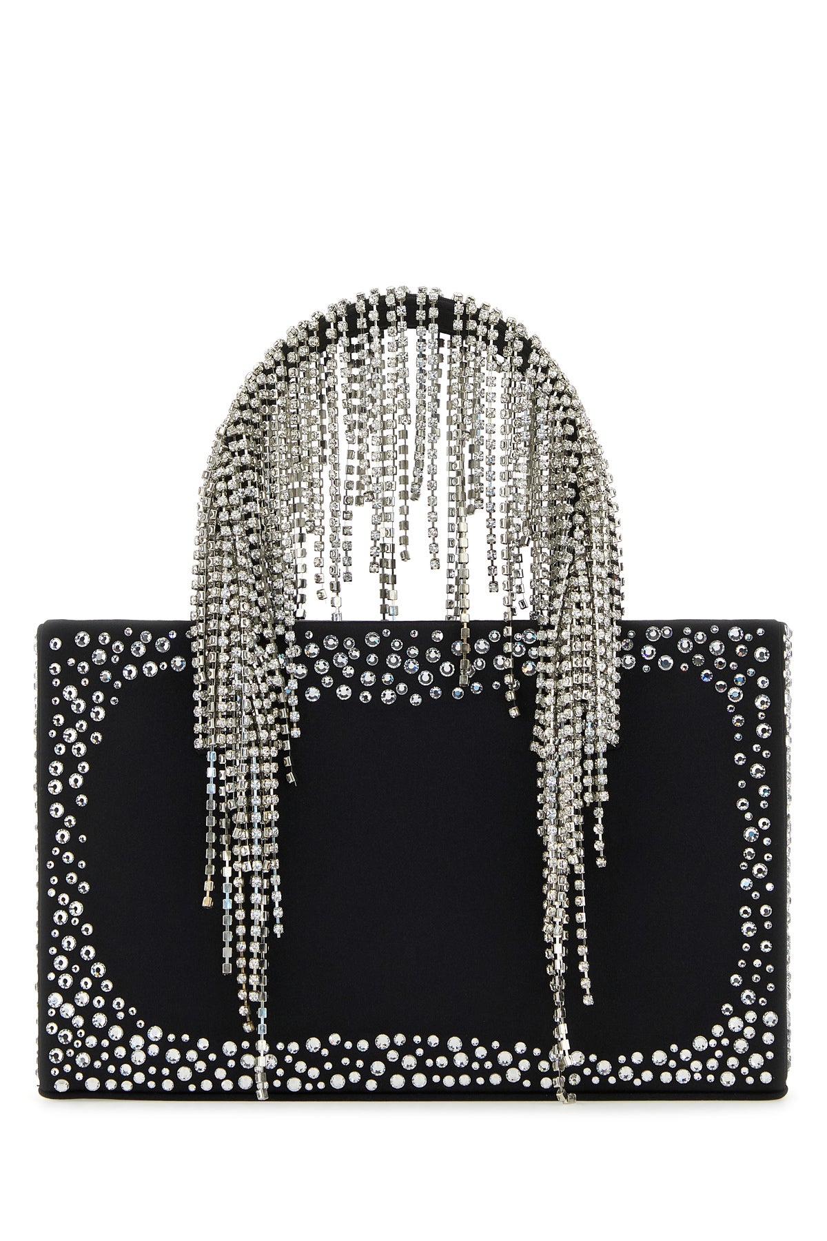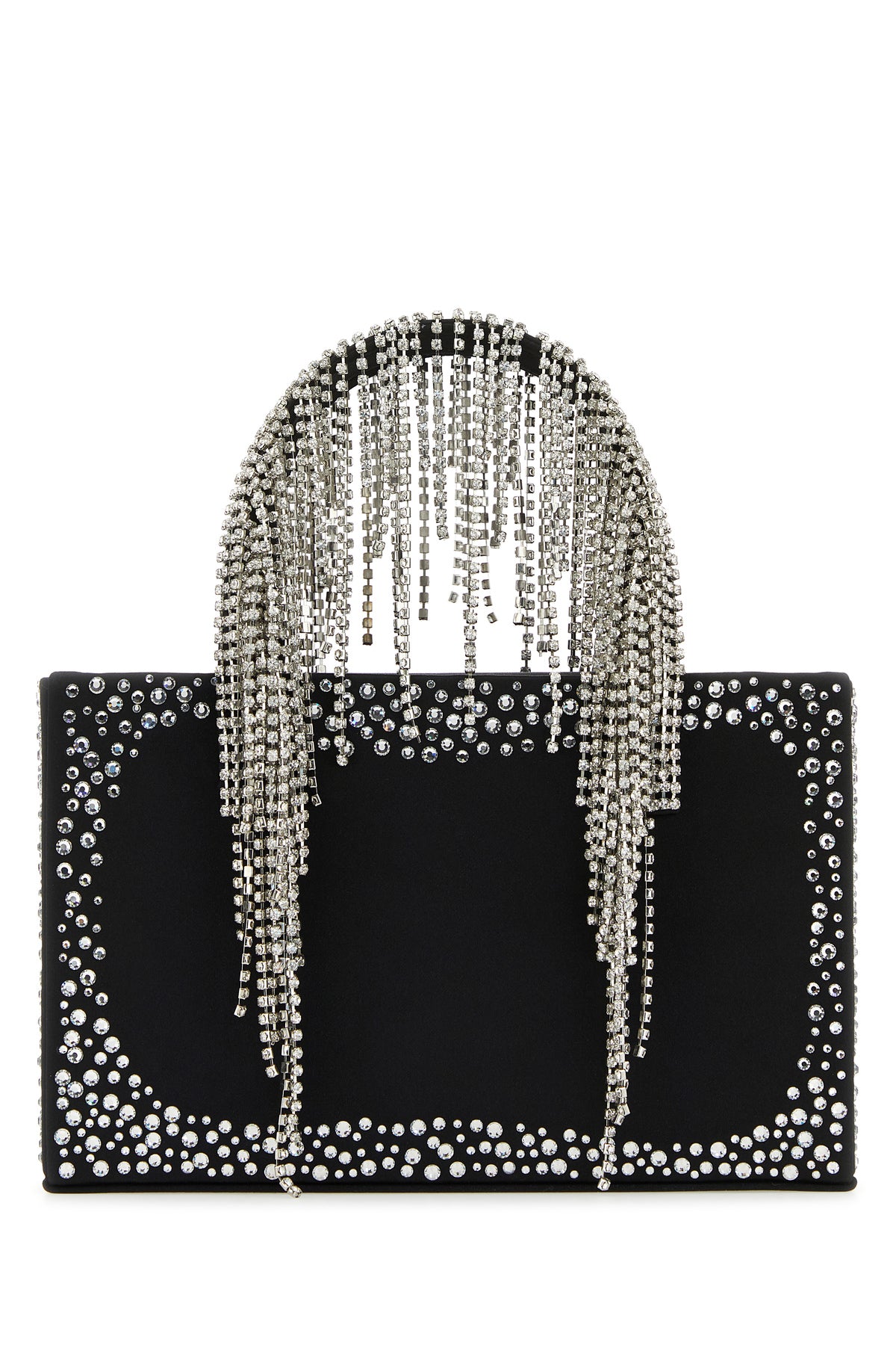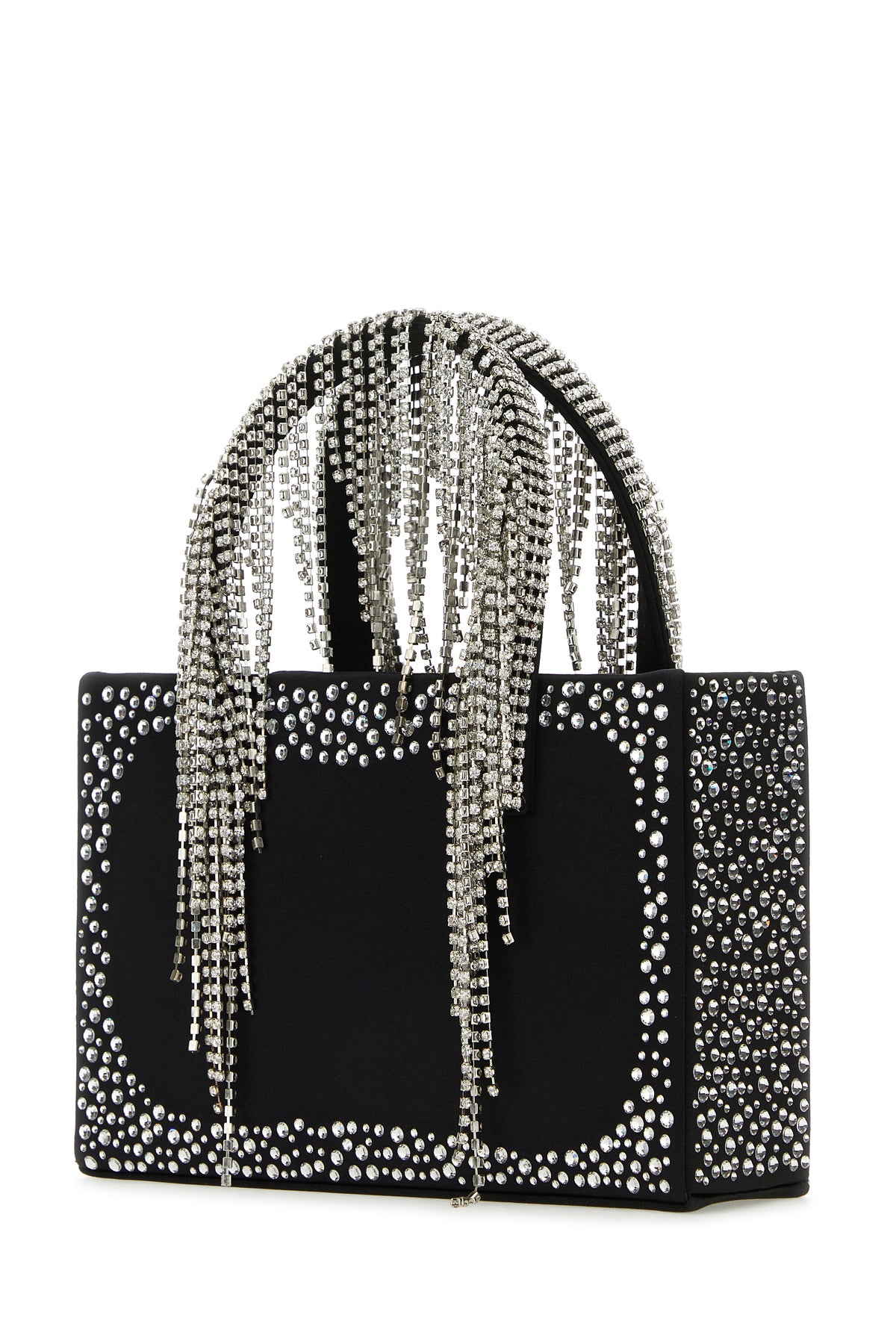 Handbag realized in lamb nappa leather enriched by rhinestones on the entire surface and rhinestones fringes on the handles.
