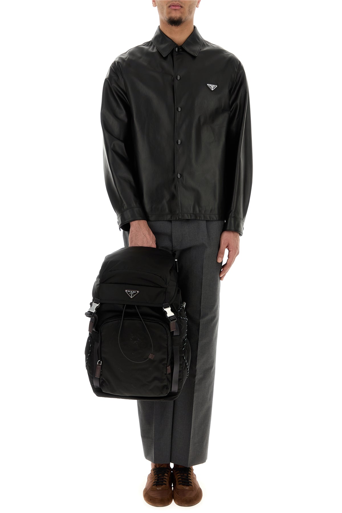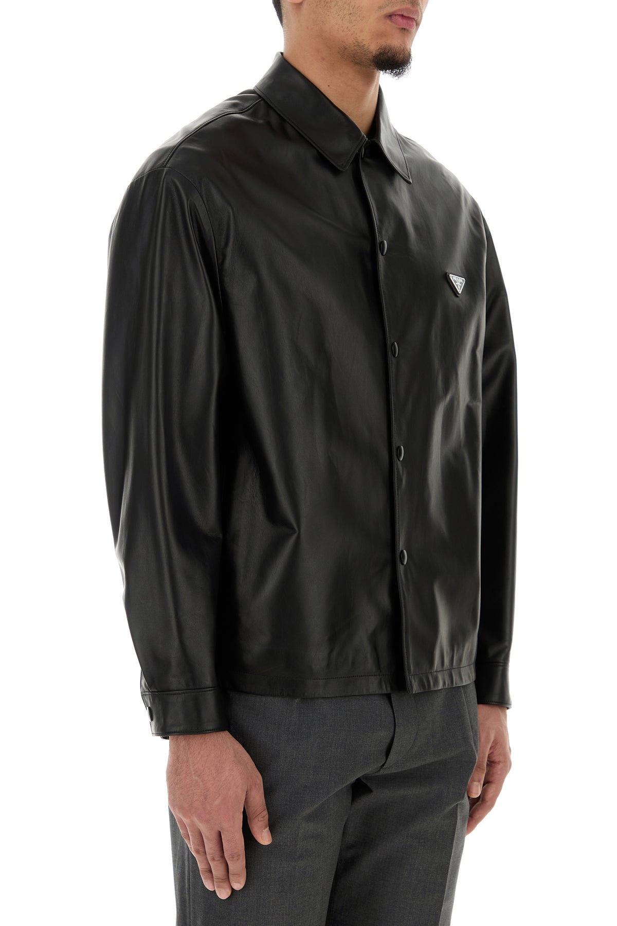 Shirt realized in lamb nappa leather enriched by iconic logoed metal triangle on the chest.