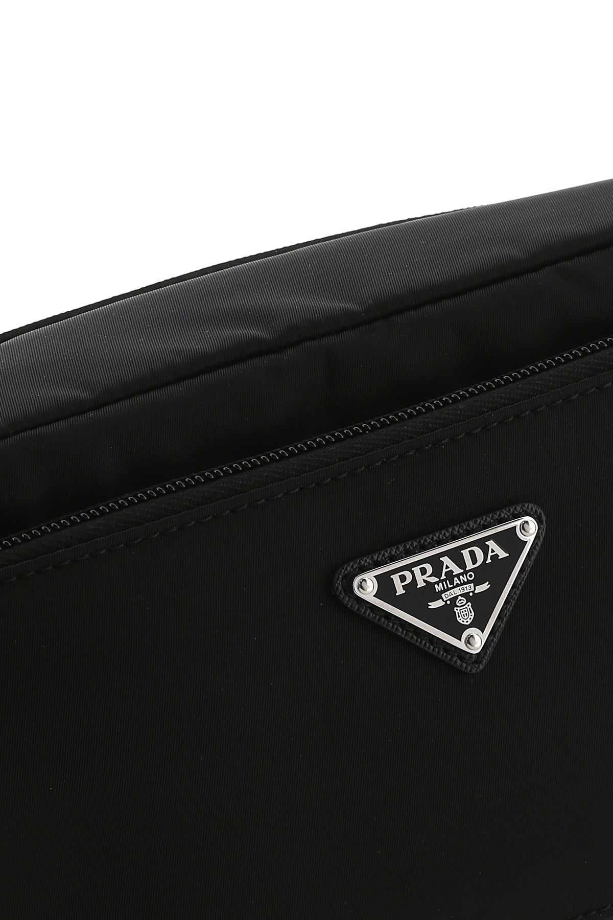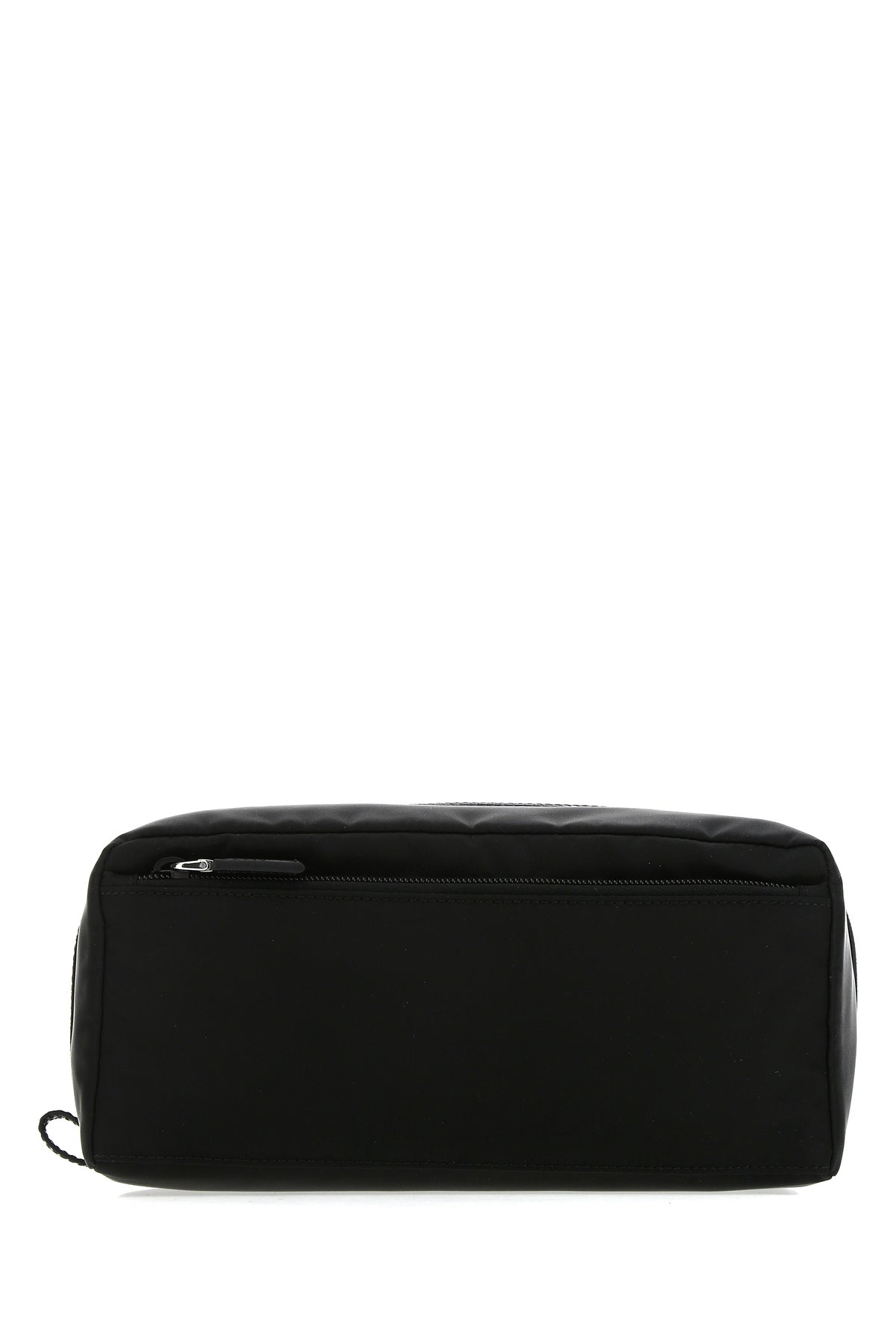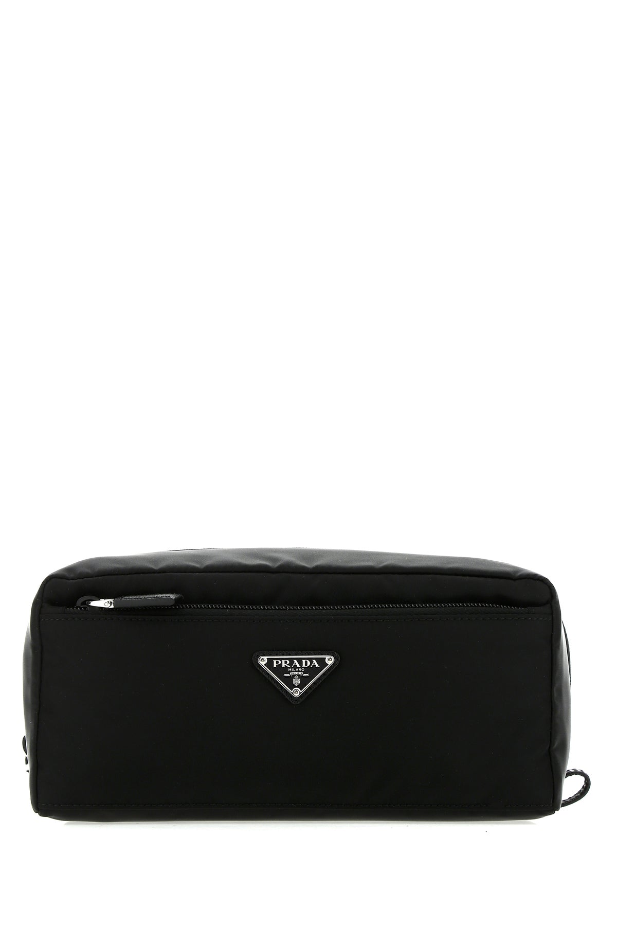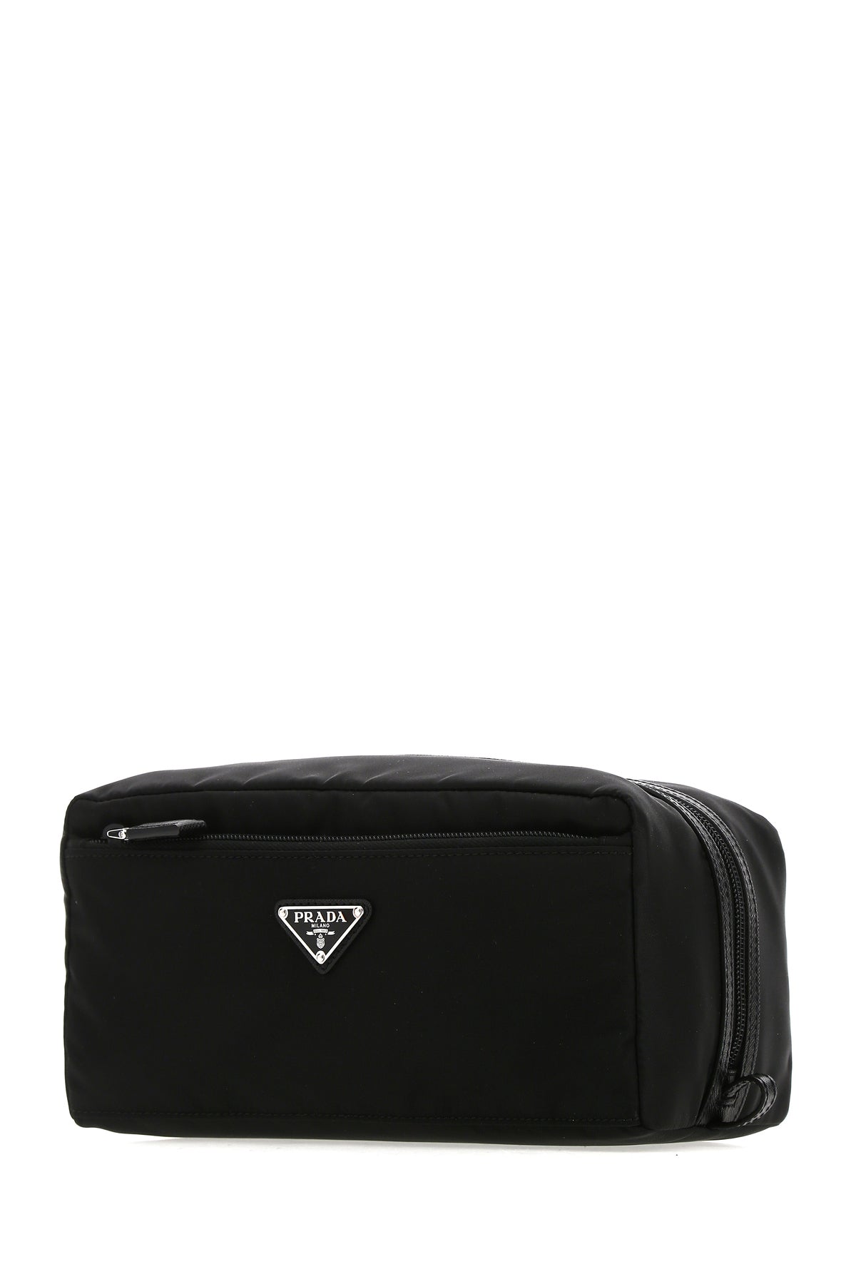 Beauty case realized in nylon with tonal Saffiano leather insert enriched by metal and leather iconic logoed triangle at the front.