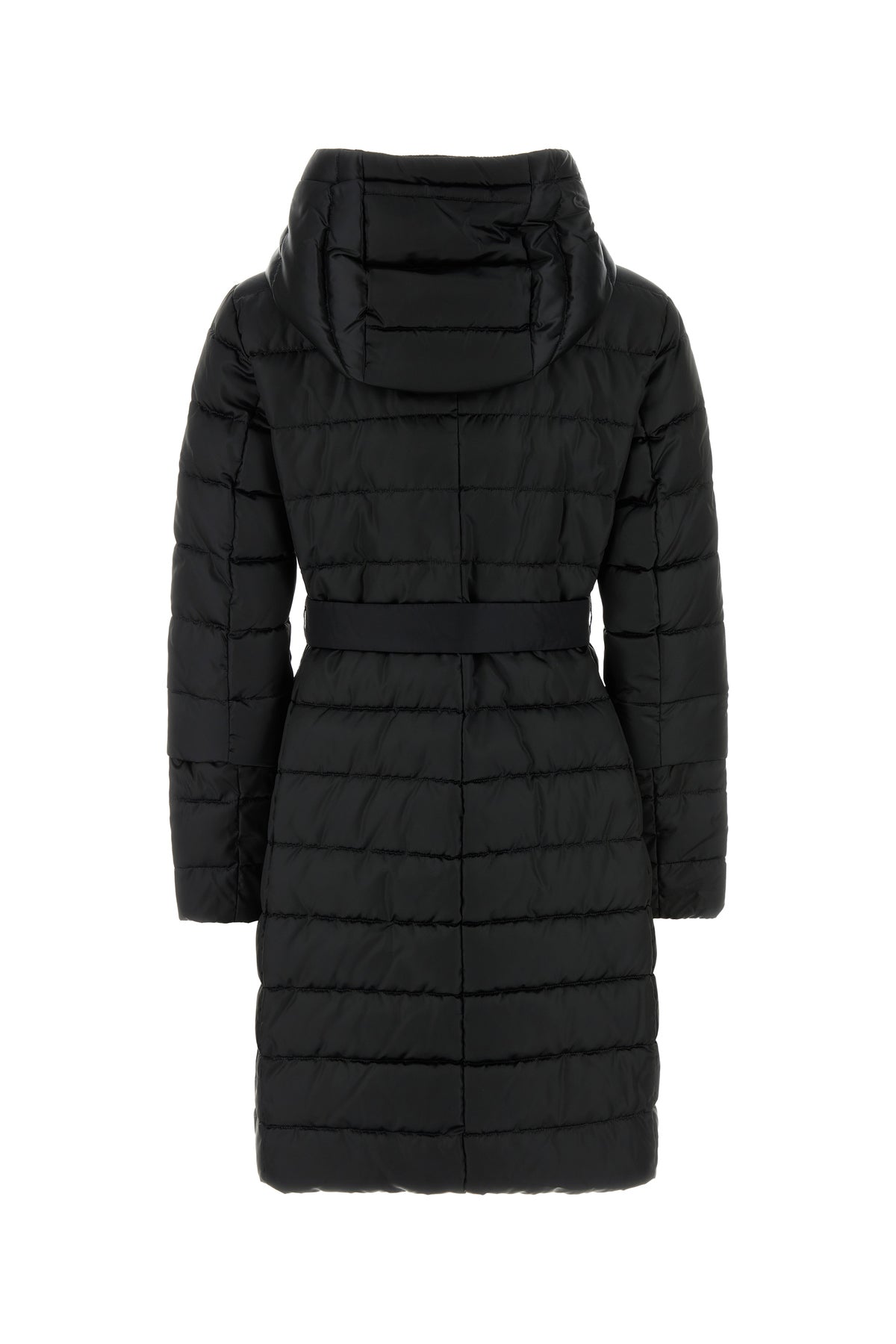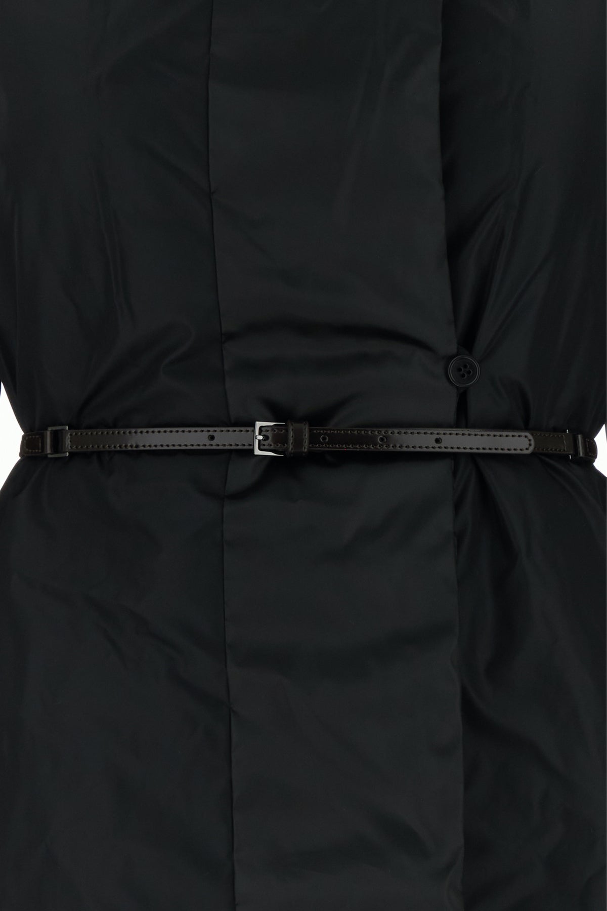Down jacket realized in quilted nylon blend enriched by detachable belt to tie at the waist.