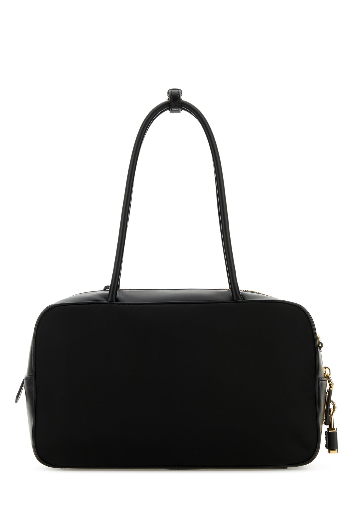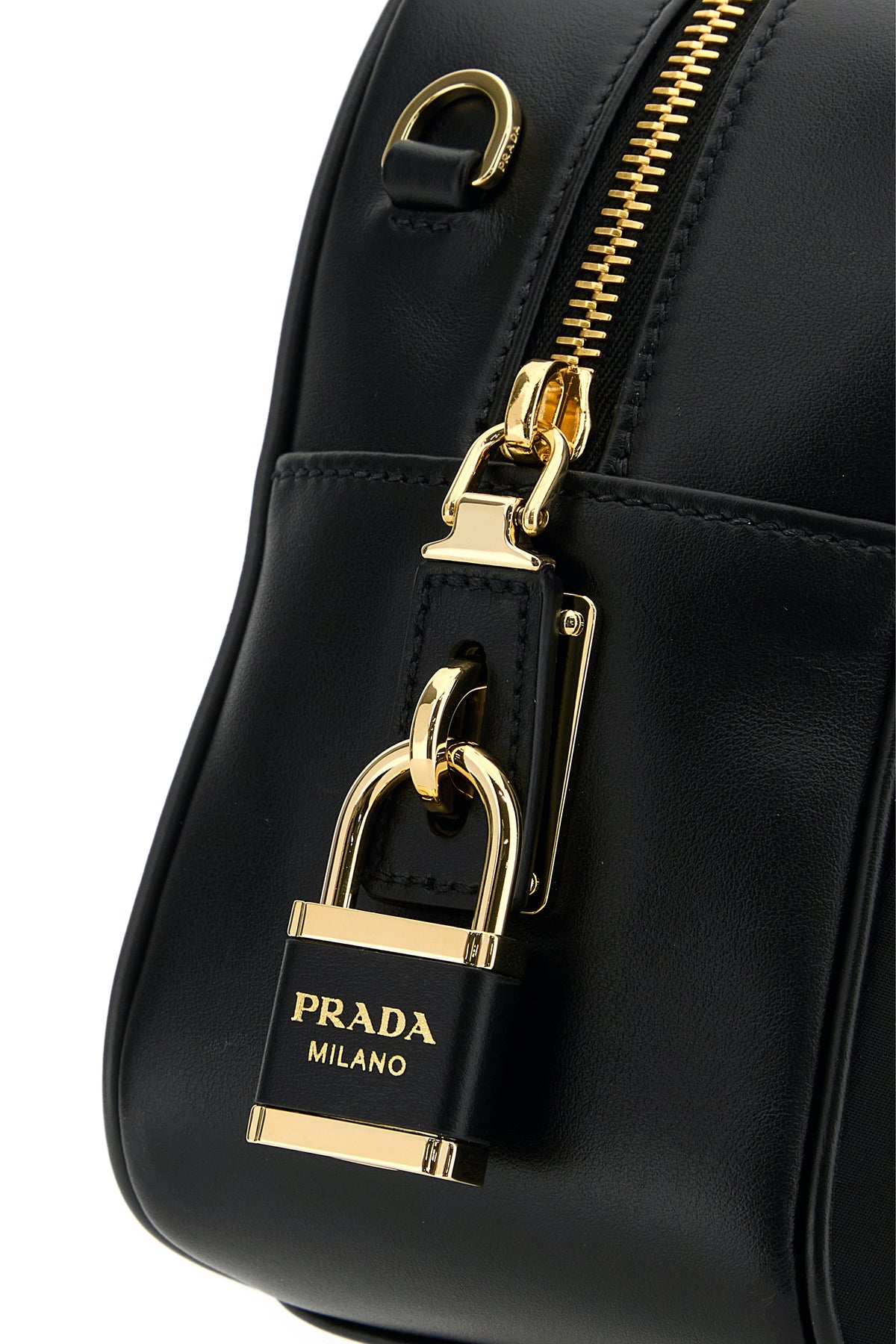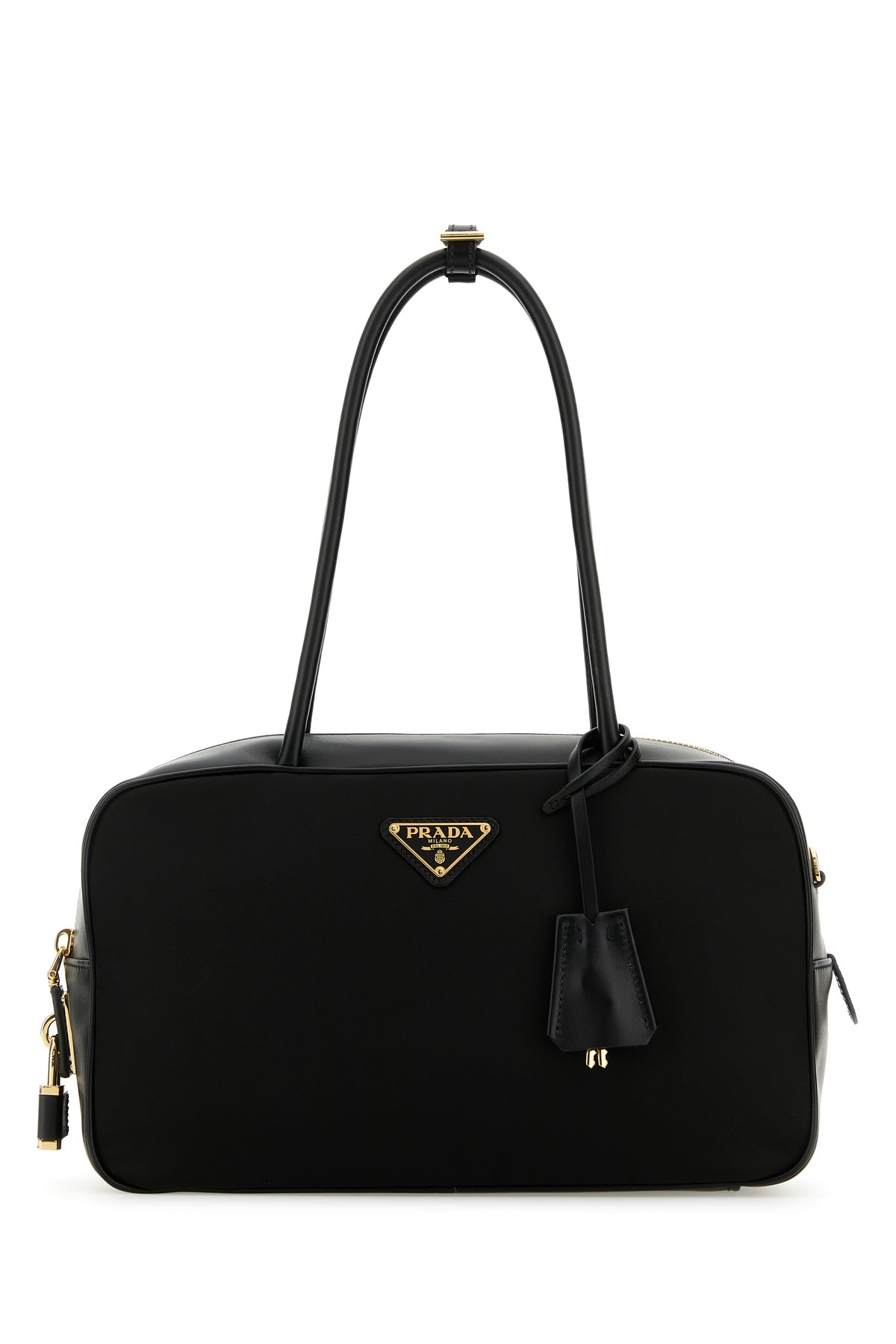 Handbag realized in nylon with tonal smooth leather inserts at the top, on the sides and on the hemline enriched by iconic metal logoed triangle at the front, metal and leather logoed padlock on the side and detachable tonal leather accessory.
