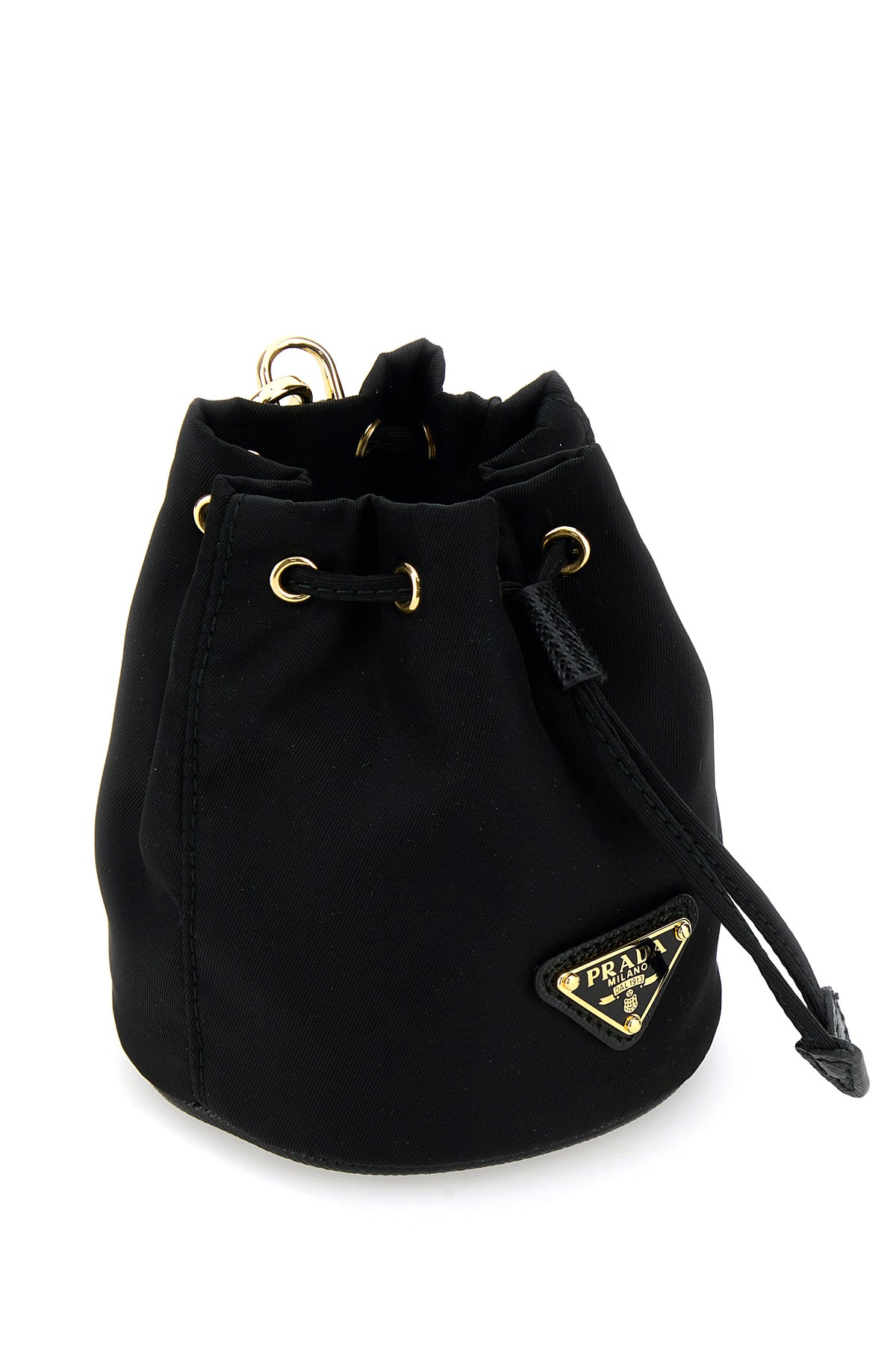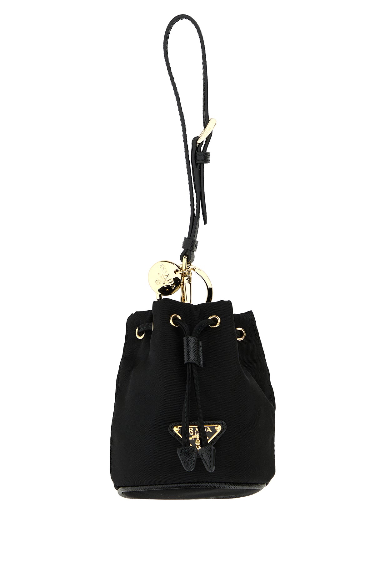 Wrist pouch realized in nylon enriched by iconic metal logoed triangle at the front.