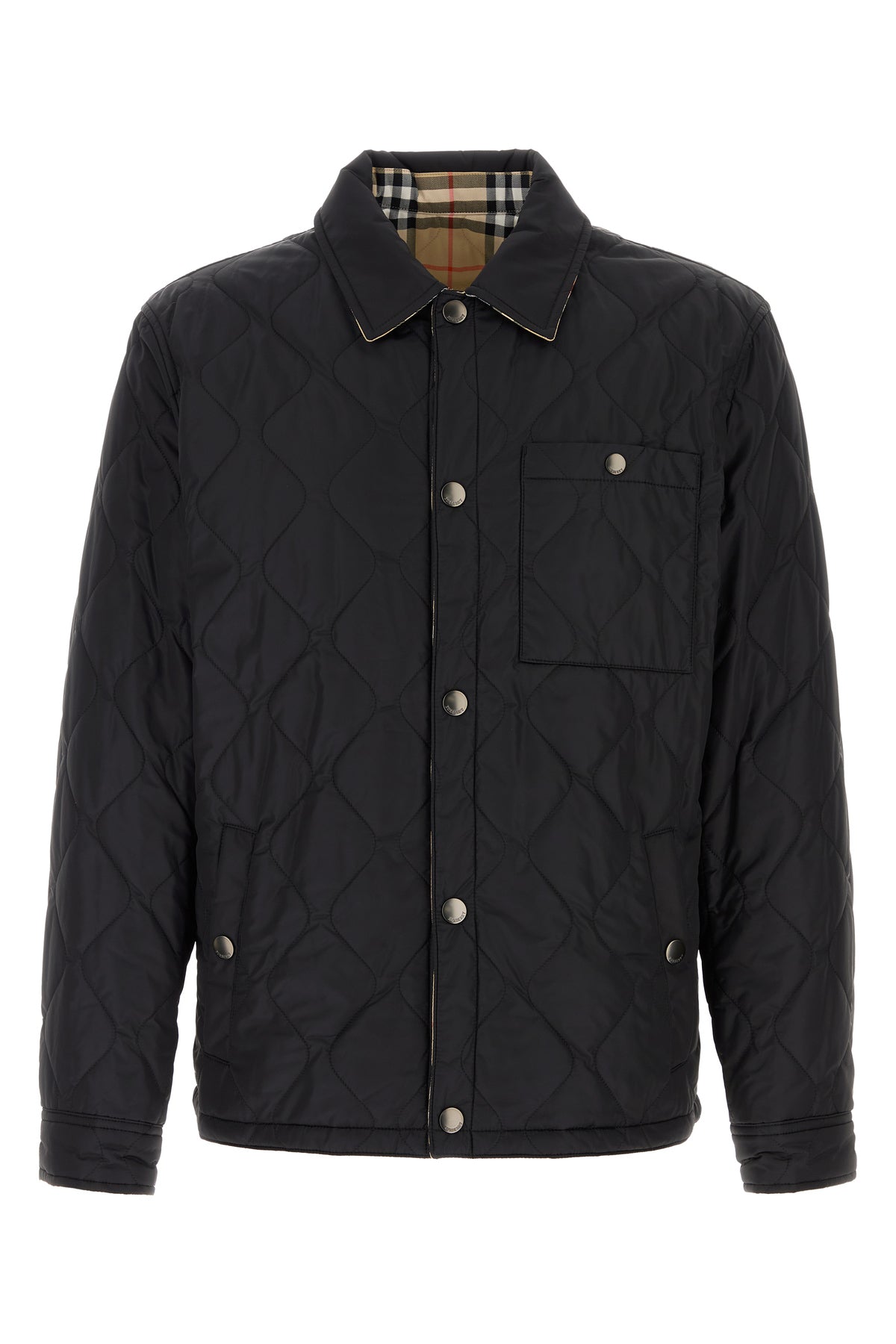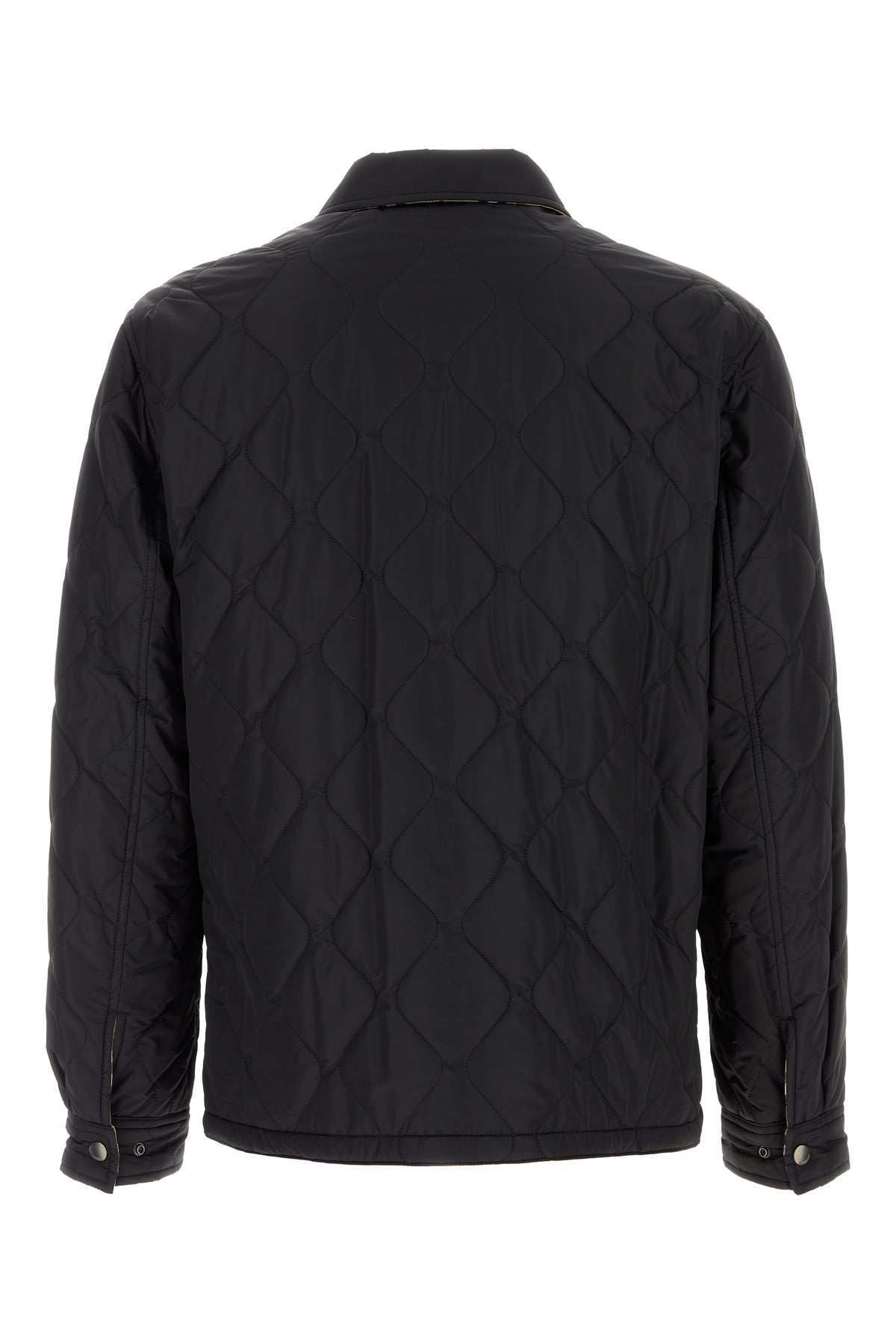 Reversible jacket realized in quilted nylon characterized by collar.