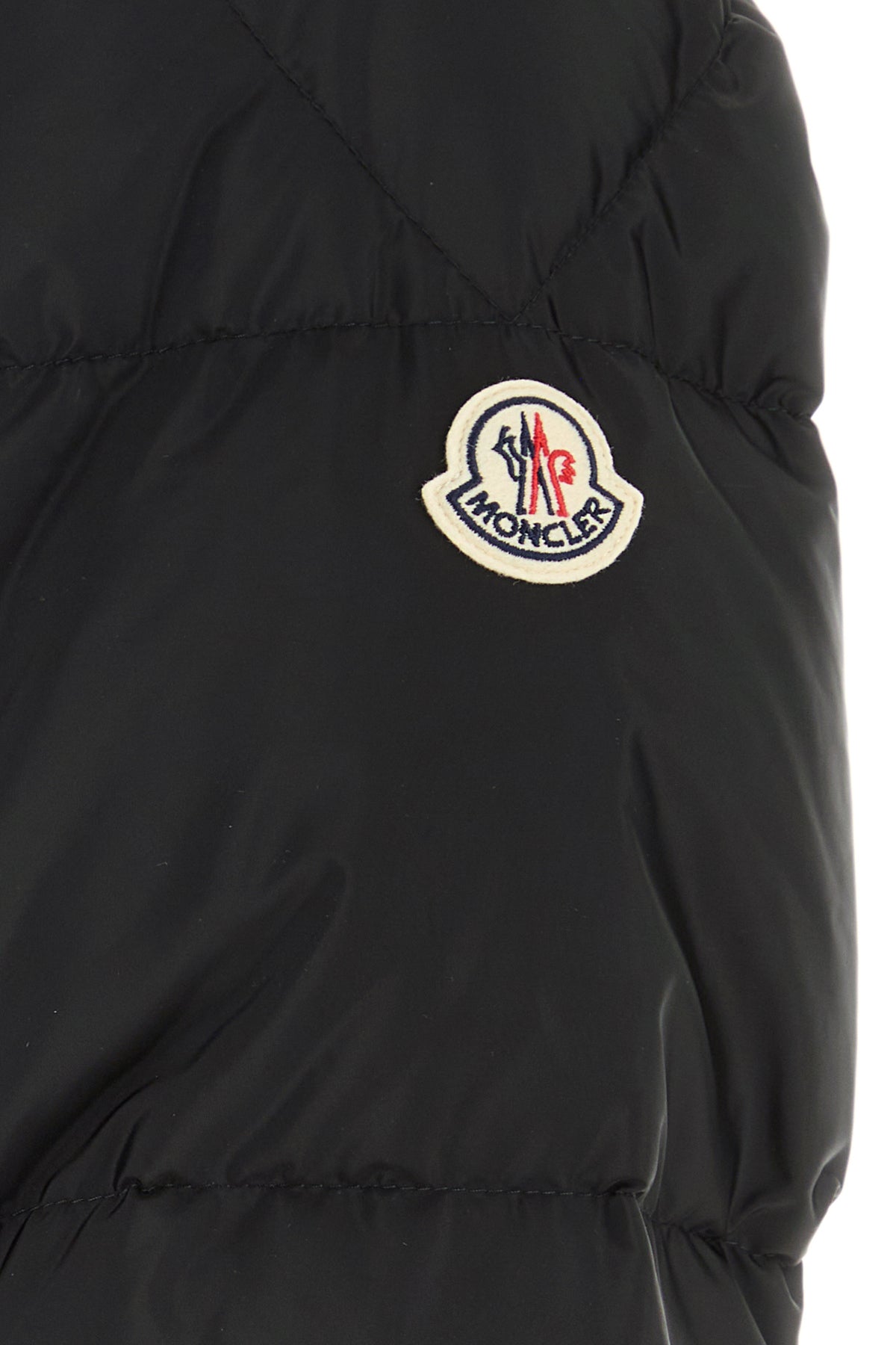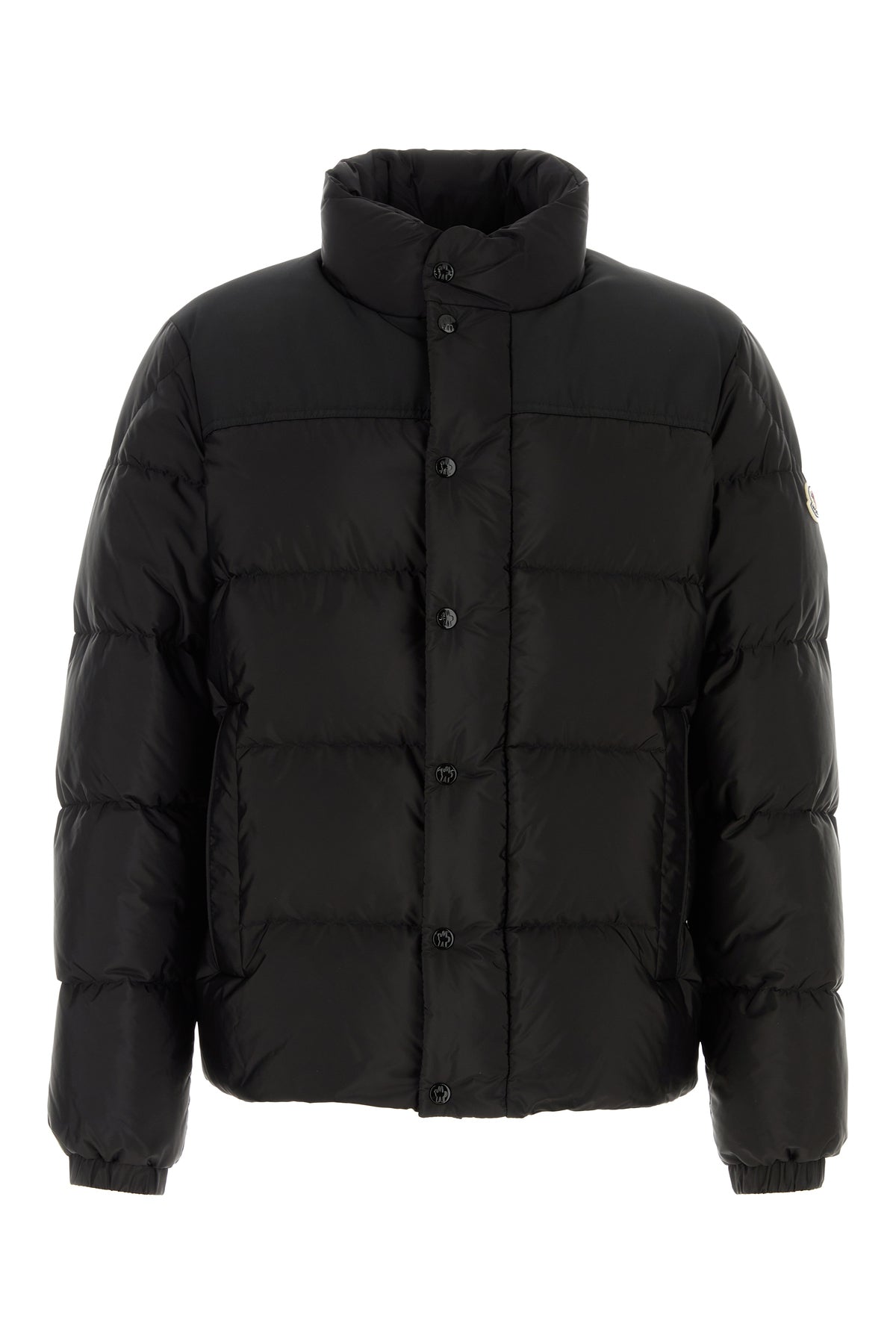 Down jacket realized in quilted nylon enriched by contrasting logoed patch on the sleeve.