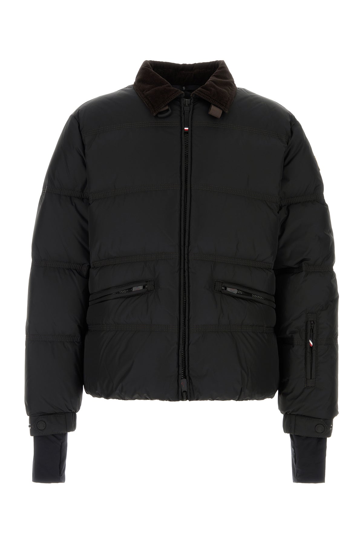 Down jacket realized in quilted nylon enriched by contrasting logoed patch on the sleeve.