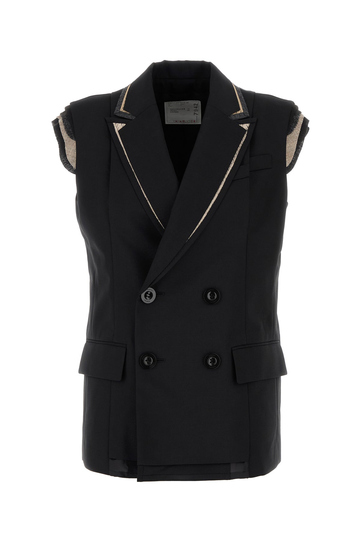 Vest realized in polyester blend characterized by peak lapels.