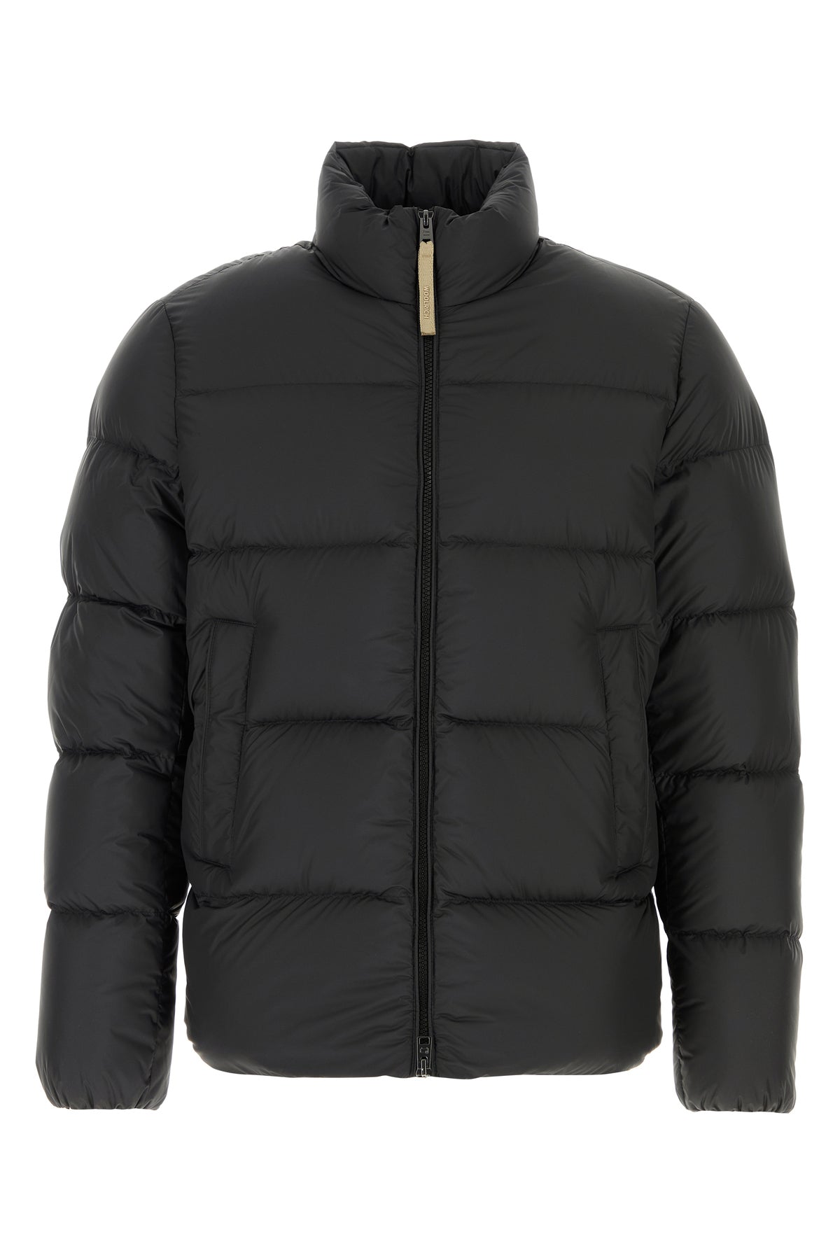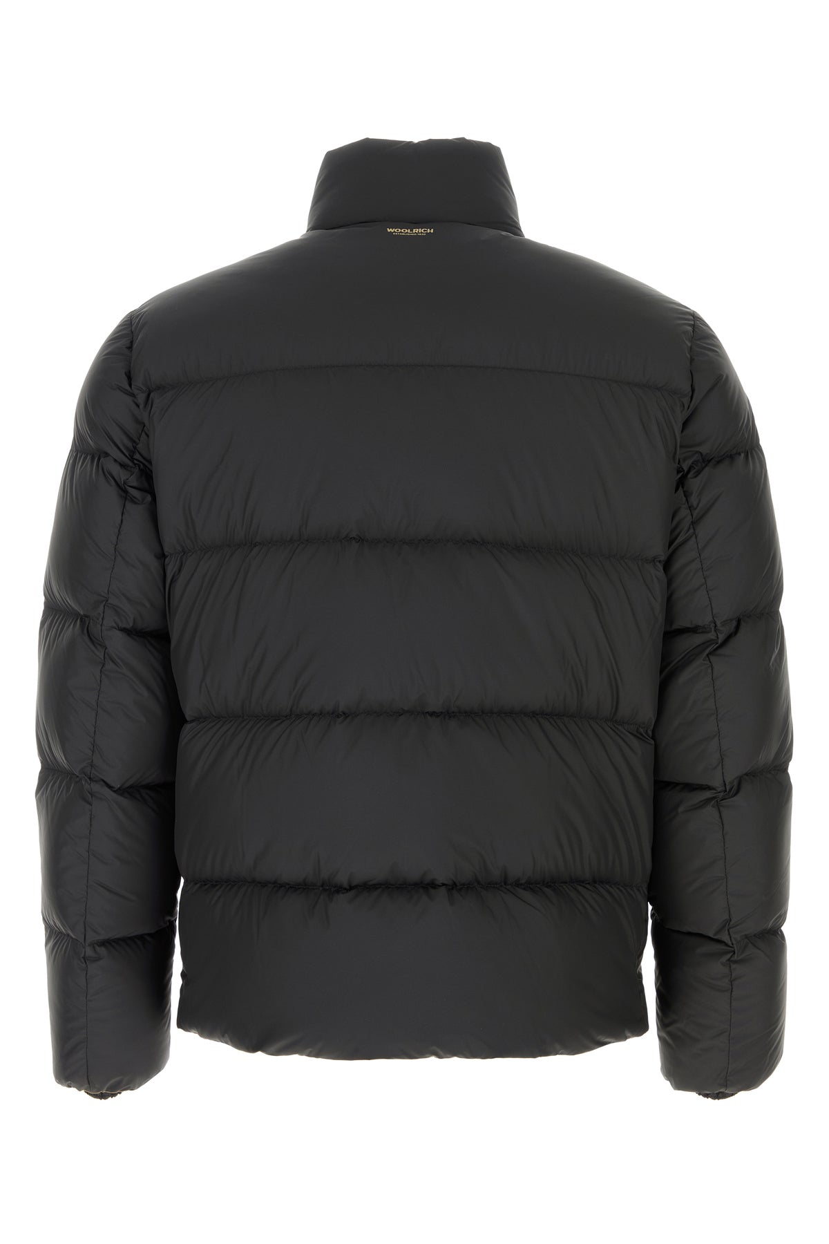Down jacket realized in quilted polyester characterized by contrasting printed logo at the back.