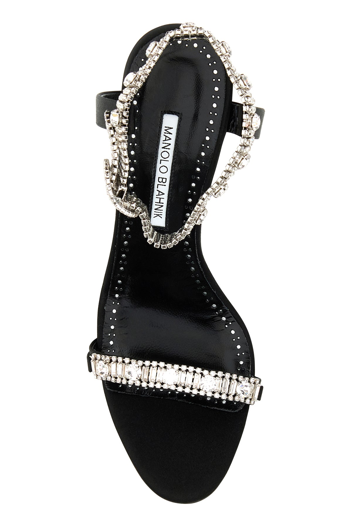 Sandals realized in satin enriched by jewel patches at the front and on the adjustable ankle strap.