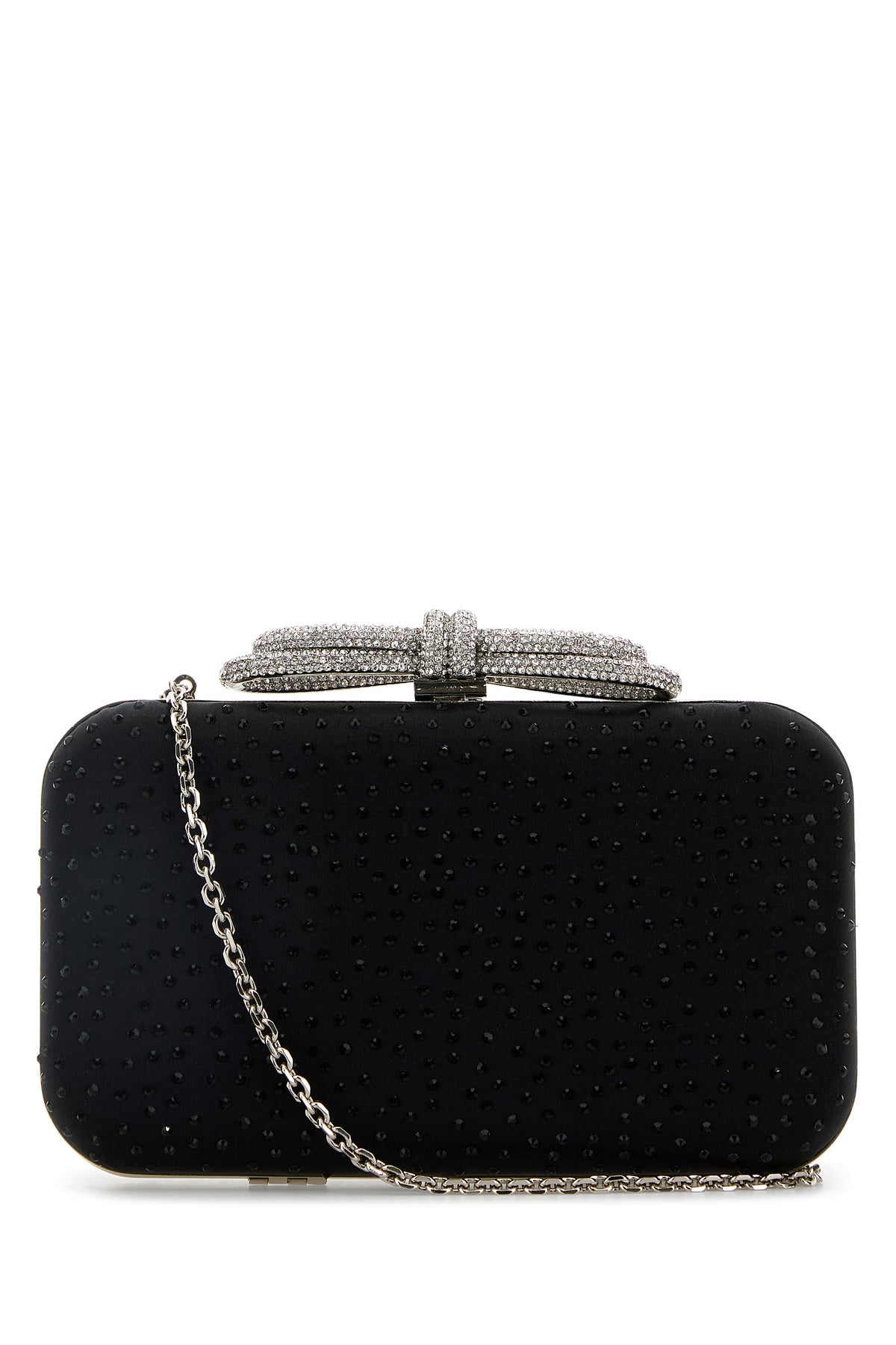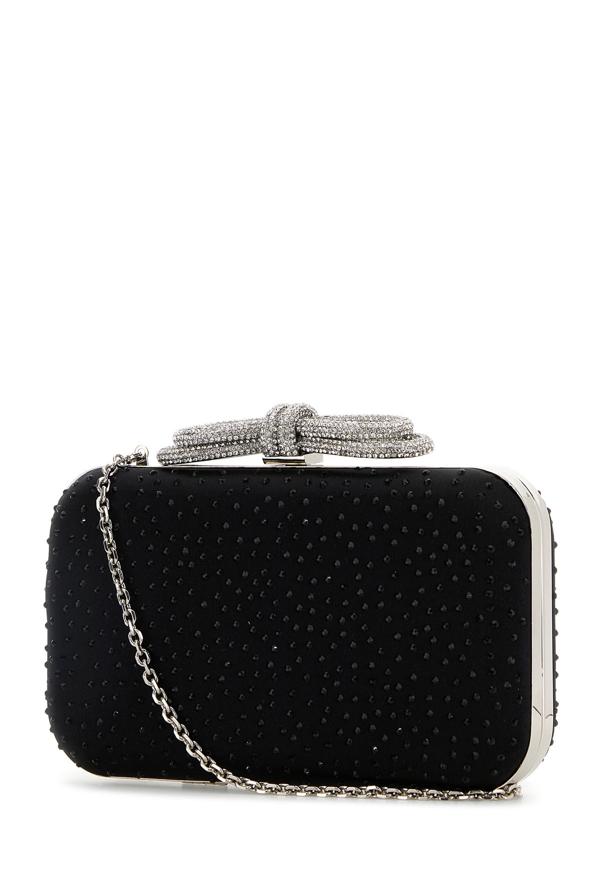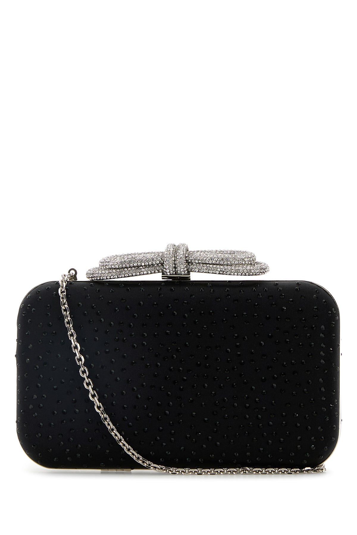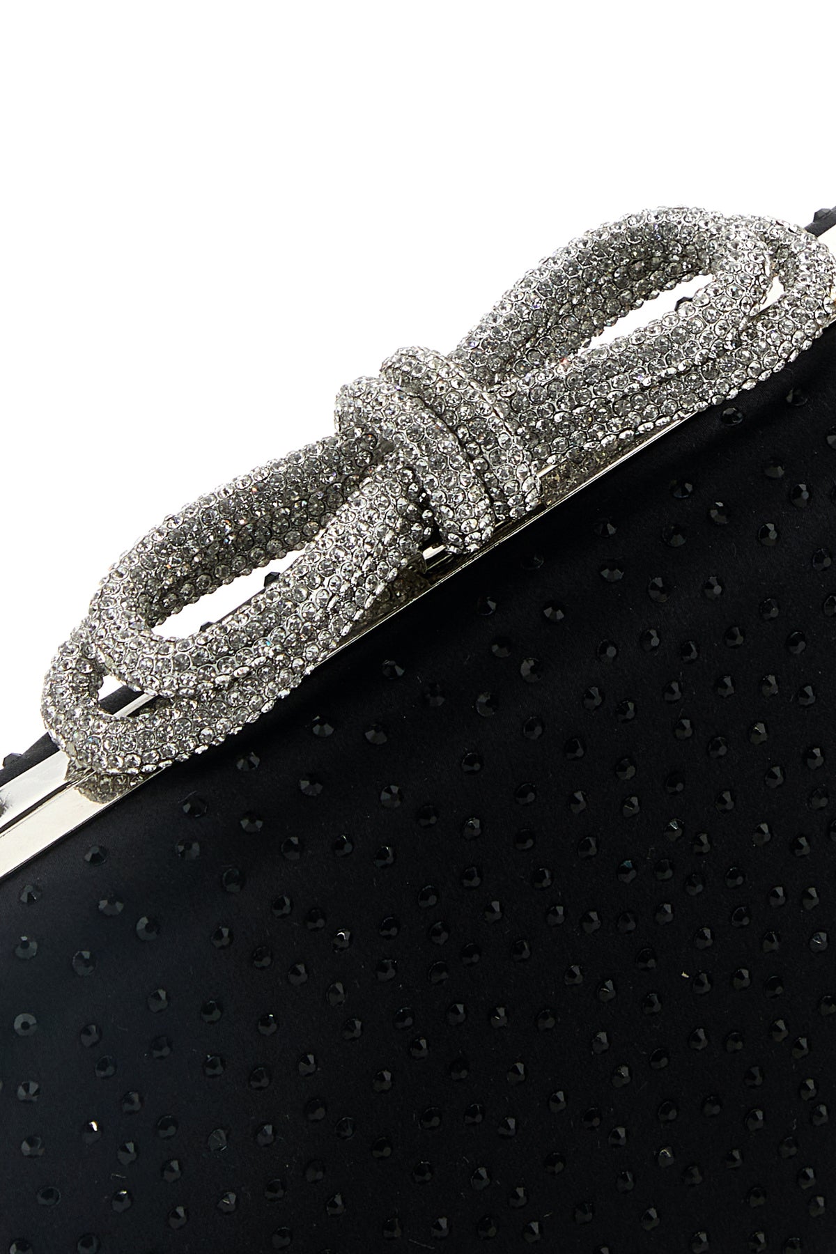 Clutch realized in satin enriched by rhinestones at the front and at the back and decorative rhinestones jewel bow at the top.