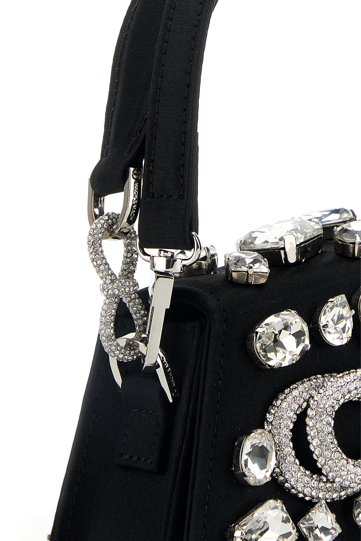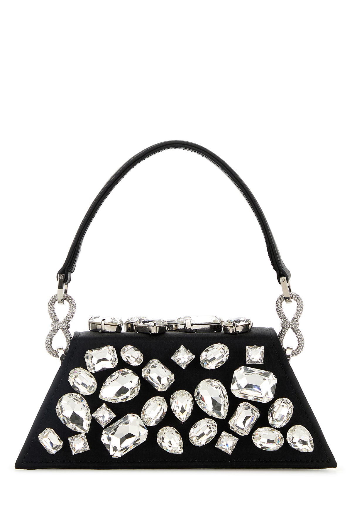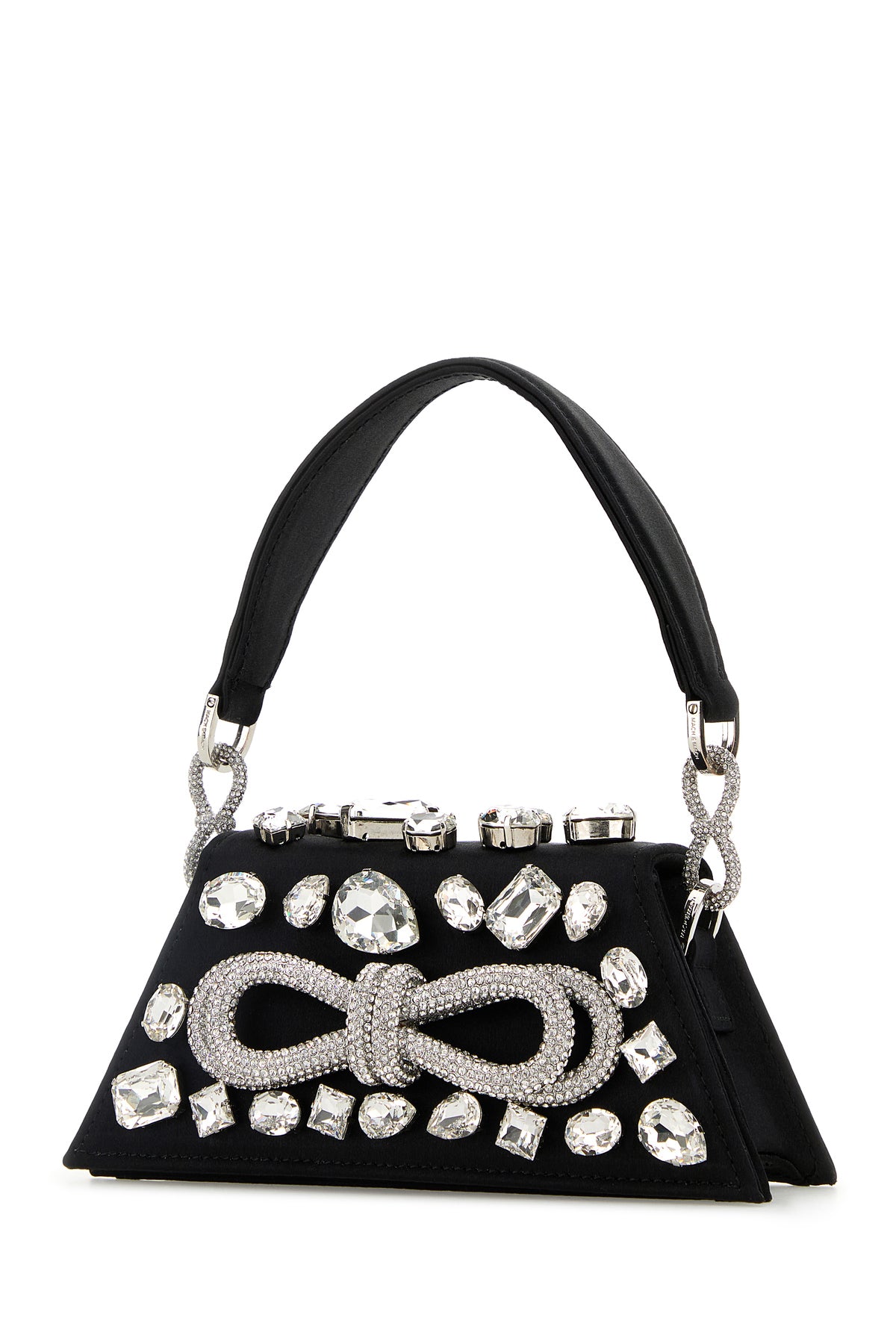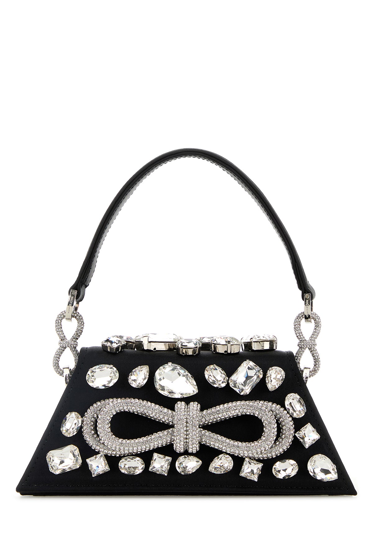 Handbag realized in satin enriched by rhinestones at the front and at the back, decorative rhinestones jewel bow at the front and rhinestones jewel bows on the handle.