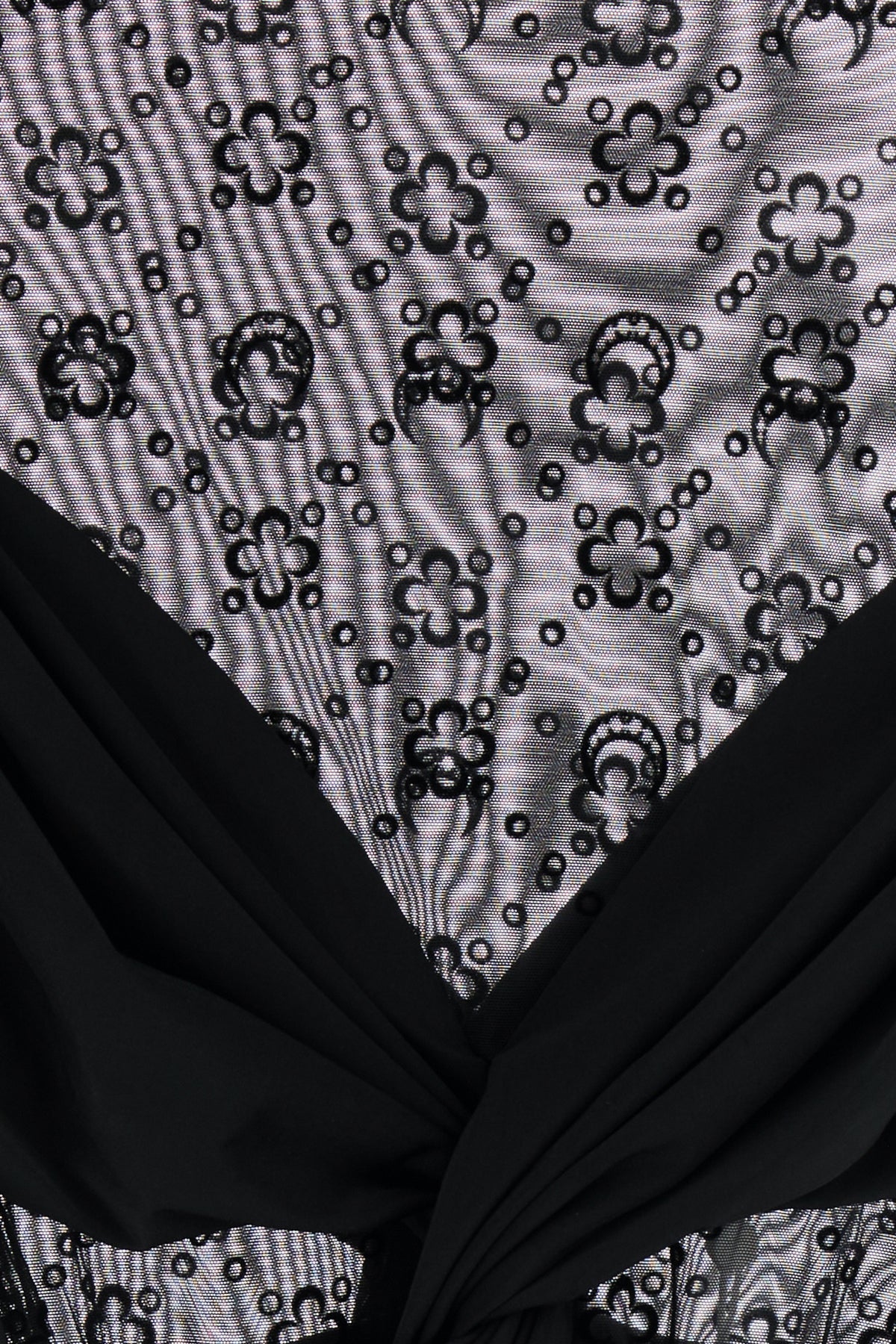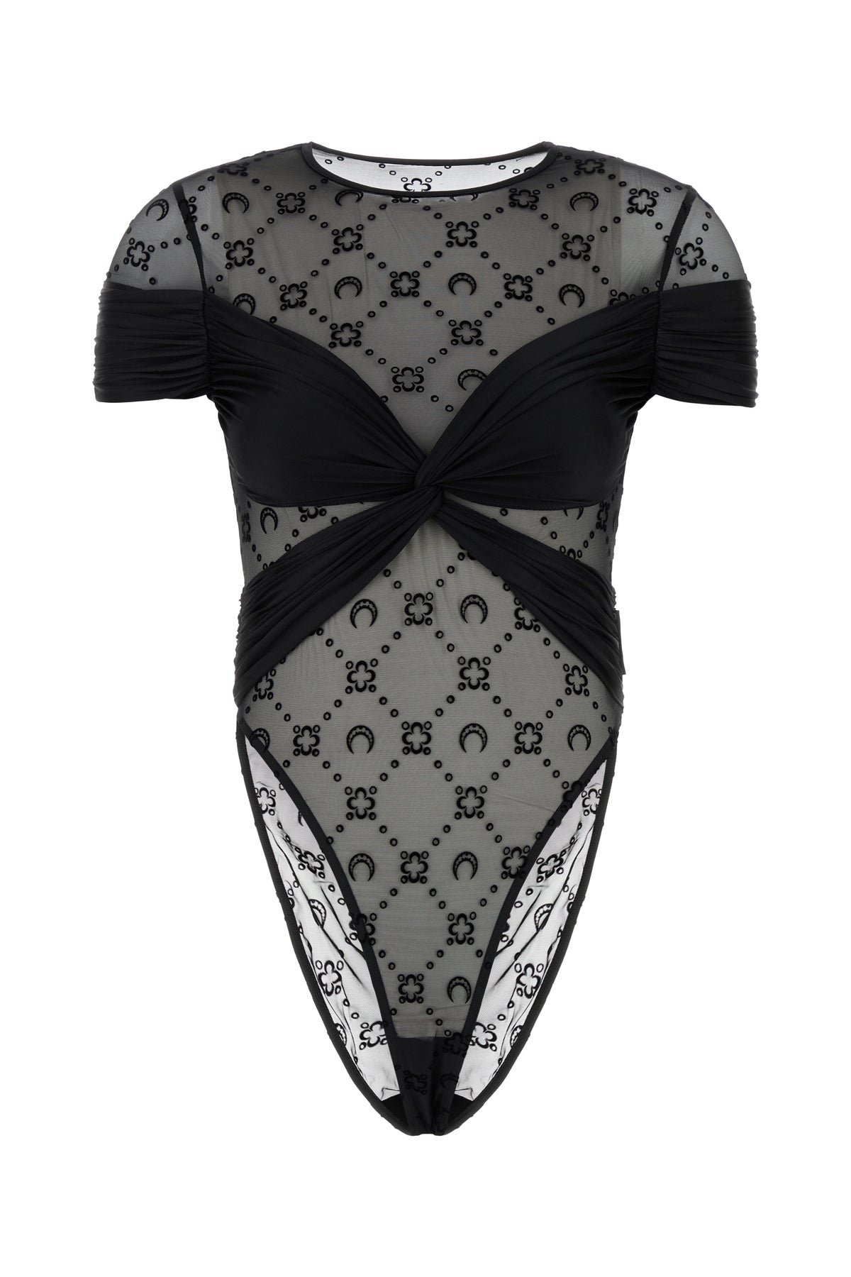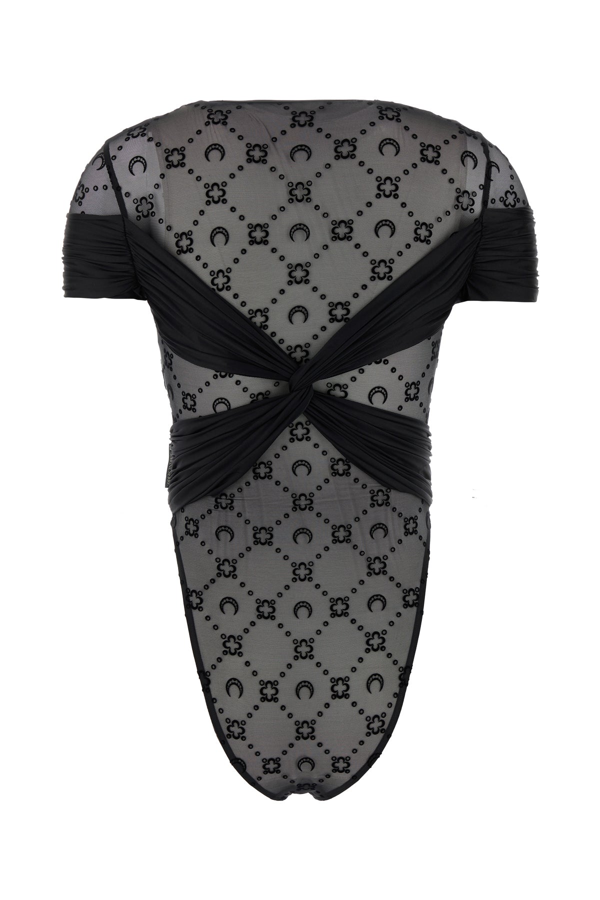 See-through bodysuit realized in stretch nylon with insert at the top characterized by flocked logoed print on the entire surface.