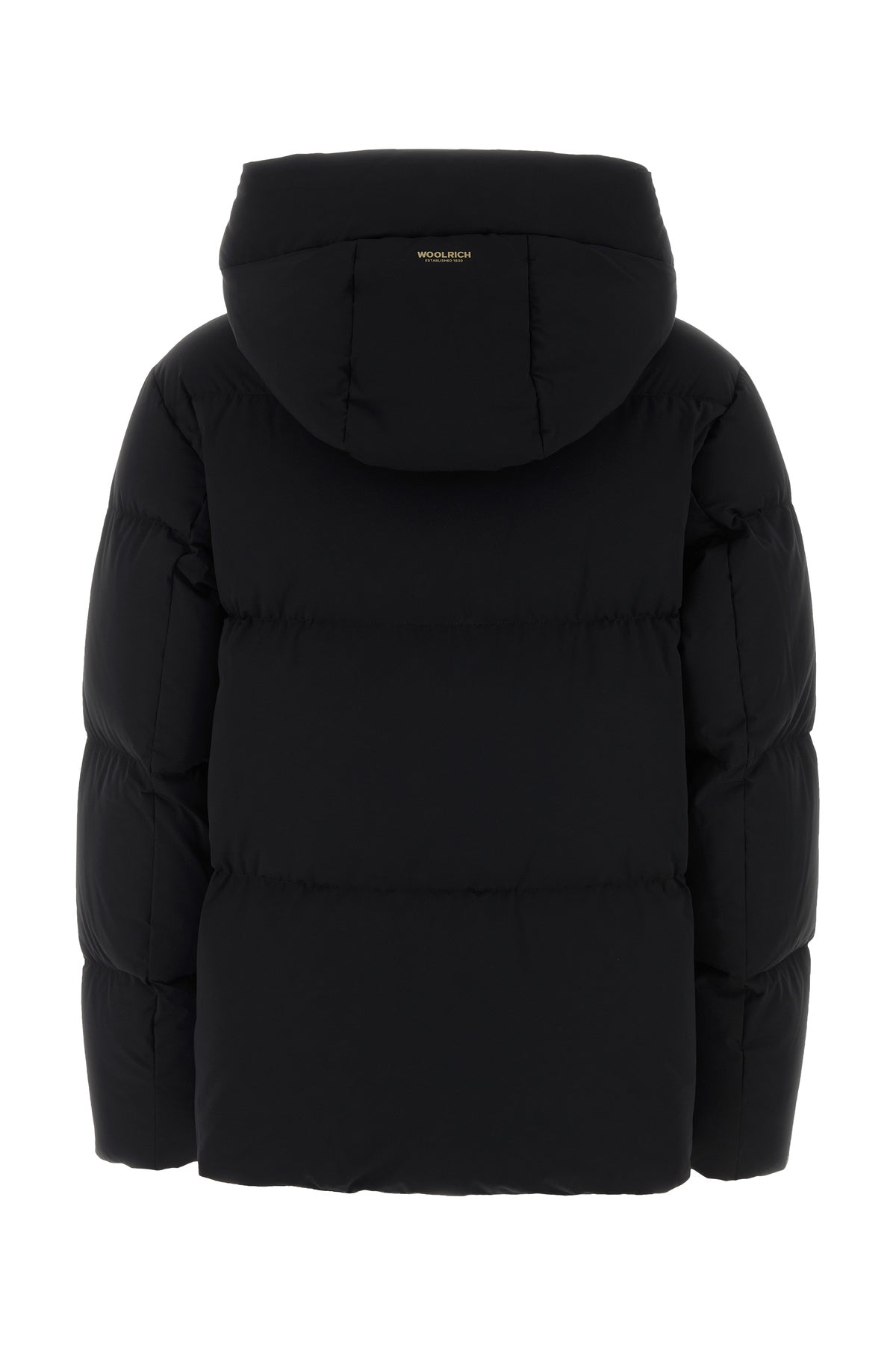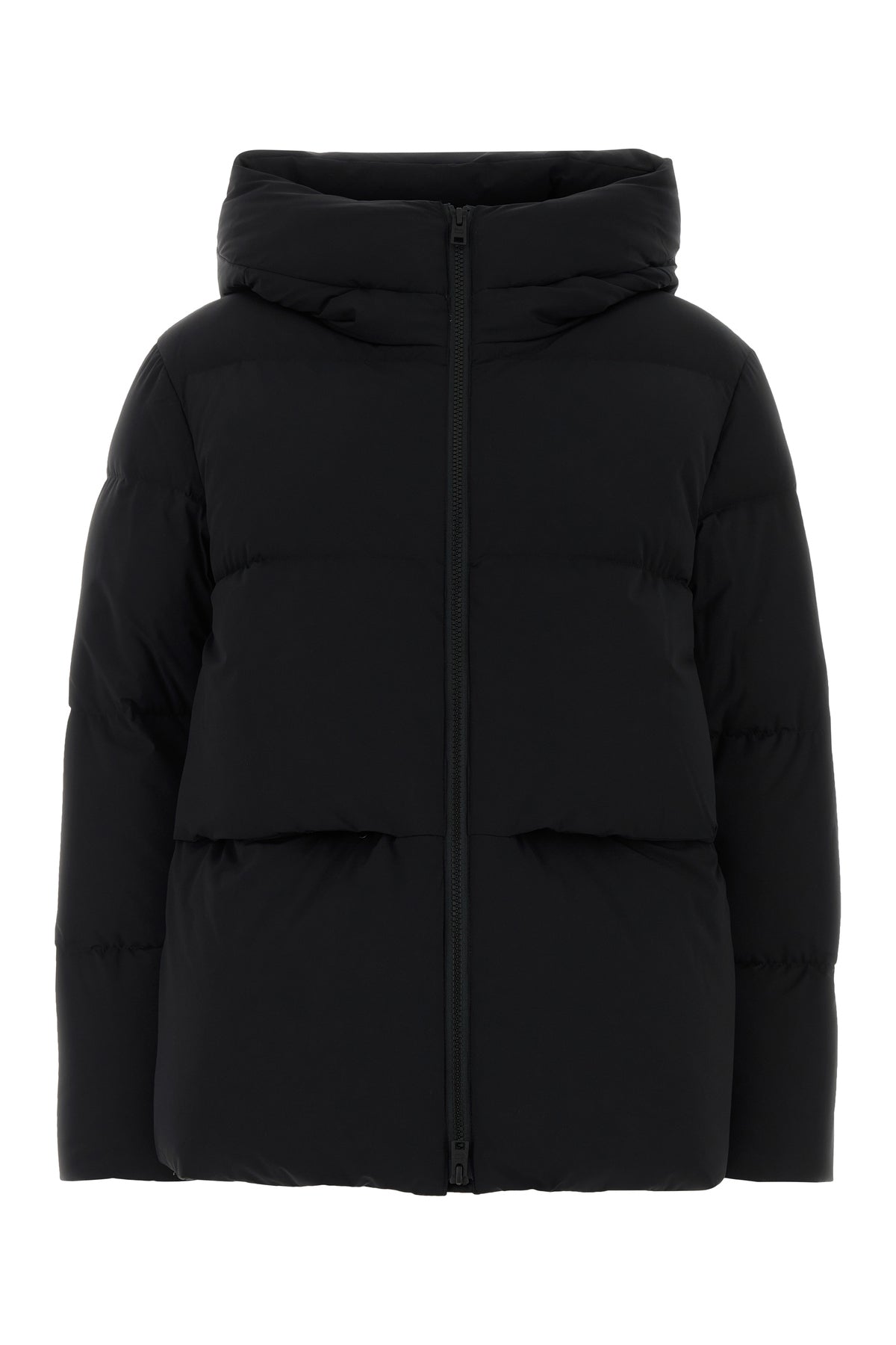 Down jacket realized in quilted stretch nylon characterized by printed logo on the hood.