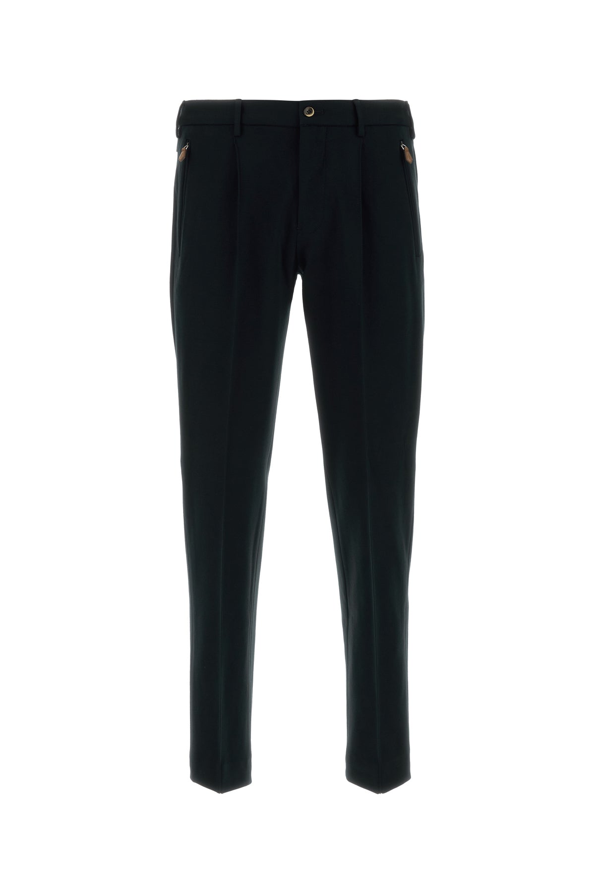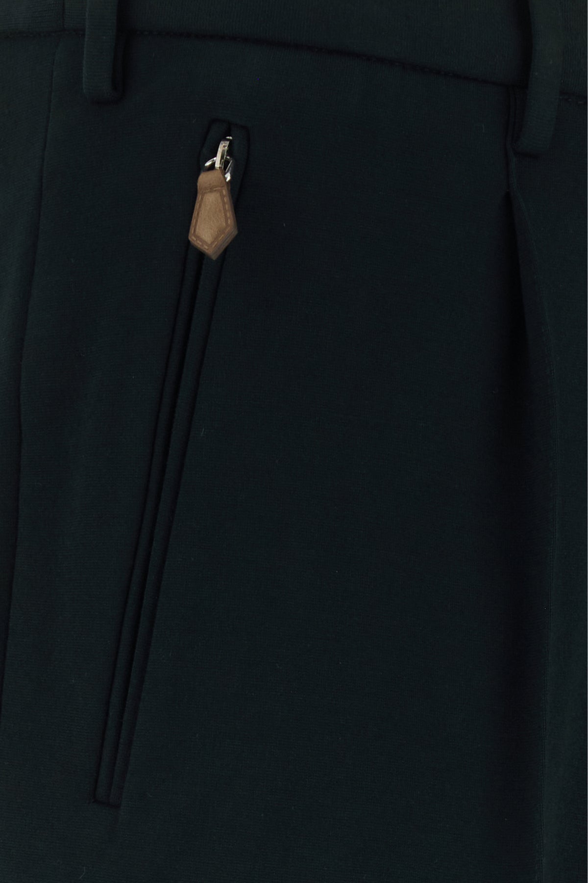 Pant realized in stretch viscose blend characterized by inverted pleats.