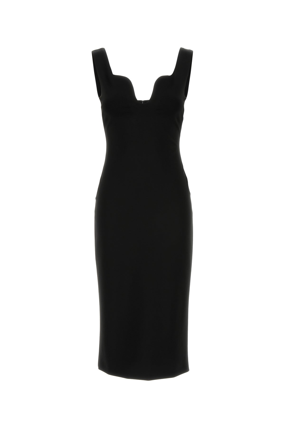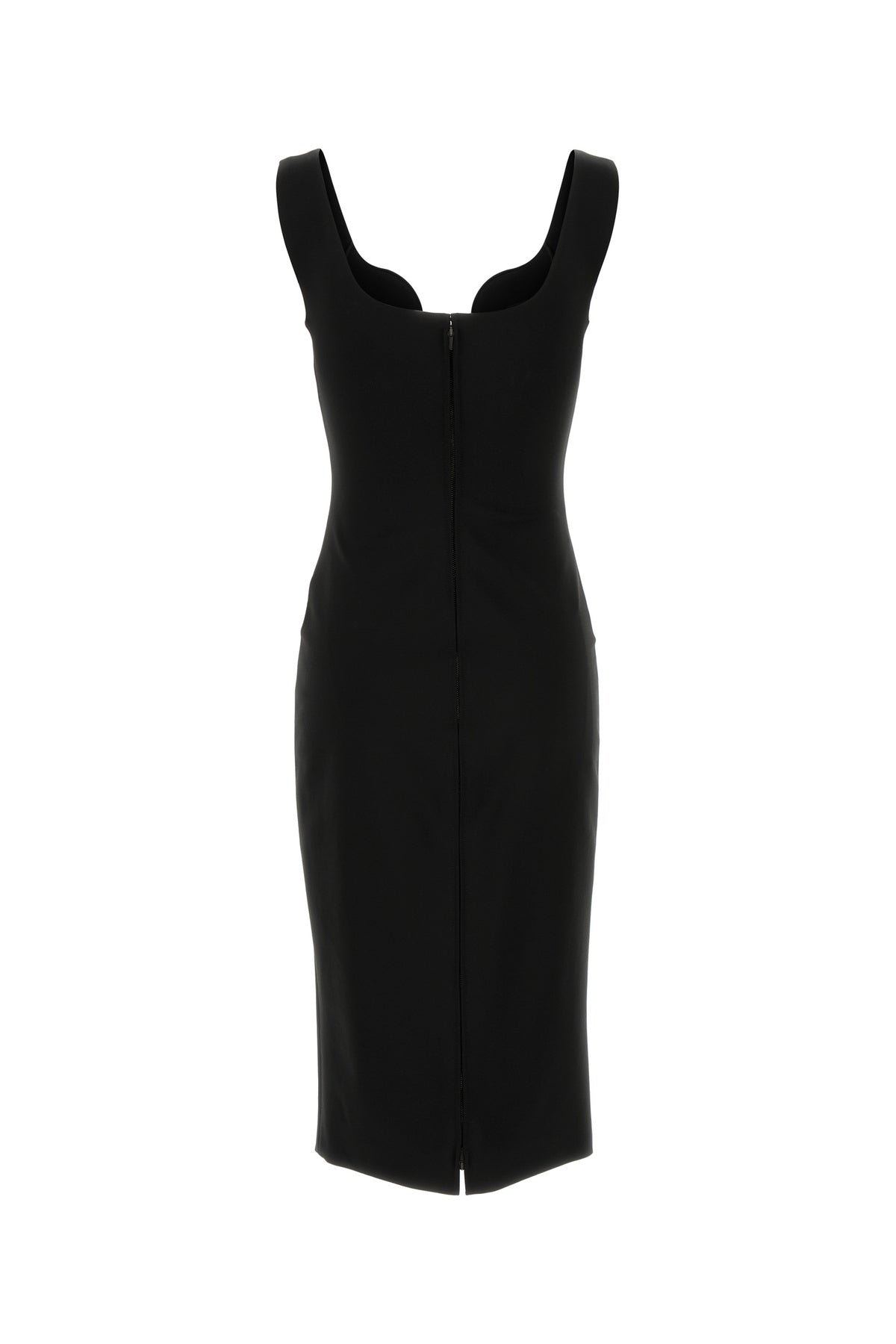 Sheath dress realized in stretch viscose blend characterized by peculiar neckline.