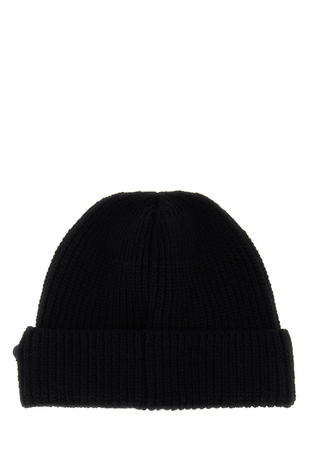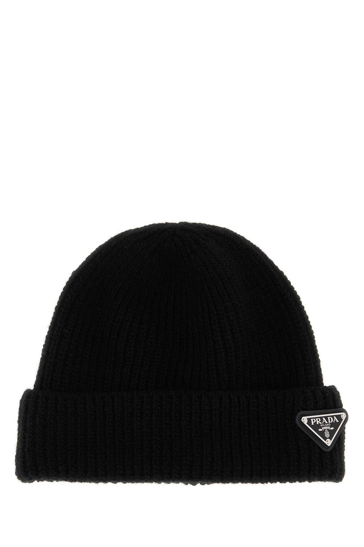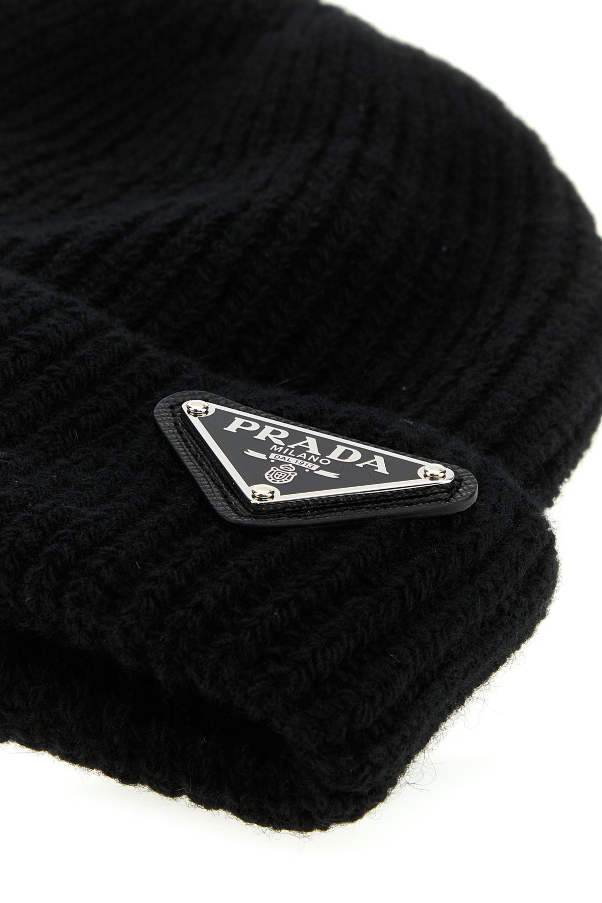 Beanie hat realized in ribbed virgin wool blend enriched by metal iconic logoed triangle on the side.