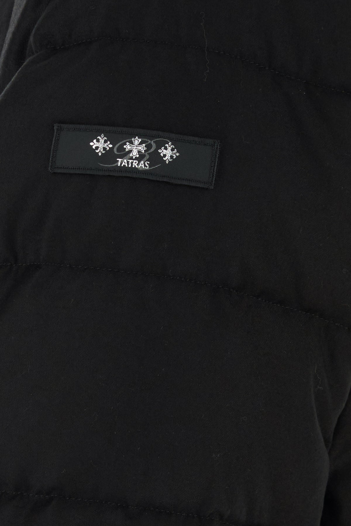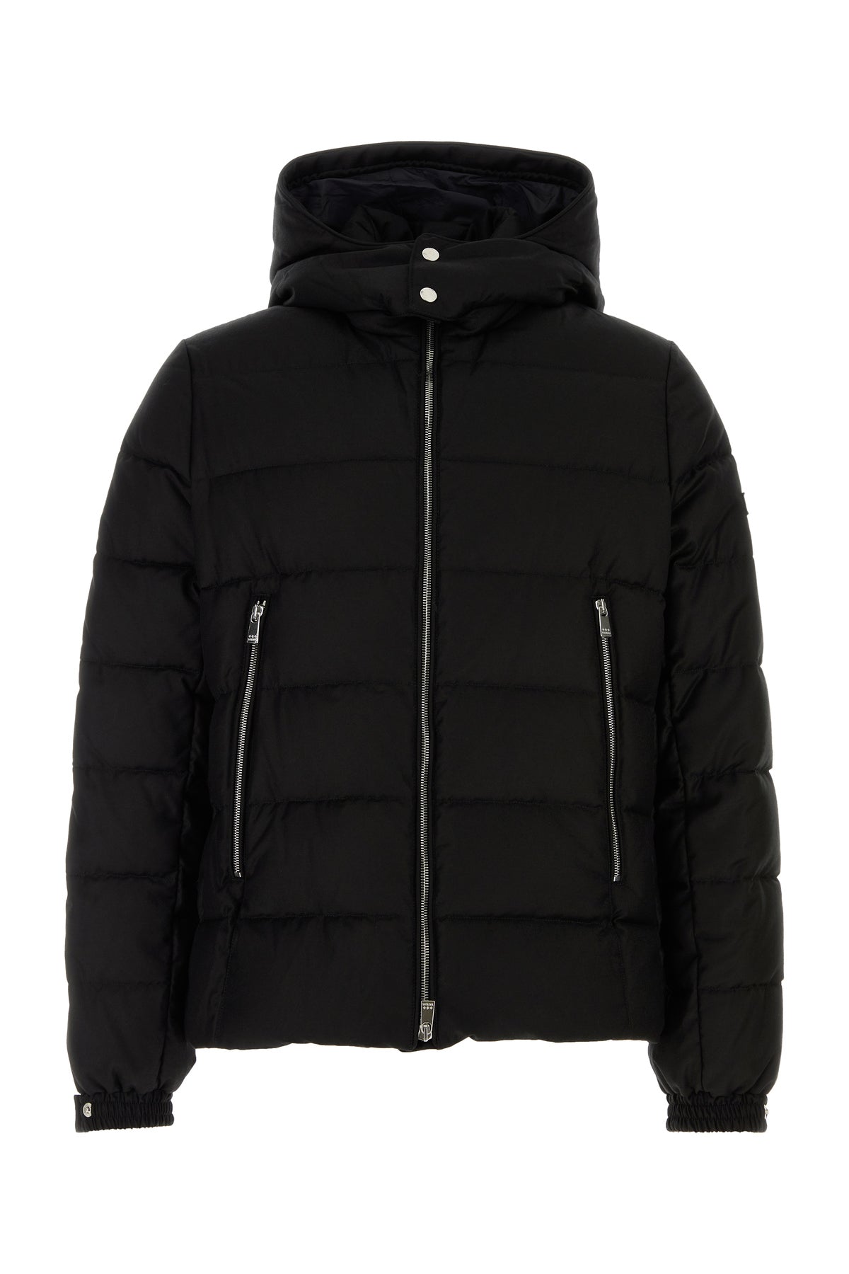 Down jacket realized in wool and silk enriched by logoed label on the sleeve.