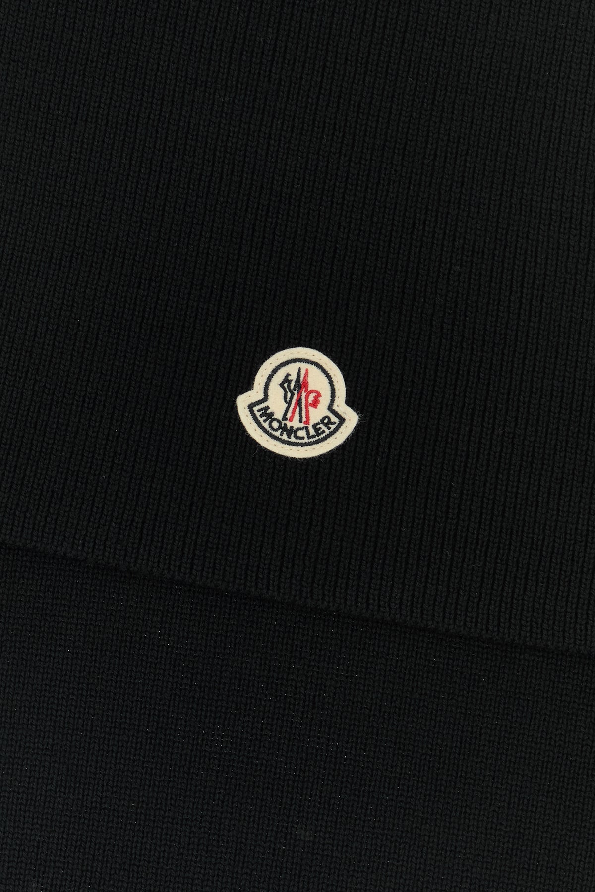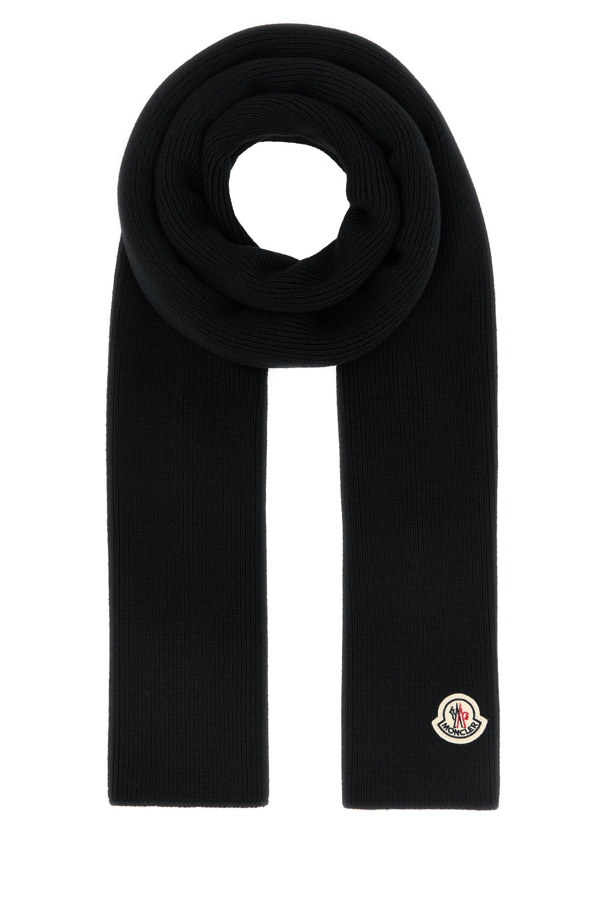 Scarf realized in ribbed pure virgin wool enriched by contrasting logoed patch at the front.