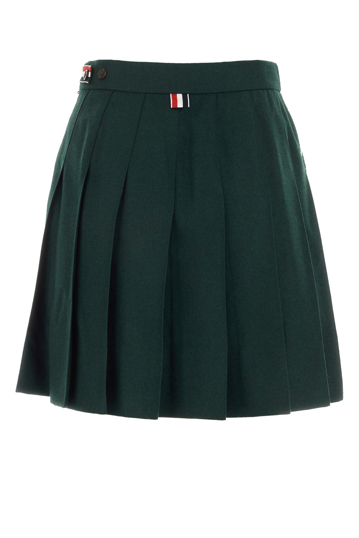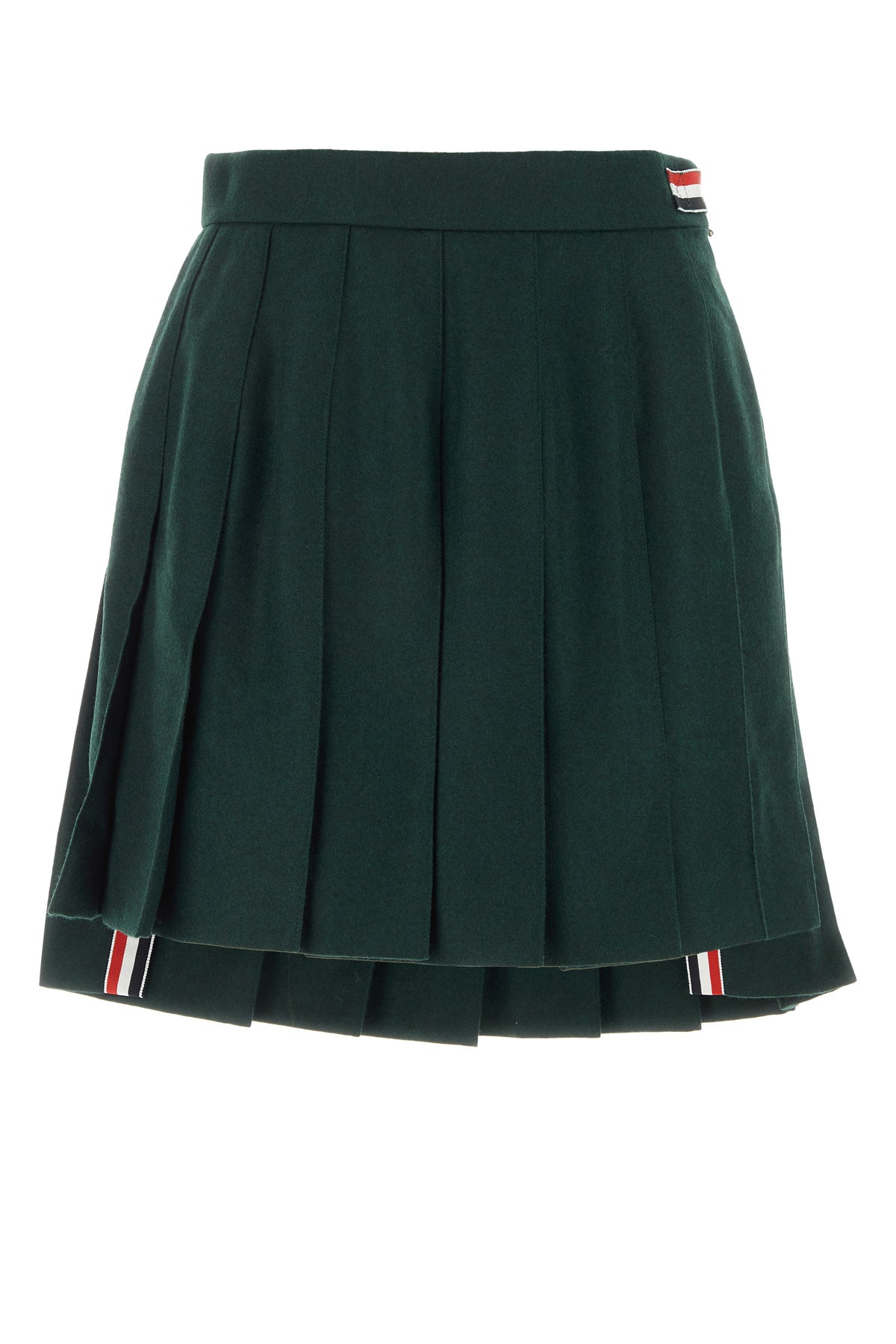 Pleated mini skirt realized in wool and polyester enriched by iconic tricolor label at the back.