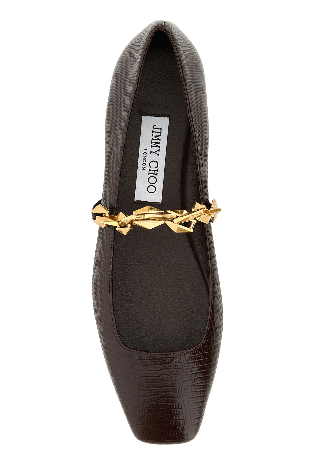 Ballerinas realized in lizard motif embossed leather enriched by Diamond metal chain on the instep.