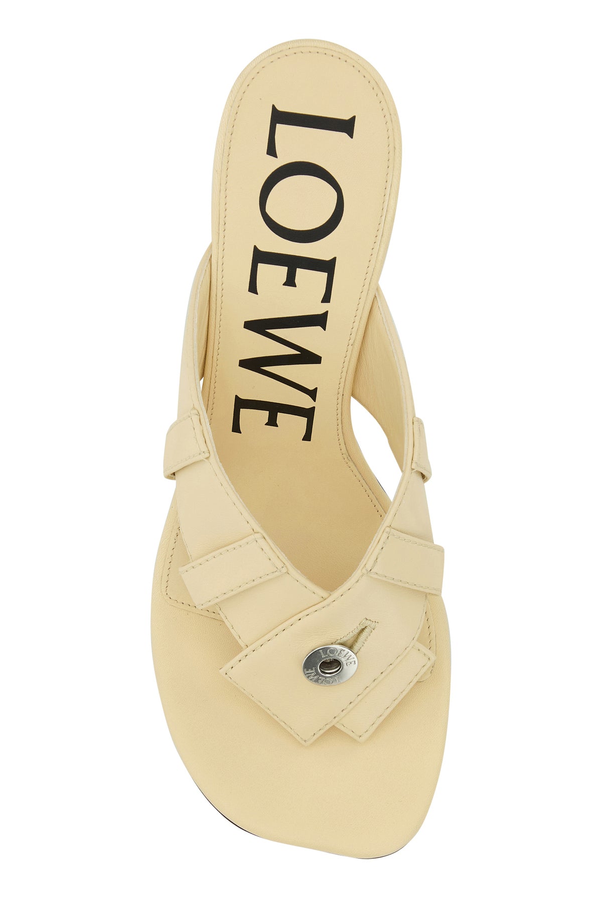 Thong mules realized in lamb nappa leather enriched by decorative loops and button on the bands.