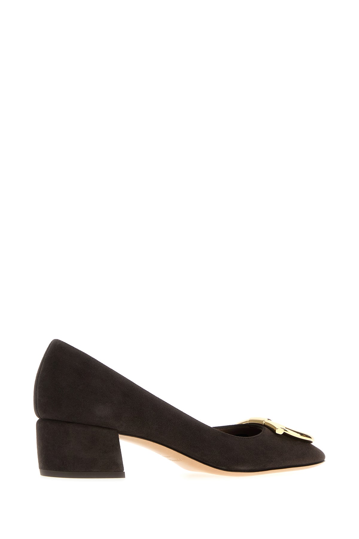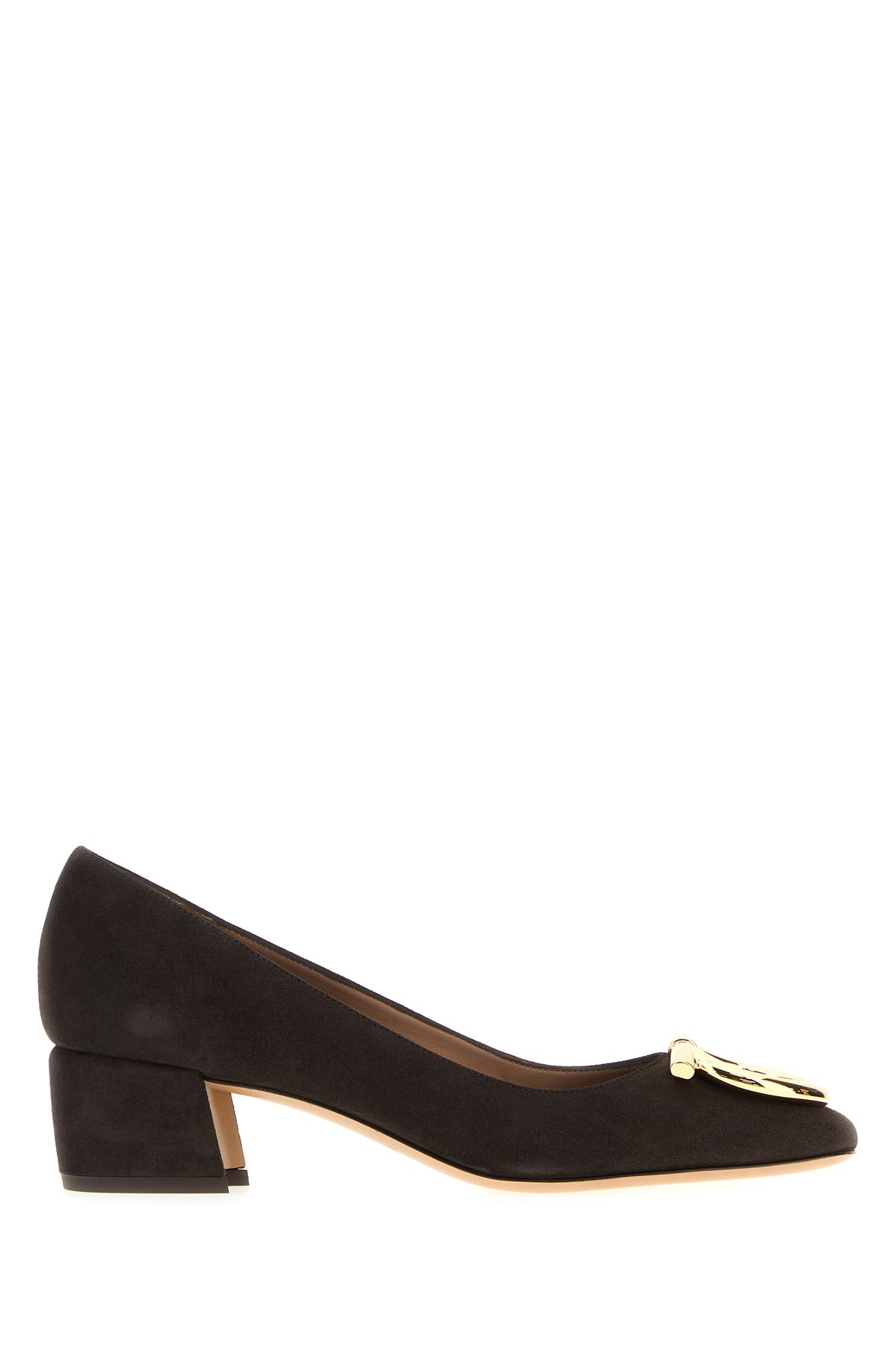 Pumps realized in suede enriched by metal Gancini detail at the front.
