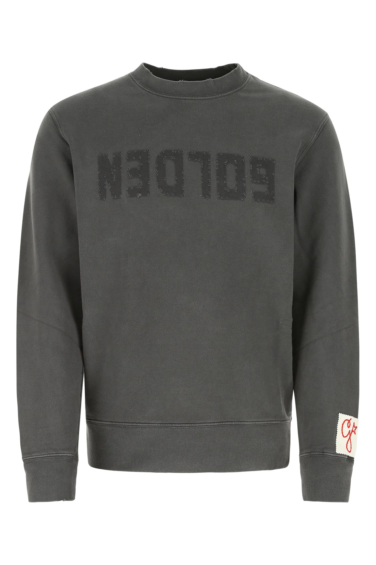 Sweatshirt realized in pure distressed effect cotton characterized by contrasting logoed print at the front enriched by studs at the back and contrasting logoed patch on the sleeve.