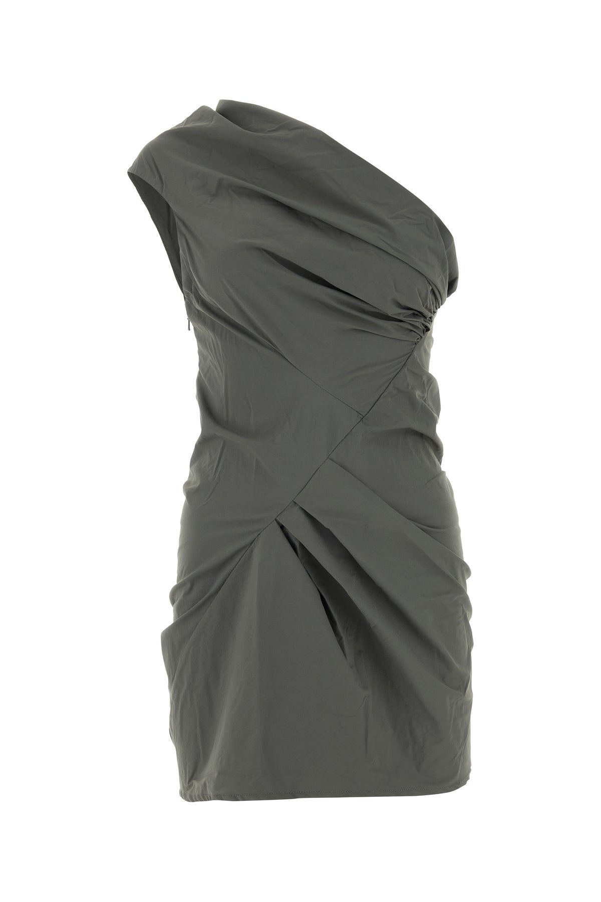 One-shoulder mini dress realized in stretch nylon characterized by gatherings at the front and at the back.