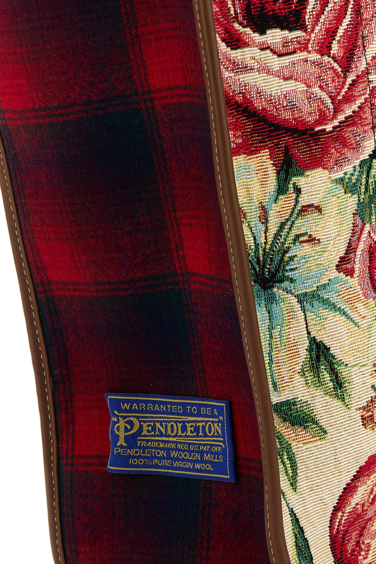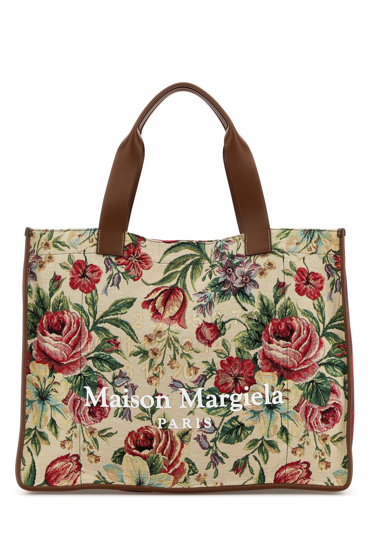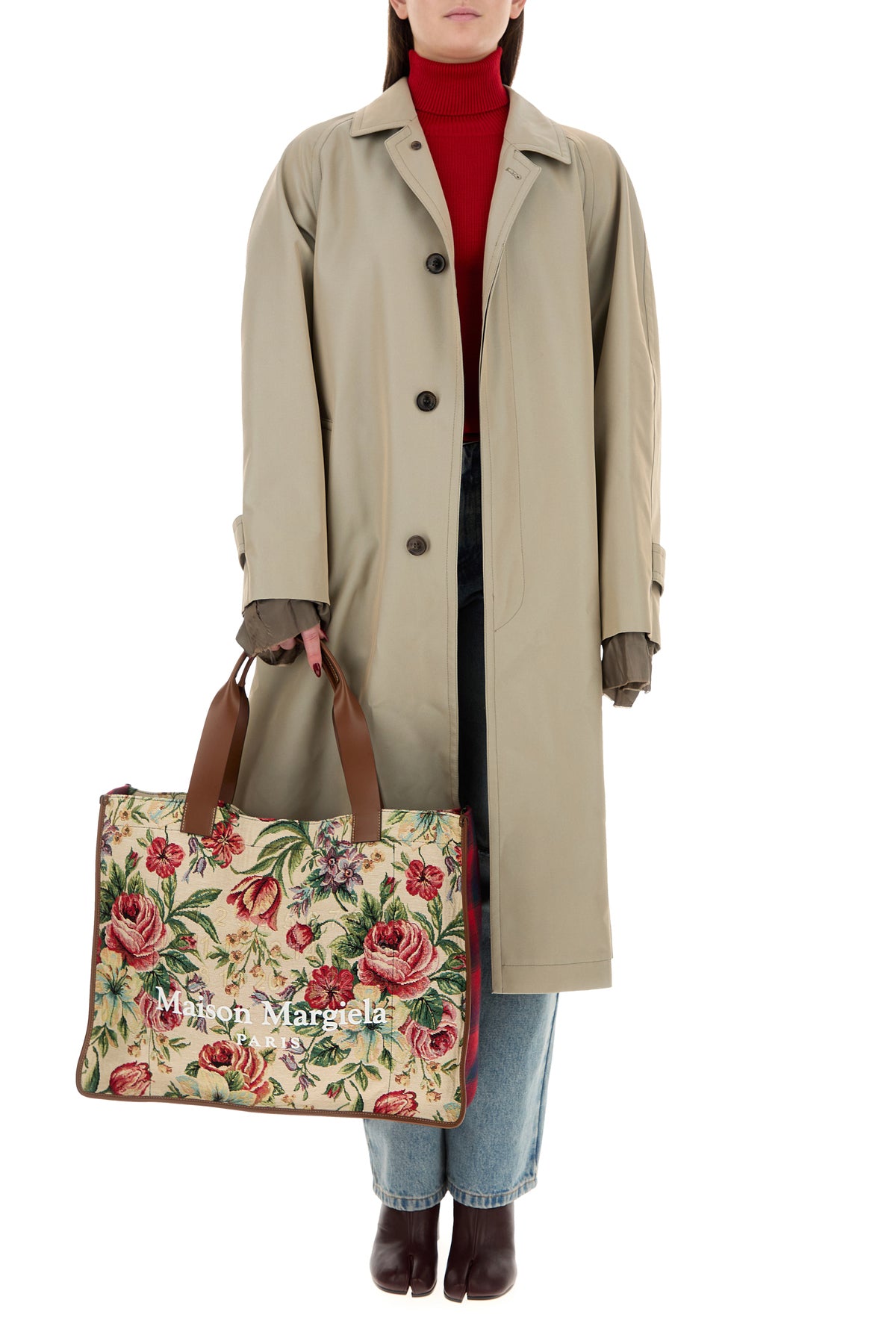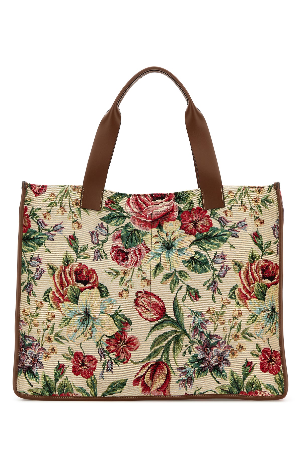 Shopping bag realized in canvas characterized by floral motif embroidery at the front and at the back, tartan motif embroidery on the sides and on the hemline and logo in relief at the front enriched by peculiar label on the side.