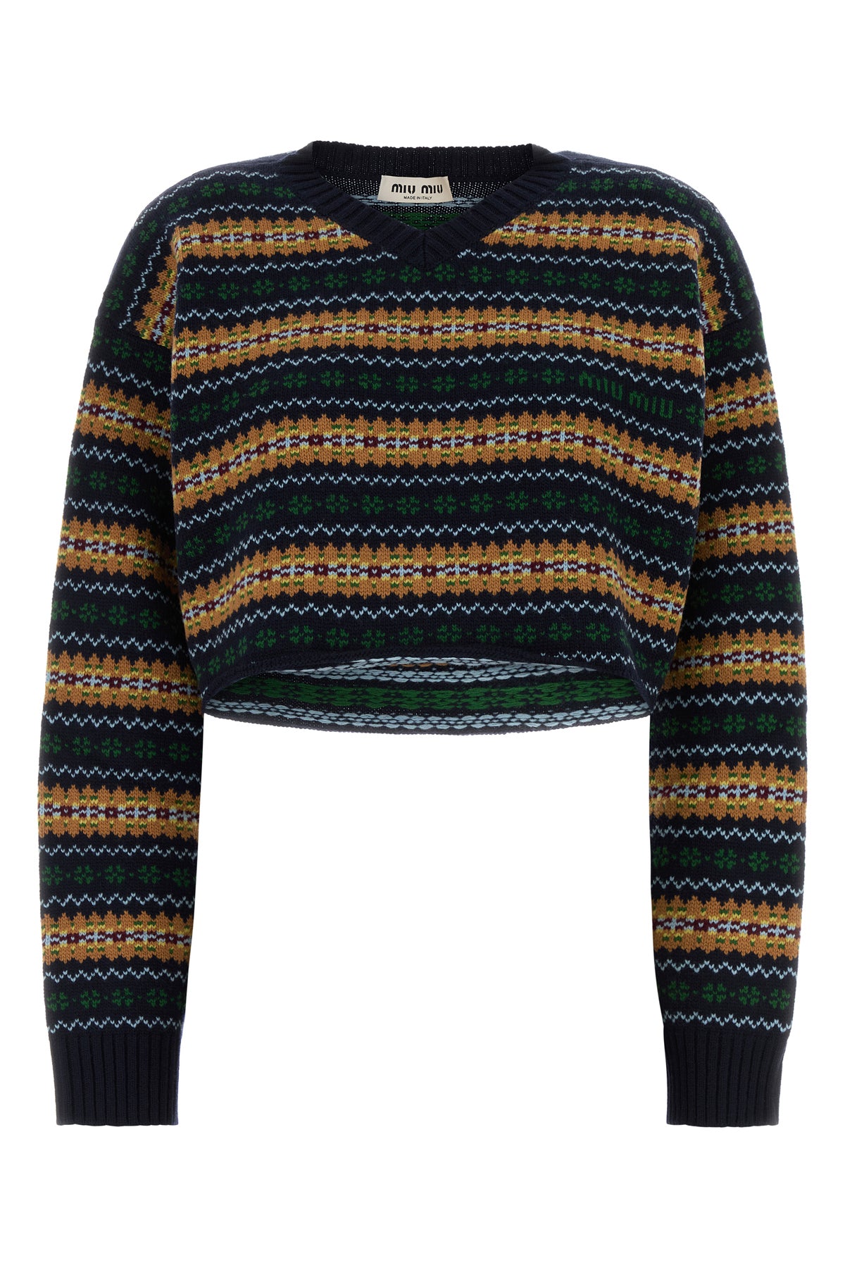 Cropped cut sweater realized in pure virgin wool characterized by peculiar logoed embroidery on the entire surface.