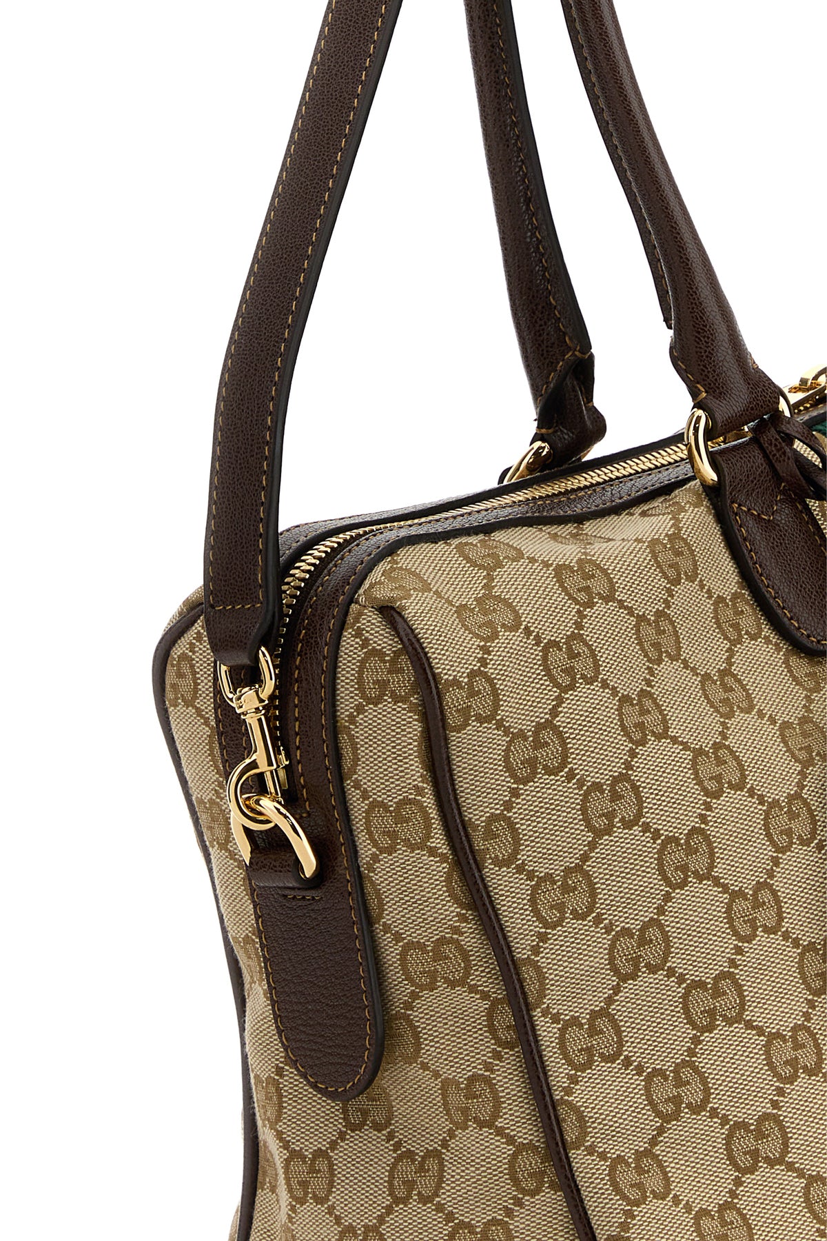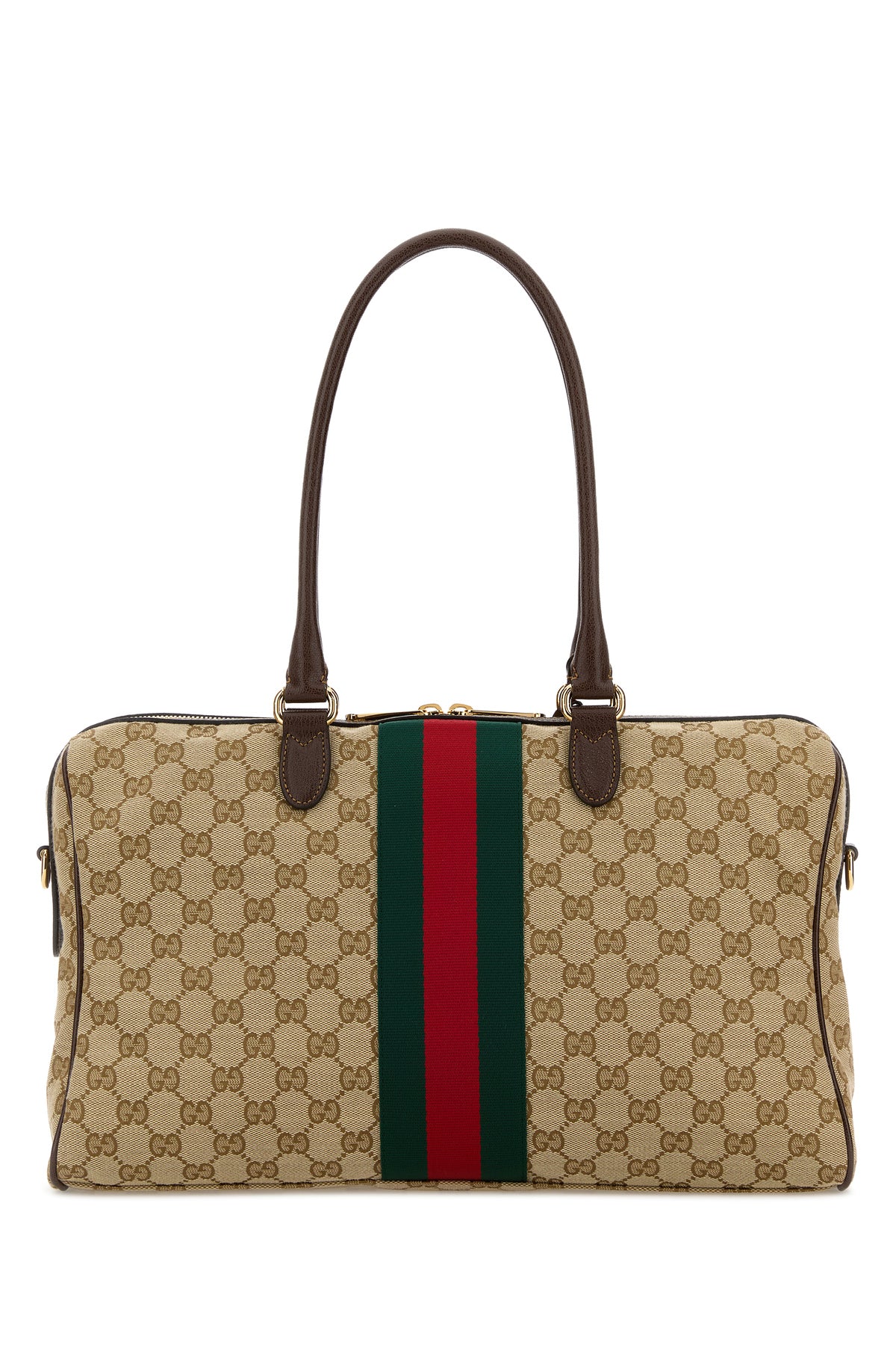 Boston bag realized in GG fabric enriched by Web patch and Horsebit metal detail.