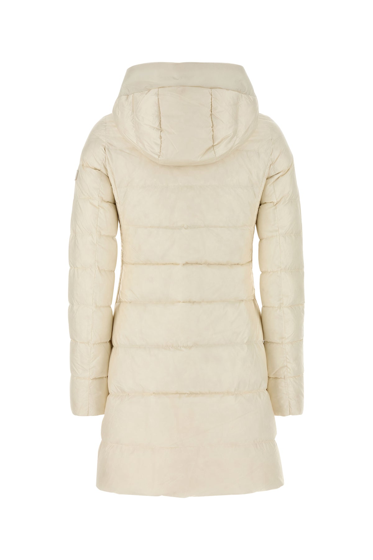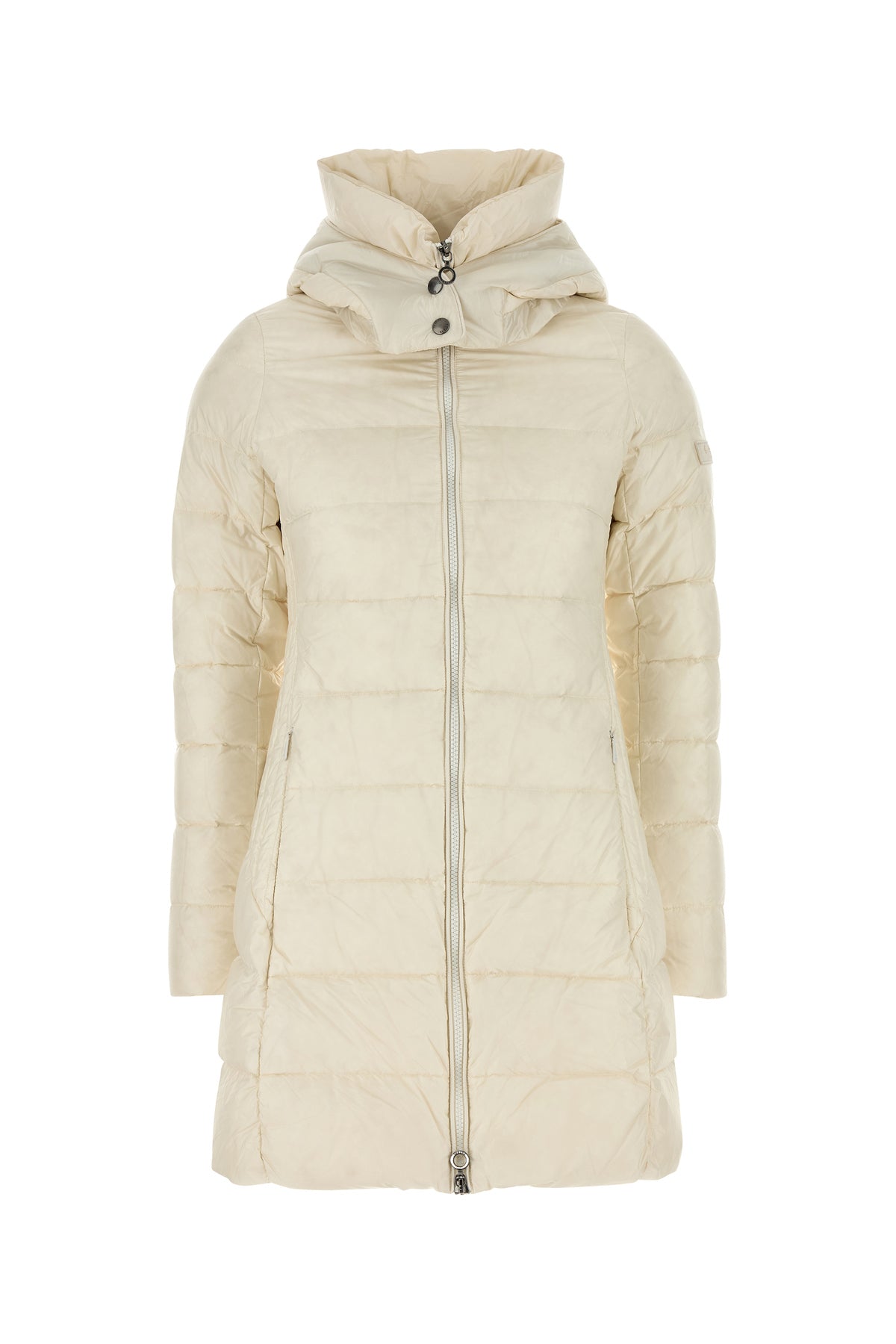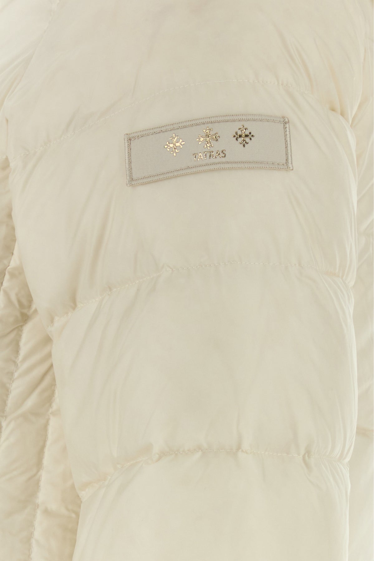 Down jacket realized in quilted nylon enriched by tonal logoed label on the sleeves.