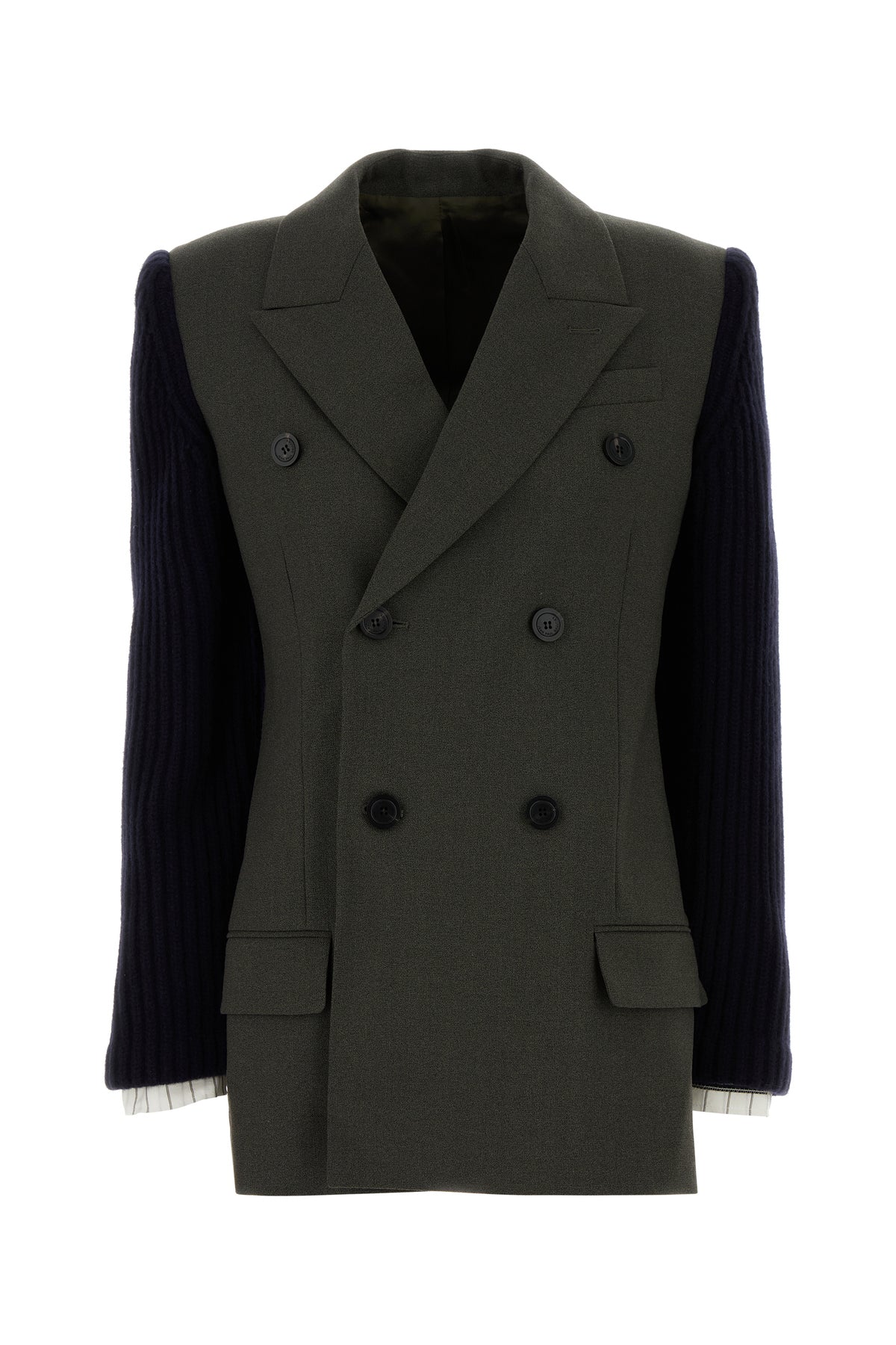 Blazer realized in wool blend with contrasting knit sleeves.