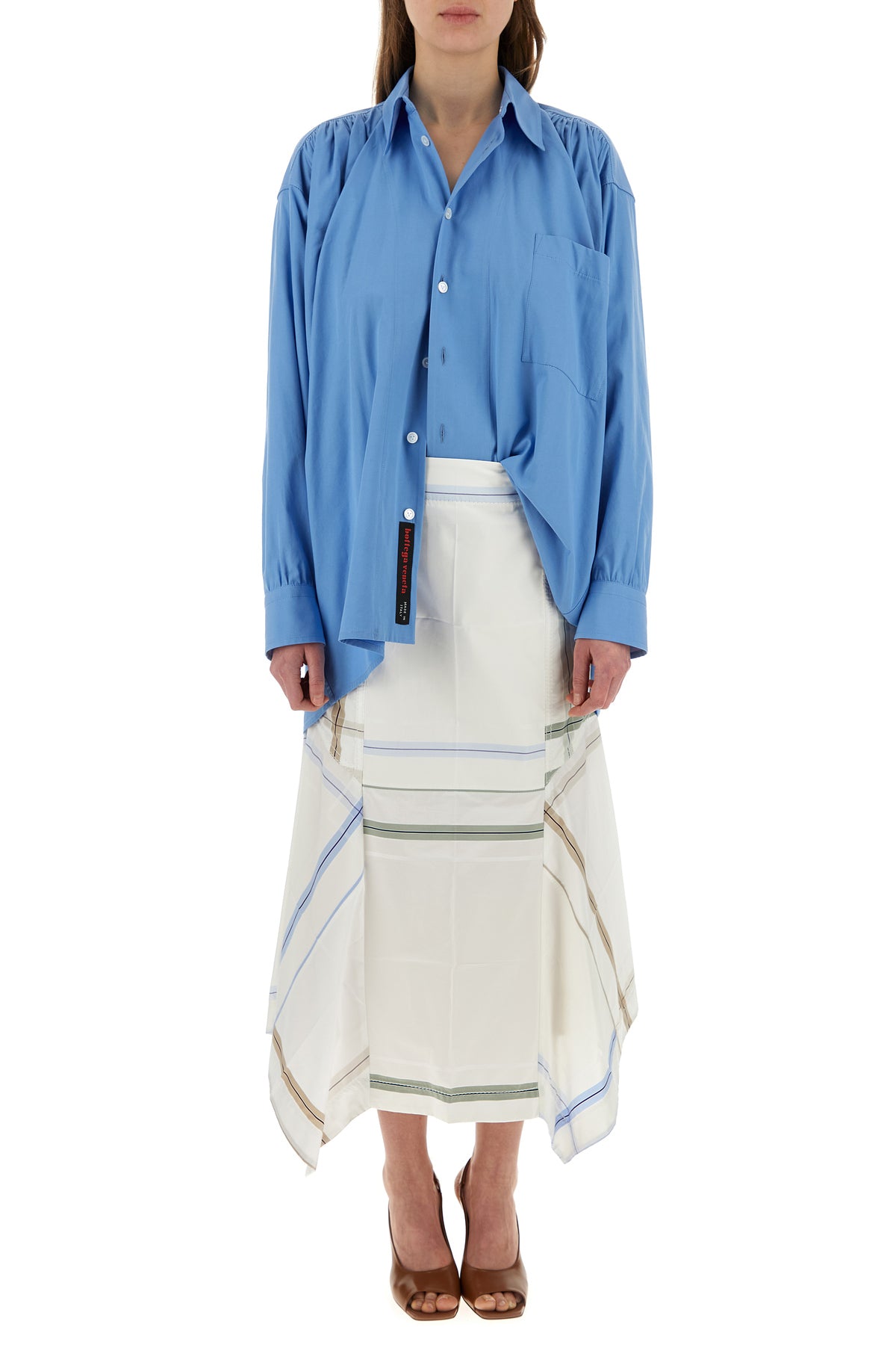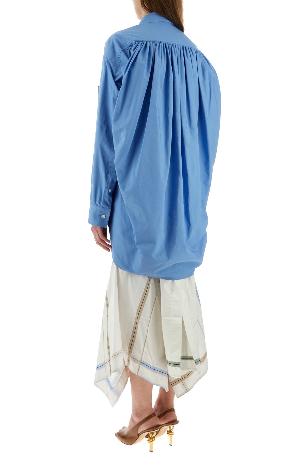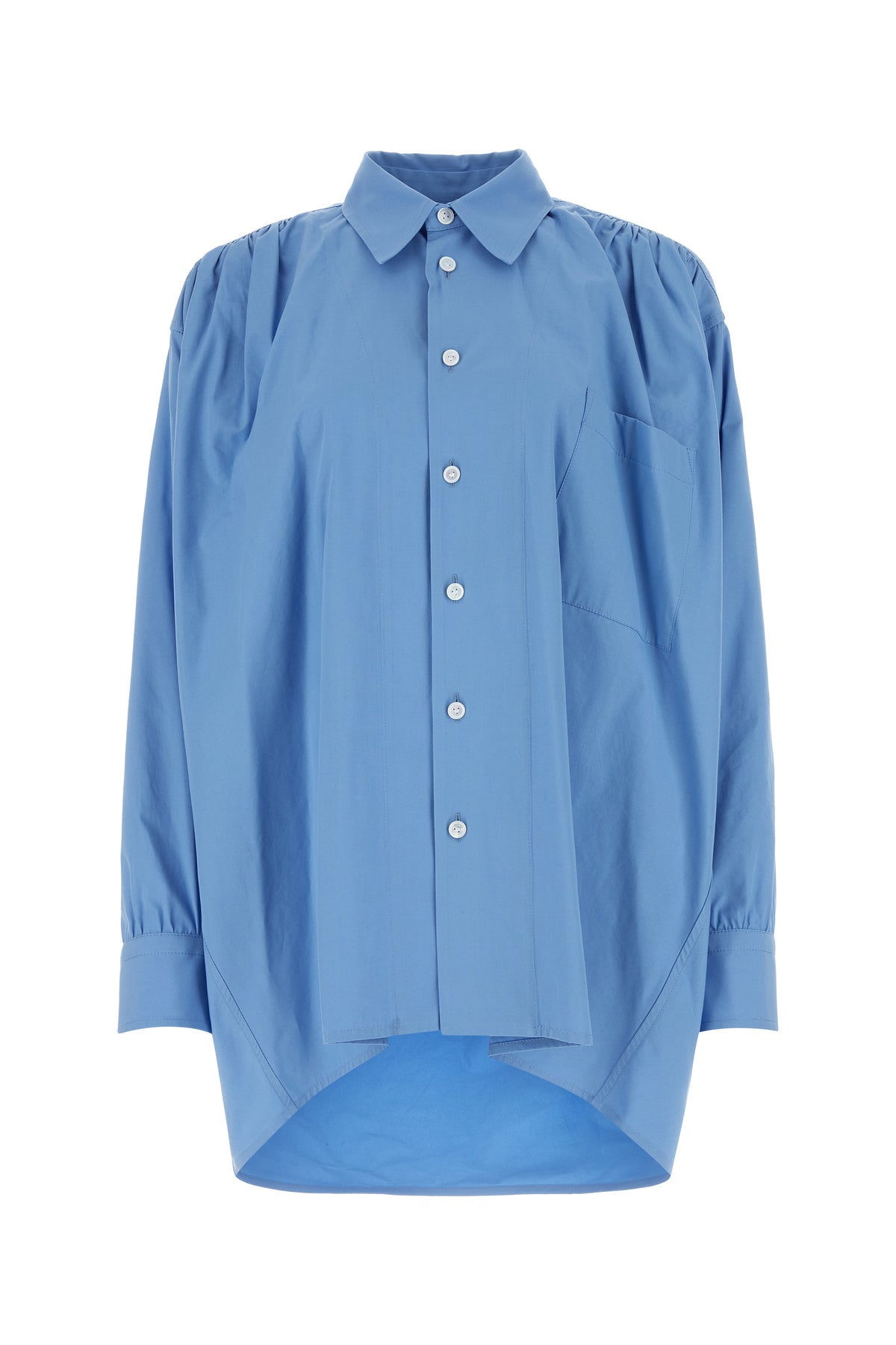 Oversize shirt realized in cotton blend characterized by peculiar gatherings on the shoulders and at tie back.